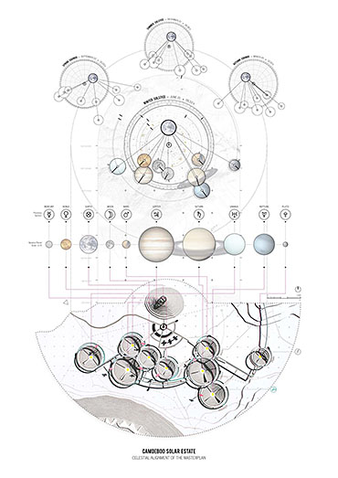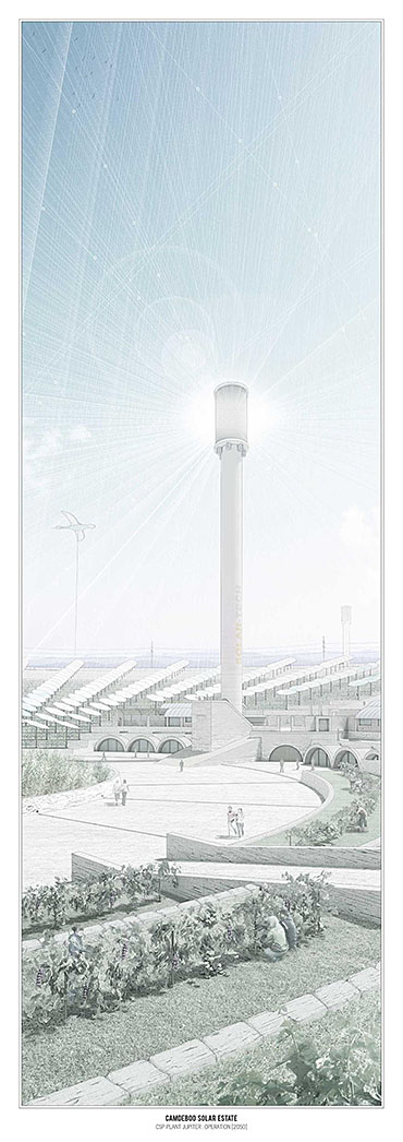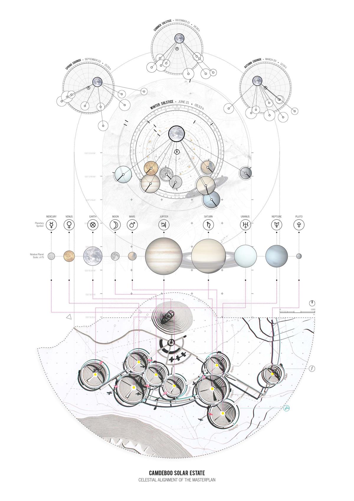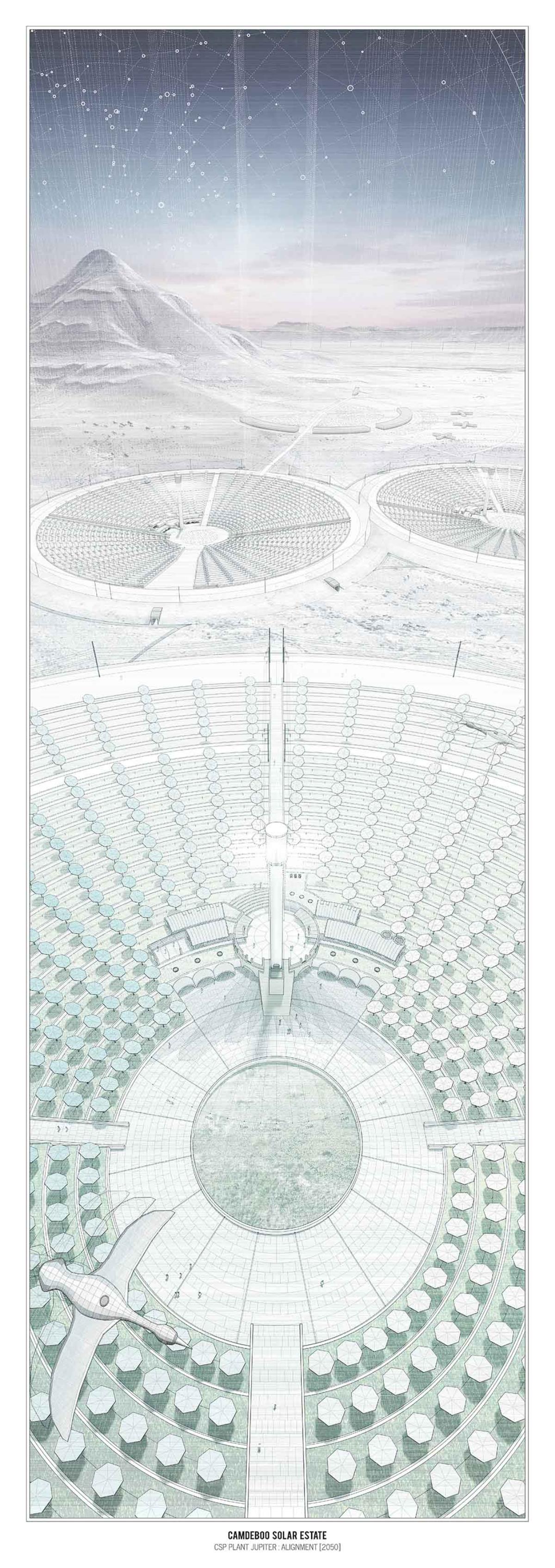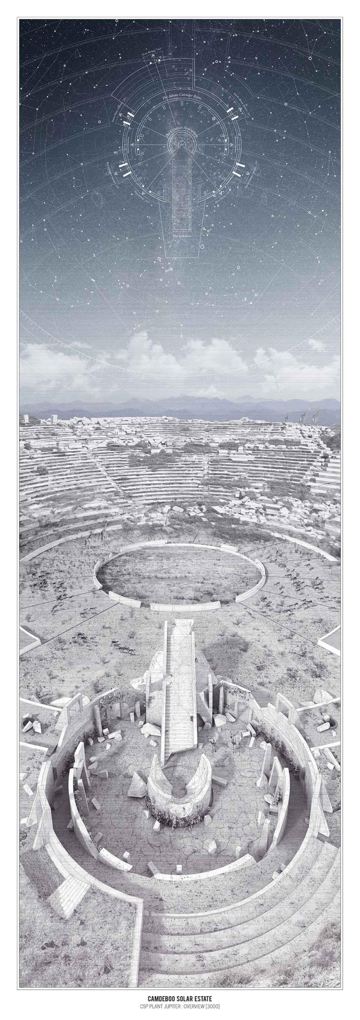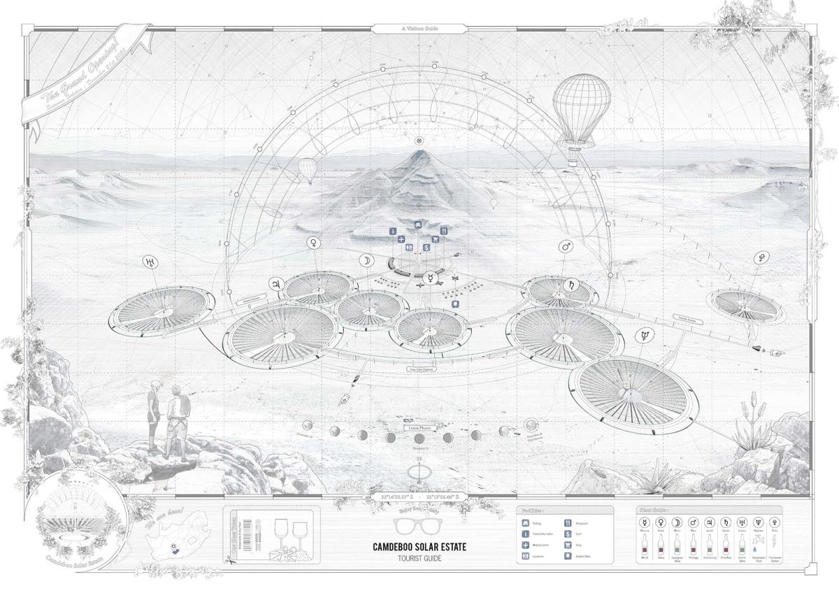 The Camdeboo Solar Estate Part 2 Project 2015 John Cook University of Westminster London | UK In an age of dramatically rising population, diminishing fossil fuel resources and the alarming and all too visible consequences of climate change, the Camdeboo Solar Estate looks to provide an alternative energy strategy and agricultural resource for South Africa’s burgeoning cities and rising energy demands. Located in a remote municipality in the semi-arid environment of the Camdeboo, its array of CSP plants are hybridised with the long practiced technique of terraced farming to enable a bountiful and economically prosperous wine industry. The masterplan arrangement, its axial pathways and internal orientations are calibrated to the positions of the celestial objects within our solar system at the time of opening, 2050. The proposal embeds a new economy of solar tourism within the region, where agriculture, energy production and celestial movements become entwined and experienced as a new form of urban / territorial restructuring at both landscape and building scale. Tutor(s) Roberto Bottazzi Lindsay Bremner