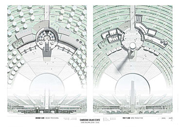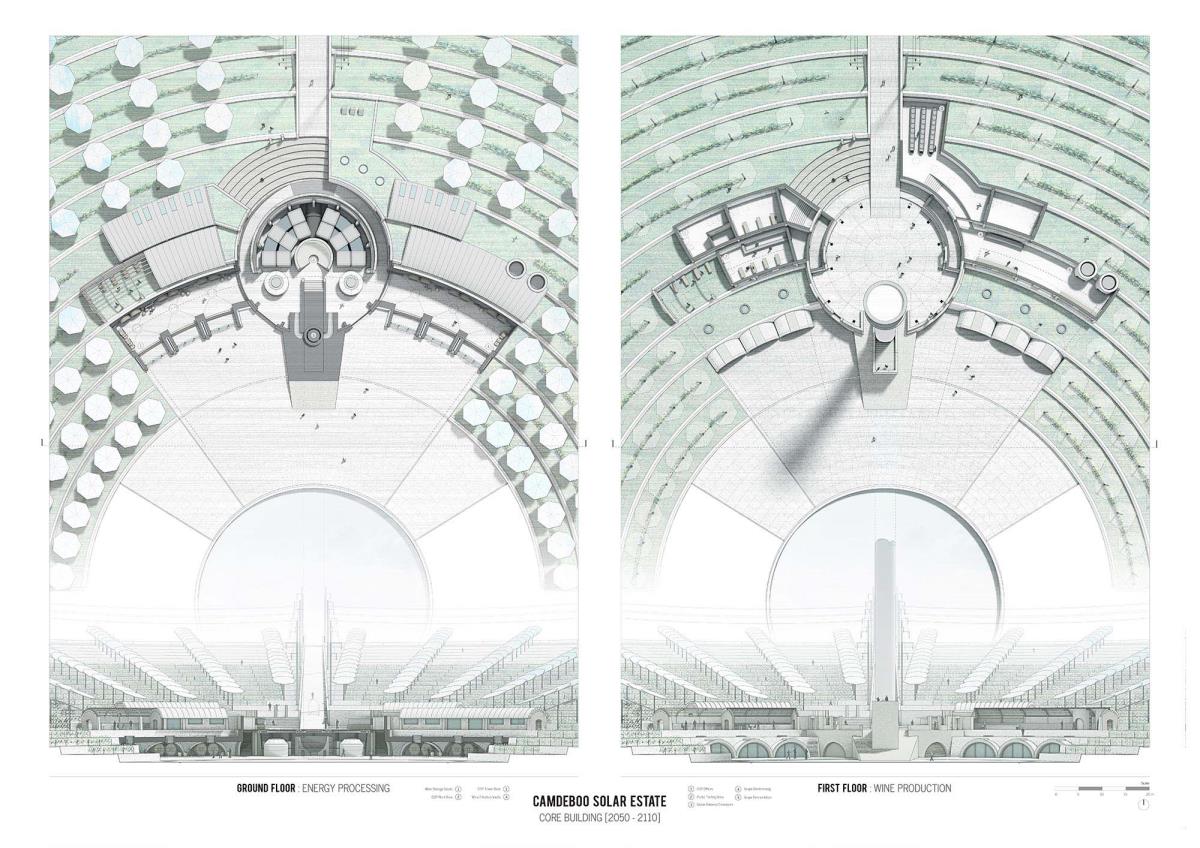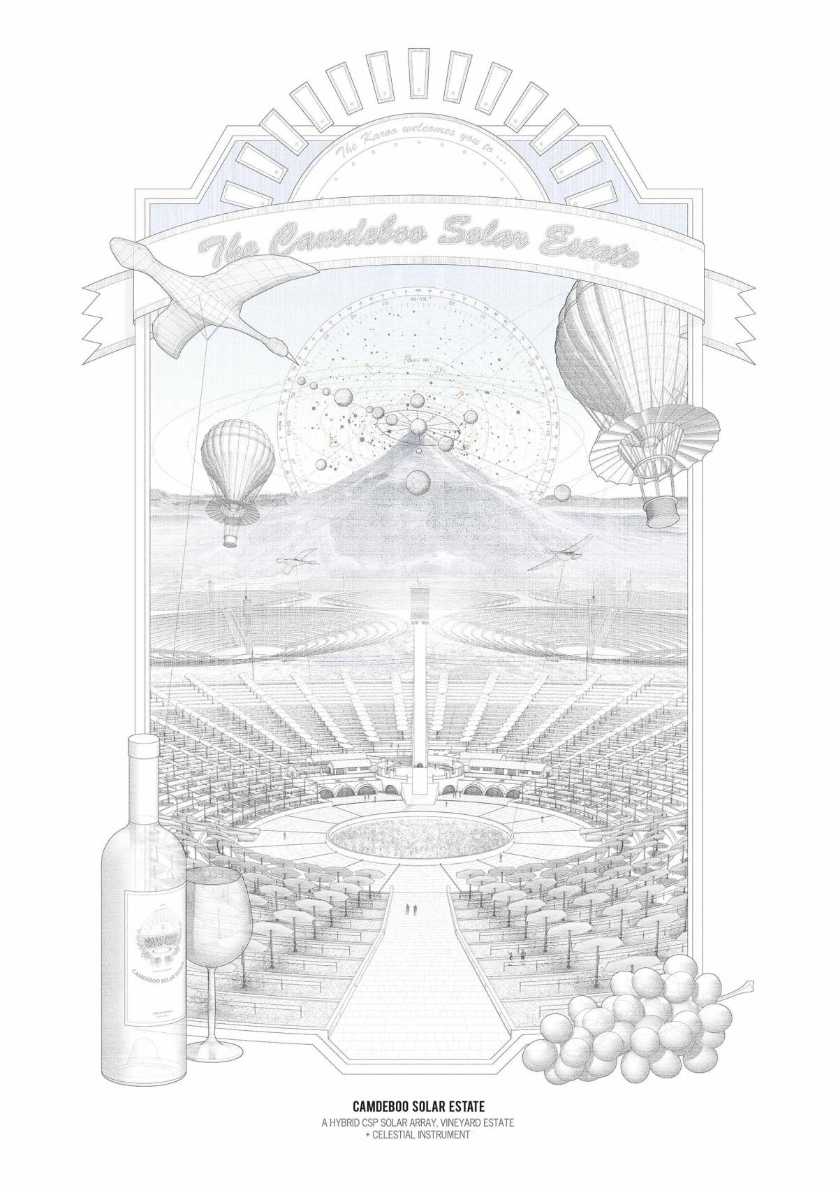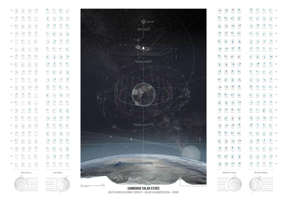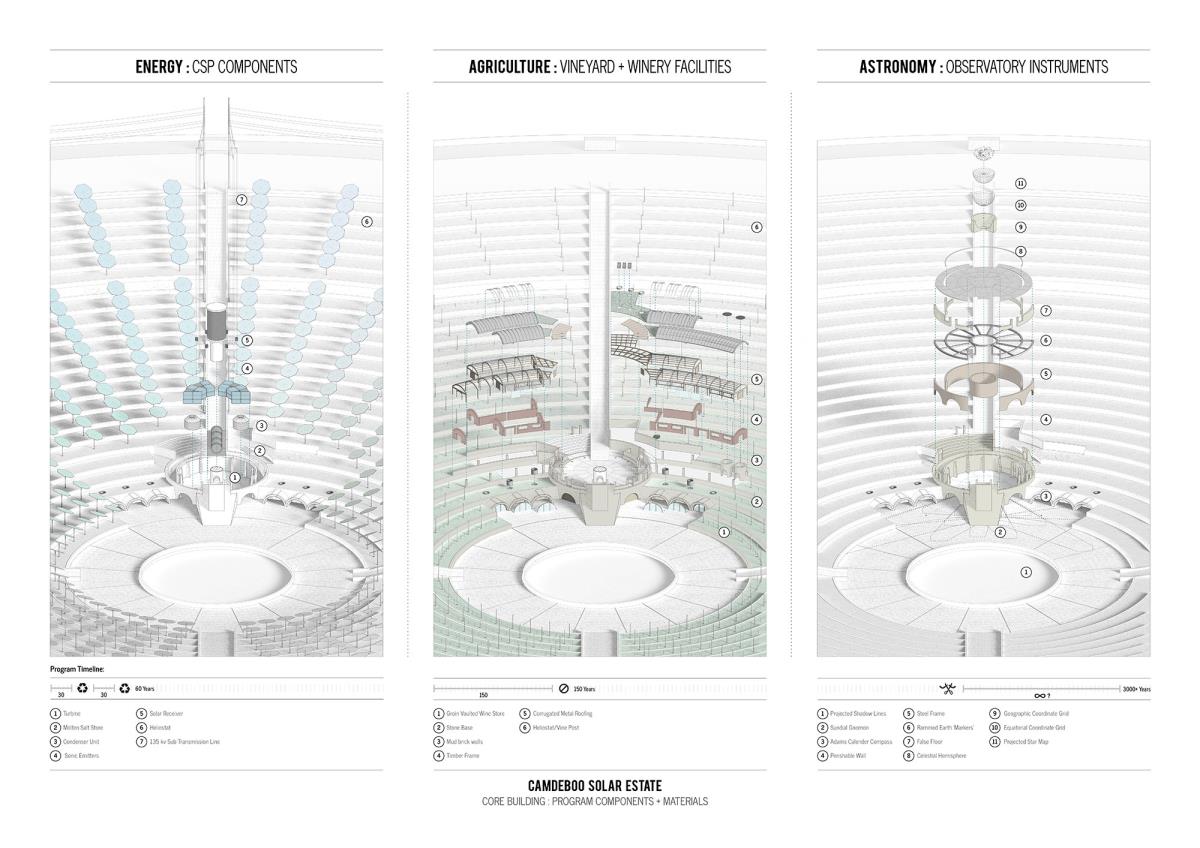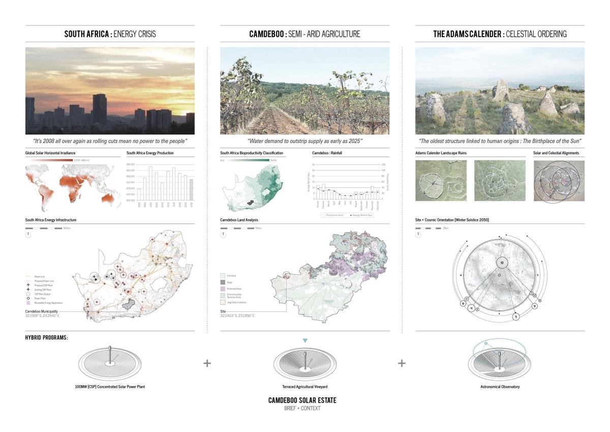 The Camdeboo Solar Estate Part 2 Project 2015 John Cook University of Westminster London | UK In an age of dramatically rising population, diminishing fossil fuel resources and the alarming and all too visible consequences of climate change, the Camdeboo Solar Estate looks to provide an alternative energy strategy and agricultural resource for South Africa’s burgeoning cities and rising energy demands. Located in a remote municipality in the semi-arid environment of the Camdeboo, its array of CSP plants are hybridised with the long practiced technique of terraced farming to enable a bountiful and economically prosperous wine industry. The masterplan arrangement, its axial pathways and internal orientations are calibrated to the positions of the celestial objects within our solar system at the time of opening, 2050. The proposal embeds a new economy of solar tourism within the region, where agriculture, energy production and celestial movements become entwined and experienced as a new form of urban / territorial restructuring at both landscape and building scale. Tutor(s) Roberto Bottazzi Lindsay Bremner