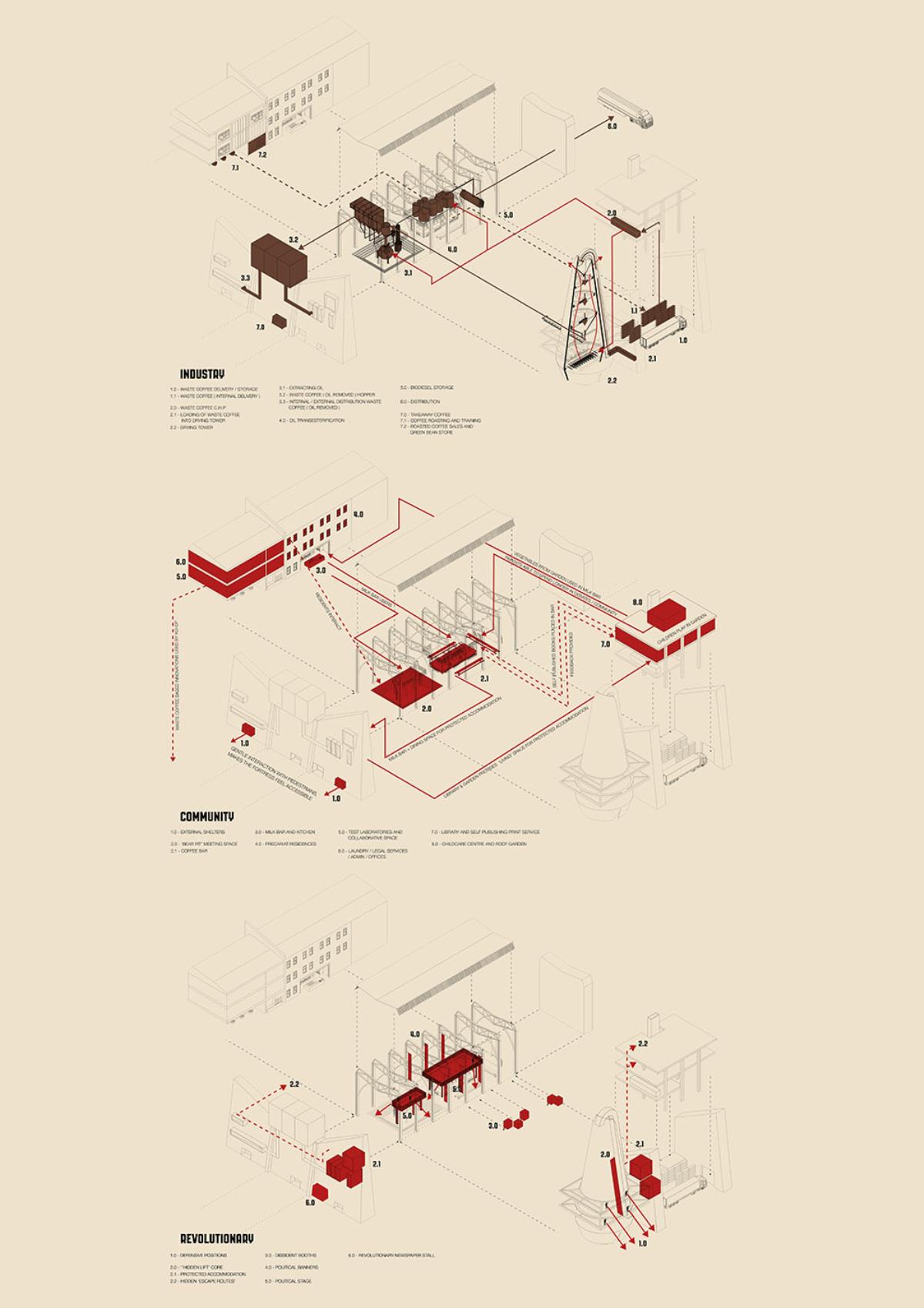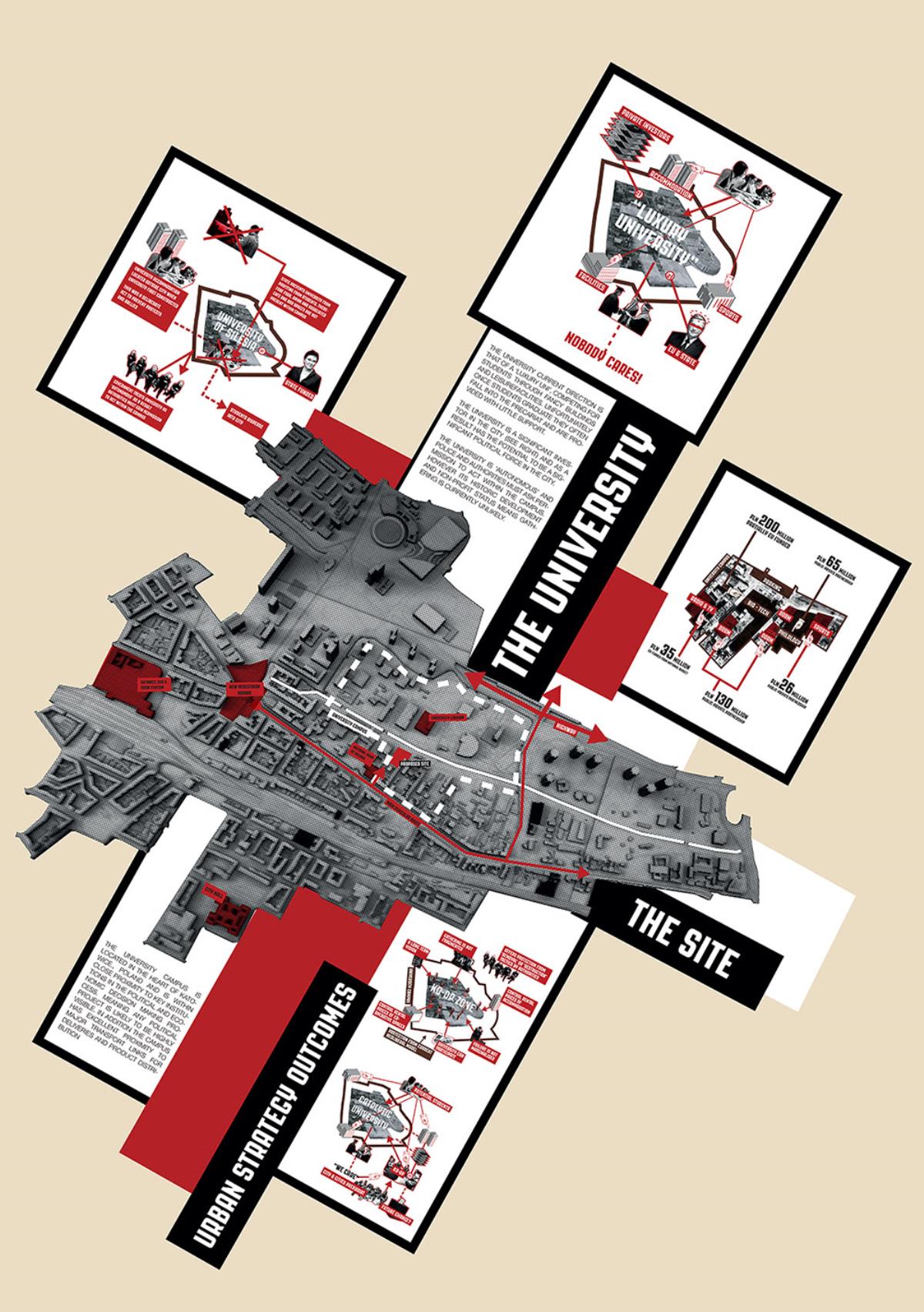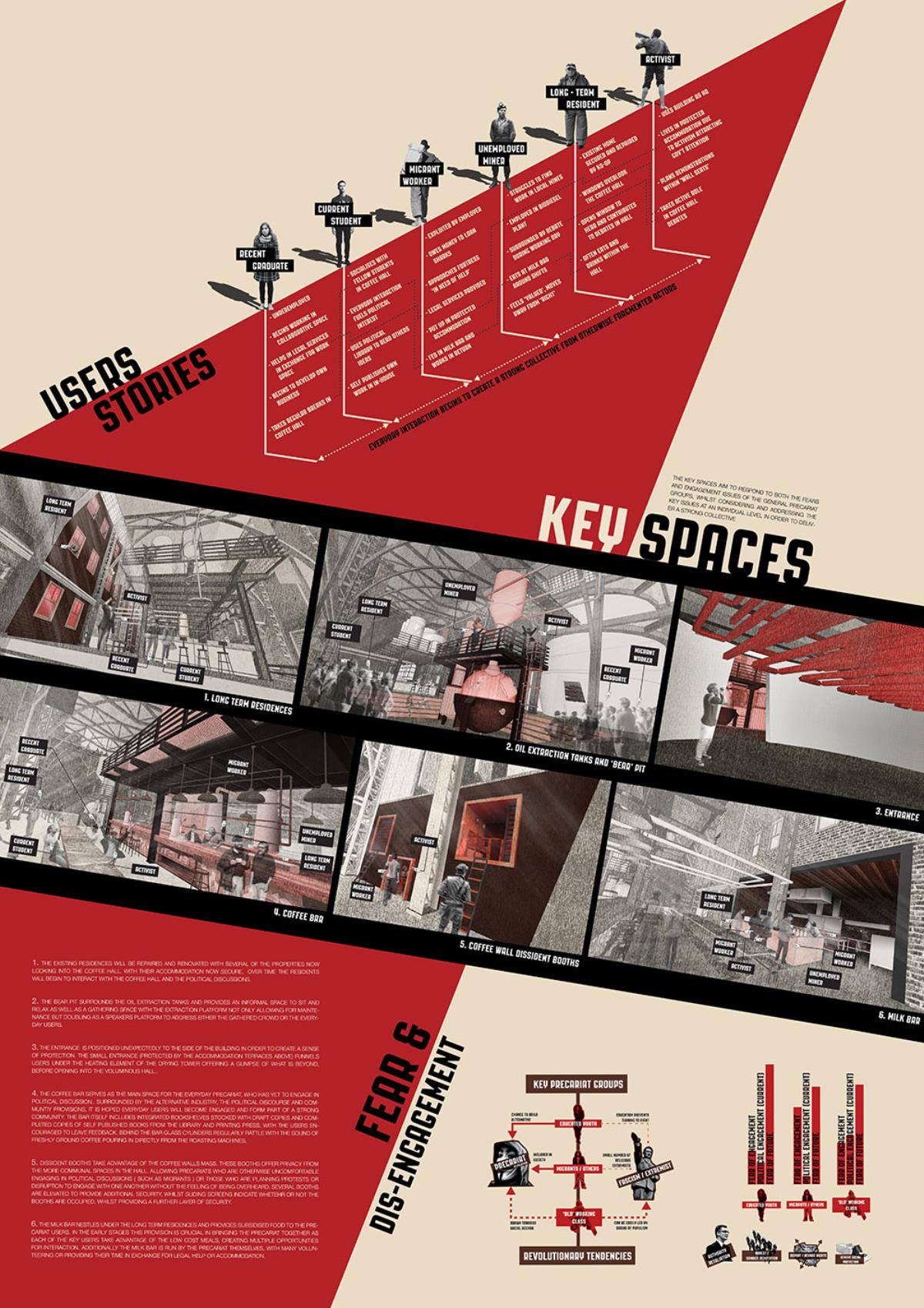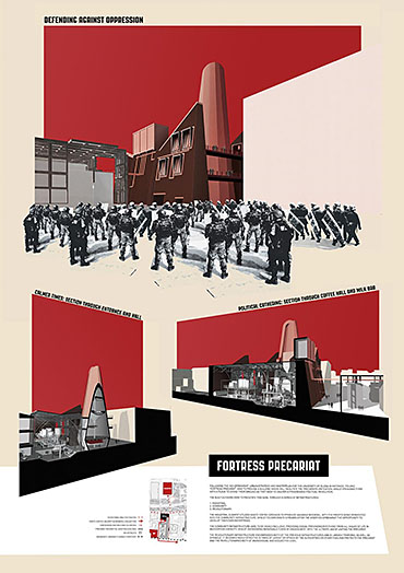 Fortress Precariat Part 2 Project 2015 Andrew Hills University of Plymouth | UK Based primarily in the city of Katowice, southwest Poland, The University of Silesia is one of the largest higher education institutions in Europe and has outlined plans for a 300mil¬lion zloty (£60m) investment program. Unfortunately despite misgivings from both students and staff the plans produce the prospect of another homogeneous ed¬ucational institution, whose sole role is producing ‘improved human capital’ for the ruthless neoliberal labour market. Poland recently surpassed Spain as the European leader in fixed term (temporary) con-tracts. Making ends meet through a seemingly endless round of unstable, poor paying, and low satisfaction ‘junk jobs’ is becoming an increasingly common experience for a generation of educated young poles. Theorist Guy Standing has termed those who suffer this reality ‘The Precariat’. ‘Fortress precariat’ serves as polemic against the current plans and aims to highlight the potential of the University and its precariat graduates to deliver a progressive political revolution. To achieve this the project exploits the campuses ‘legal’ protection from unauthorised authoritarian intervention and capitalises on the universities position as a powerful economic and political institution, whilst simultaneously delivering a series of infrastructures designed to effectively support each stage of the precariat revolution. Tutor(s) Dr. Krzysztof Nawratek