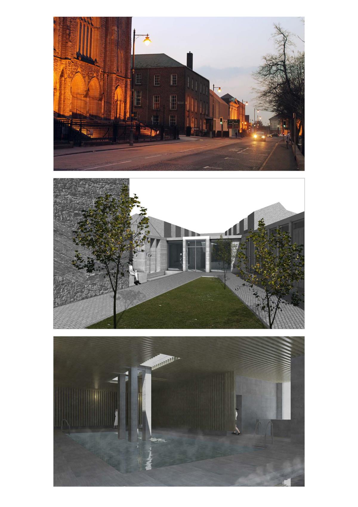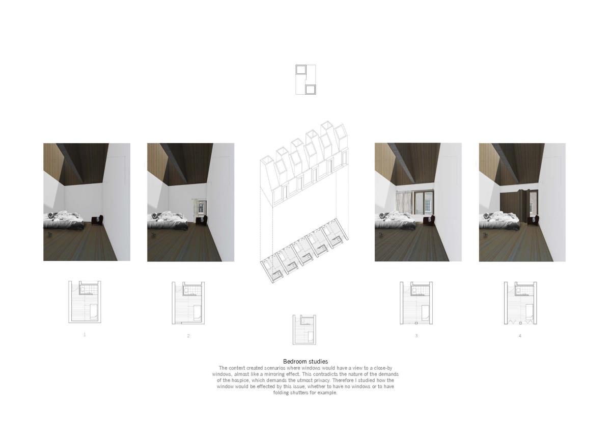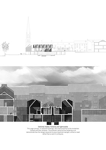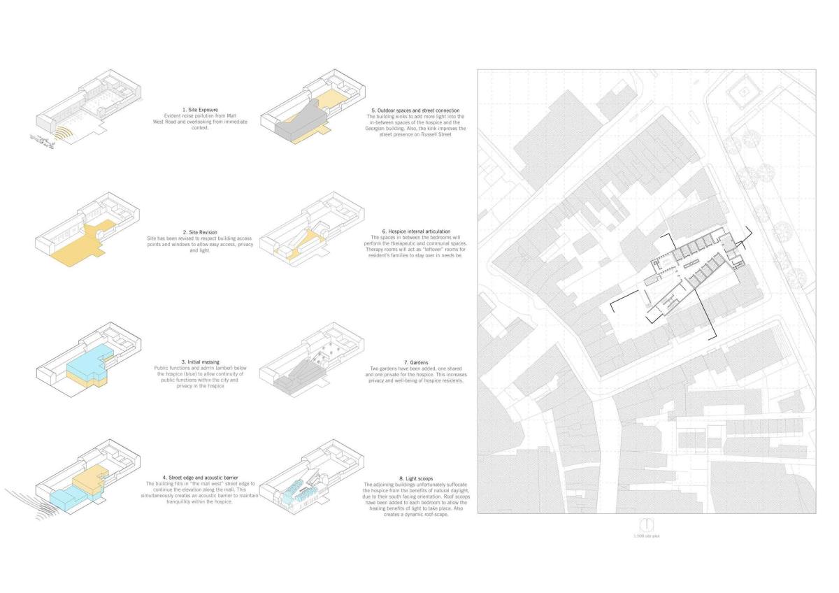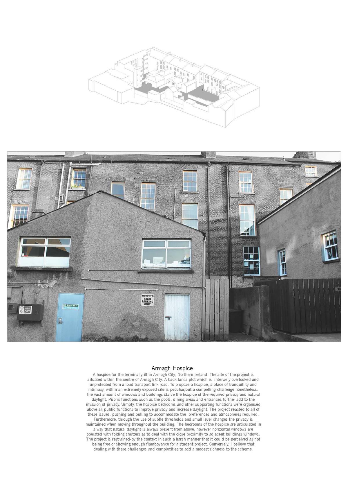 Armagh Hospice Part 1 Project 2015 Niall Quinn Queen's University Belfast | UK The project is a hospice for the terminally ill in Armagh City. The site is a backlands plot, an informal courtyard to a Georgian masonry, stone and stucco city block. By its nature, the backlands plot is intensely overlooked by the individual buildings of the block. The returns of the perimeter buildings were developed in a non-harmonious way, the lack of rapport lead to a free-for-all of new extensions and fenestrations. To propose a hospice, a place of intimacy and intended tranquility, in this site is a flawed scheme to begin with but it is a curious challenge. The height and various windows of the context starve the hospice of the required daylight and privacy. Public functions such as the therapeutic pools, dining areas and entrances further invade the privacy. The programme is organised so that all intensely private areas are on the upper levels. The bedrooms of the hospice are articulated in such a way that direct and indirect light is always present from above. However, horizontal windows are operated by folding shutters to deal with the privacy issues. The project was restrained by the context that it pushed and pulled to accommodate the preferences. Tutor(s) Conor Sreenan