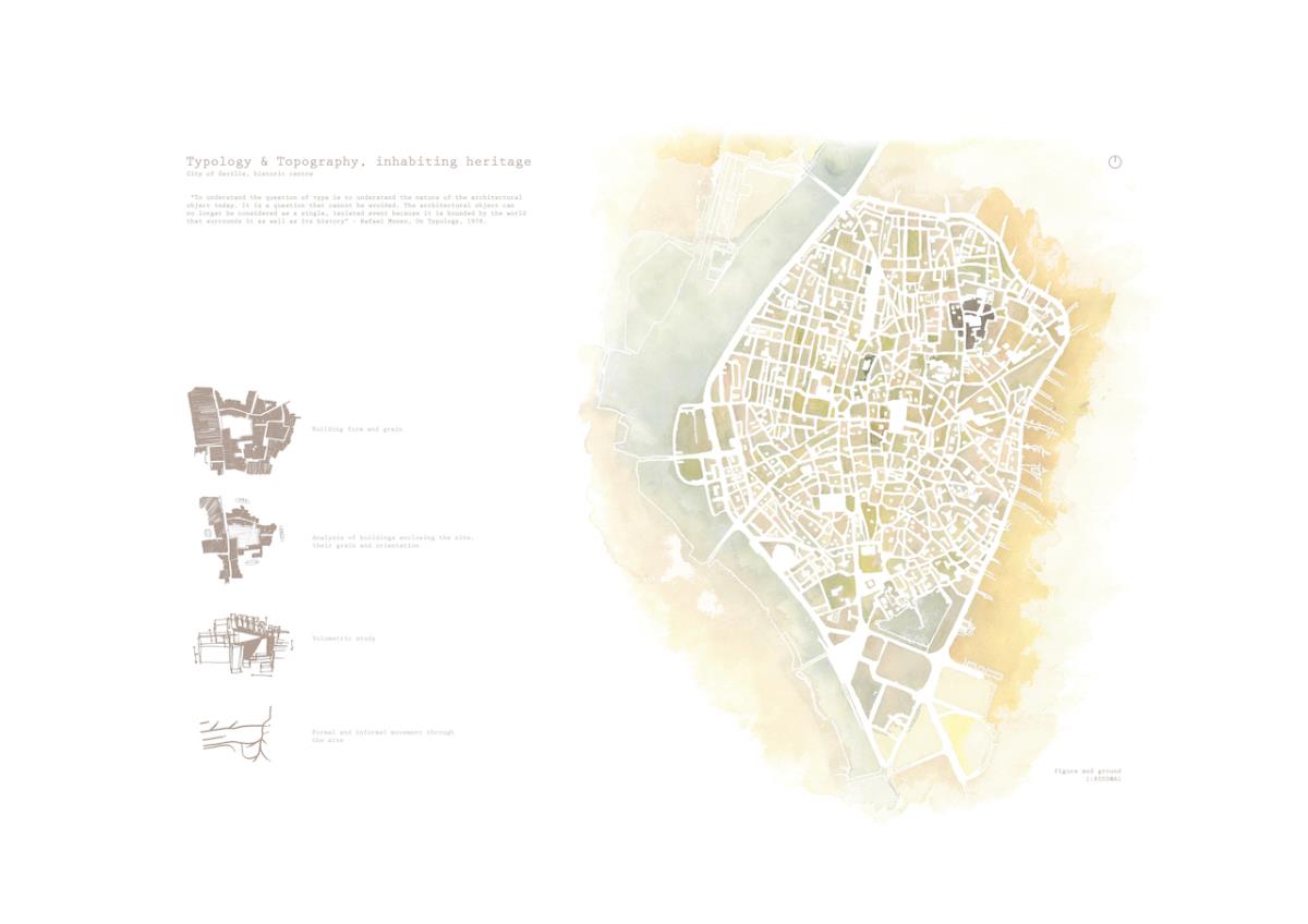 Typology & Topography, inhabiting heritage Part 1 Project 2015 Jieun Jun Kingston University Kingston | UK When a new culture is embraced, it is contorted to accommodate the newcomer and can be involuntarily distorted by individuals. It is not improbable that man is absorbed into that new culture, one that sounds especially familiar as one learns something new, something that swings one's roots of their integral values. Sevillian architecture is no stranger in the eyes of an Asian of wonder. Sevillian culture has been acquired naturally during this project's journey by seeing, drawing and touching it directly, then merging and bridging the cultural gaps between intentional architectural knowledge learned studying in the UK and Western Europe and unintentional knowledge from Korea. Contradictorily, Seville is a city of physical emptiness in dense city matrix, created by narrow alleys and voids full of intended life by local residents as time goes on. The project developed from a discovery of spatial coexistence of empty spaces in Seville that have been abandoned, and now remain that way on purpose. Typology studies on Sevillian, Japanese, and Korean architectural elements spark the remembrance of my latent architectural interests; the "corral" and a trail in an ancient Asian palace, the "patio" and an inner courtyard of an Asian old house. Tutor(s) Bruno Silvestre Noel Cash