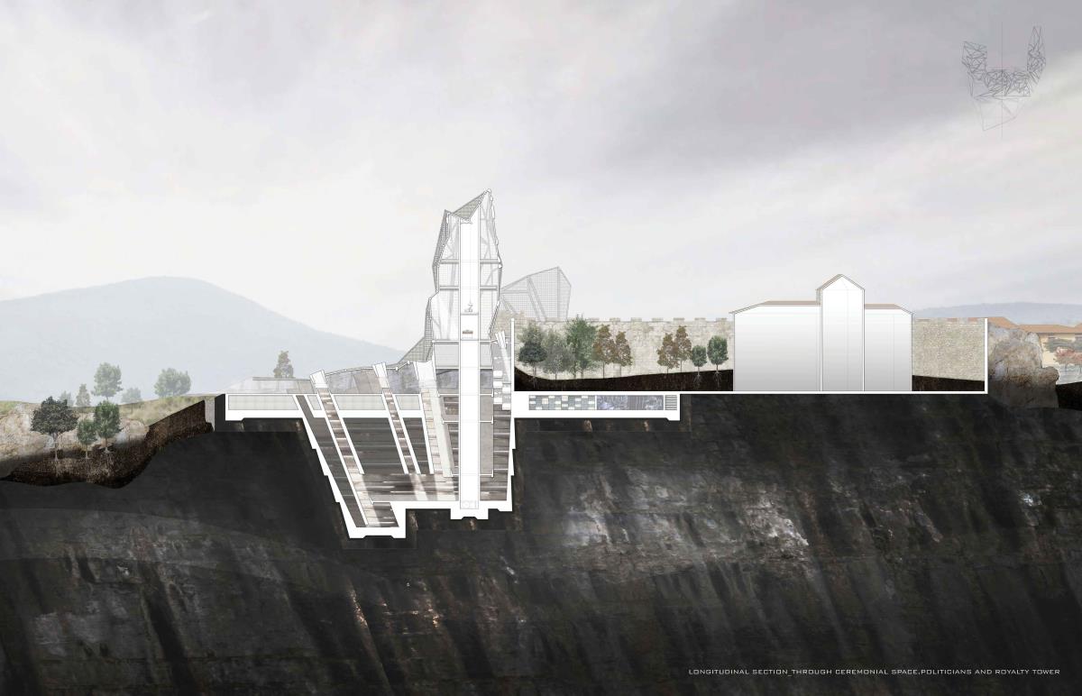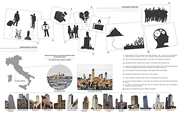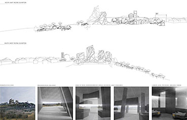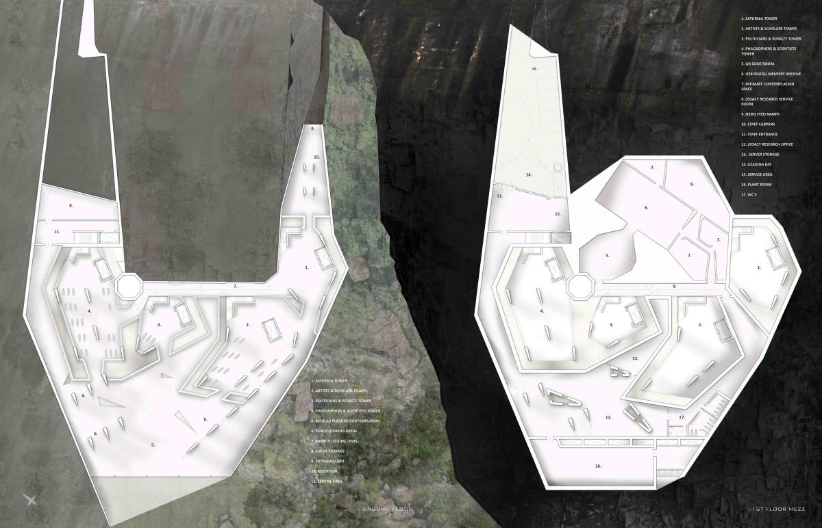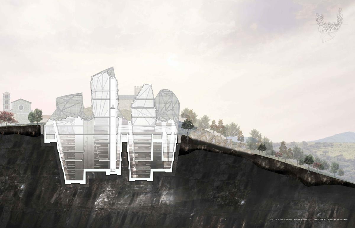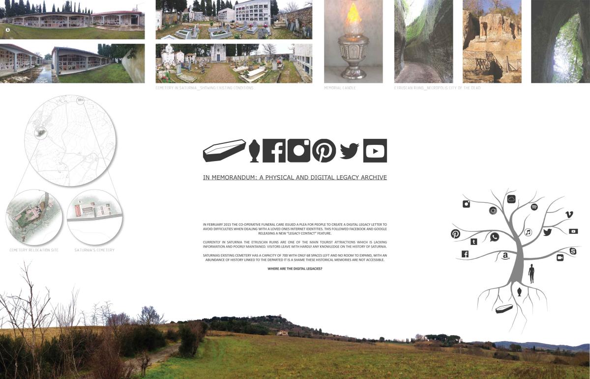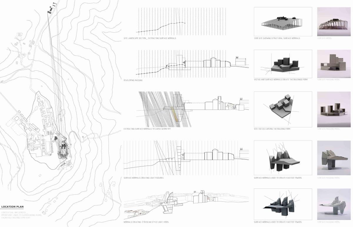 In Memorandum: A physical and digital legacy archive Part 2 Project 2015 Bethany Brown London South Bank University | UK Today all actions can be traced by digital footprint. In an era of online presence and diminishing horizontal space 'In Memorandum: a Physical and Digital Legacy Archive' addresses the future of the past.The location is the geothermally active Tuscan hill top town of Saturnia. With a population of only 280, hot springs and Etruscan ruins are the main tourist draw. Saturnia’s history is hidden: occupied by the Pelasgi, settled by Etruscans, conquered by the Romans and plagued by family feuds. The Roman Via Clodia’s partial remains hug the iconic hilltop fortress, passing through a Roman arch where processions to the Etruscan necropolis took place.The Archive, created as an extension of the landscape, consists of four upper and lower towers, celebrating Saturnia’s relocated cemetery and important European figures. The secular contemplation space, enveloped by its landscapes, is pierced with light fissures to create atmosphere at all levels encountered. Digital archives are accessible throughout the building to eulogize the past. Crafted by landscape surface normals, shafts of light illuminate the lower towers which are suspended for visitors to walk beneath while accessing the archives. Upper towers are lit by small apertures in memory of those who dwell within the building. Tutor(s) Alexander Graef