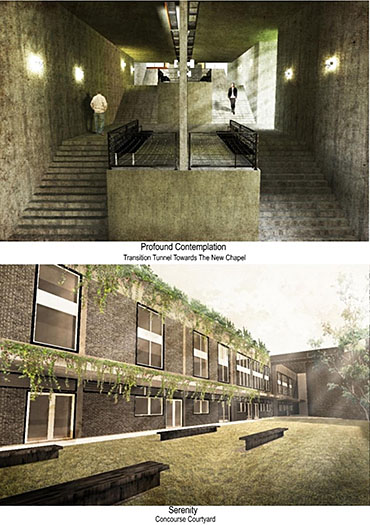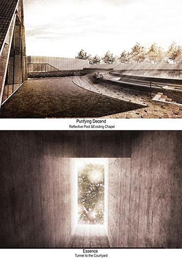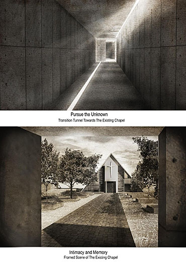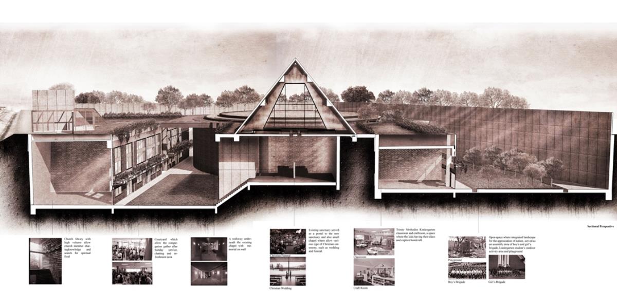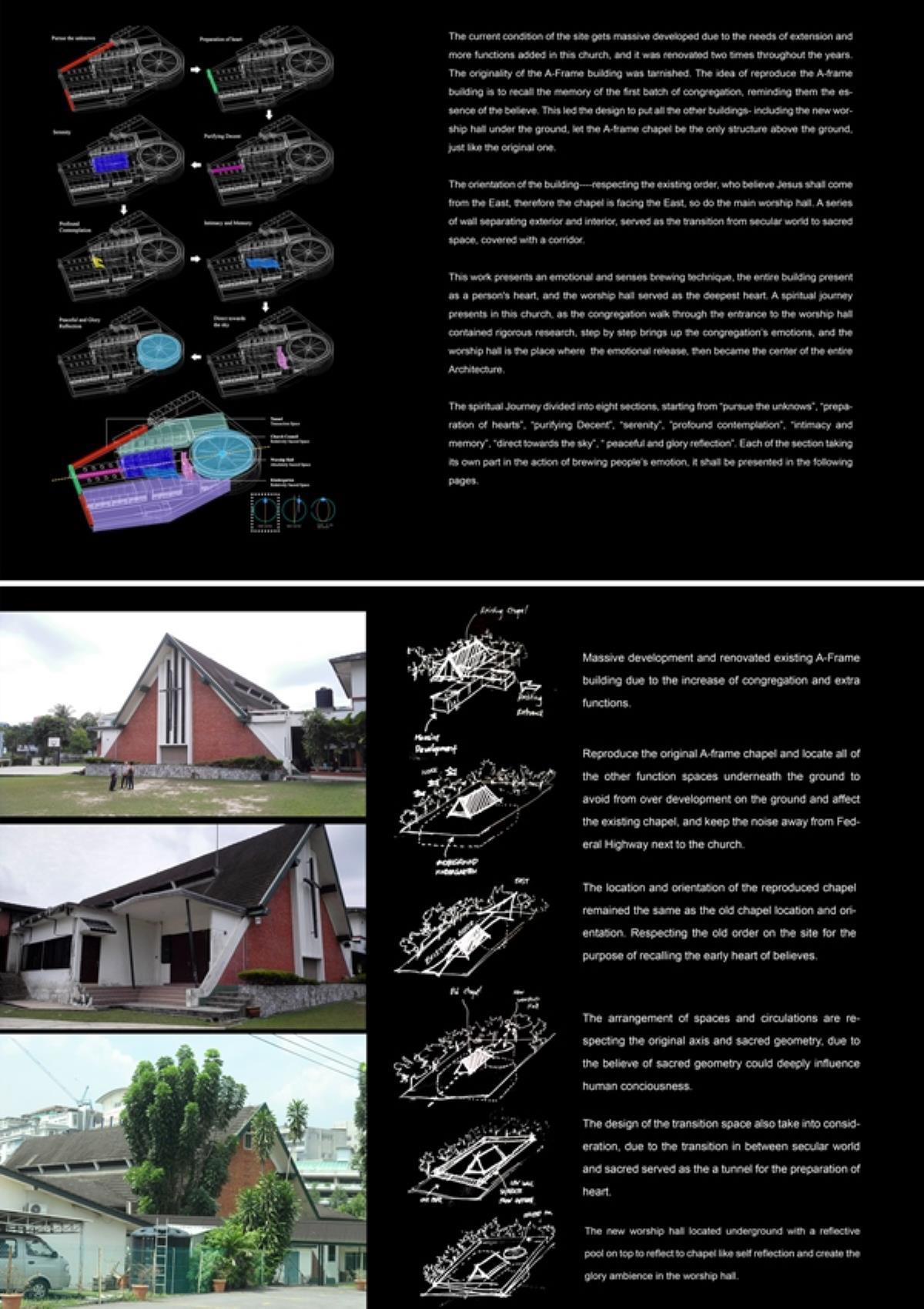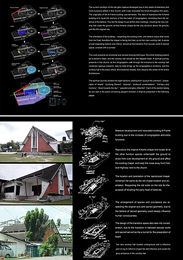 Heaven is Earth Part 2 Project 2015 Boon Keong Ong University of Malaya | Malaysia This sanctuary is located at the border of Petaling Jaya, Malaysia, sitting next to federal highway which linked to Malaysia capital city Kuala Lumpur. It served as the first A-frame building and Christian church in this area, since Rev. J. Harry Haines and Mr. Khoo Oon Soon brought in the first Christian community into the town in 1955. With the passage of time, Petaling Jaya has grown from a small town to a city and many of the congregation has moved out. However, they insists to come back for the worship on every Sunday, even if they have to travel in long distance. It certainly led me to think and explore the spiritual connection in between people and a “fixed object on the ground”. To the congregation, there are nothing more than their belief leads them to create a spiritual connection with the church. However, this spiritual connection was built by "encounters". As encounter only refer to some experiences which happened uncontrollable and escapes from the shackles of time and space, it can be related to love, memory, sacredness and sometimes even horror; which is able to produce a certain degree of impact to our conscious and subconsciously built a spiritual connectivity.Located in the complex environment, this building typology is undoubtedly having some conflicts with the surrounding environment. But it also reflects the contradictions of present days where we living in a complex world. This project is to challenge the traditional thinking of the relationship and the consciously distance between heaven and earth (sacred and secular space), taking “encounter” as a medium, it is intended to reinterpret spiritual values of a church, and find out the resonate in between these values and human consciousness. A series of journey in a narrative which has been introduced into the journey to the new sanctuary, each of the transition space have been endowed a unique “encounter experience”, sequential experience or individually experience for each of the space might lead to different realization.Instead of creating a sensory space, it is more on the realization through the “encounter” journey. Tutor(s) Naziaty Mohd Yaakob
