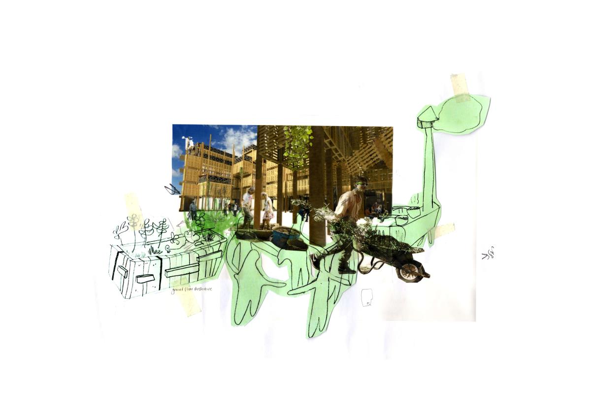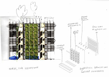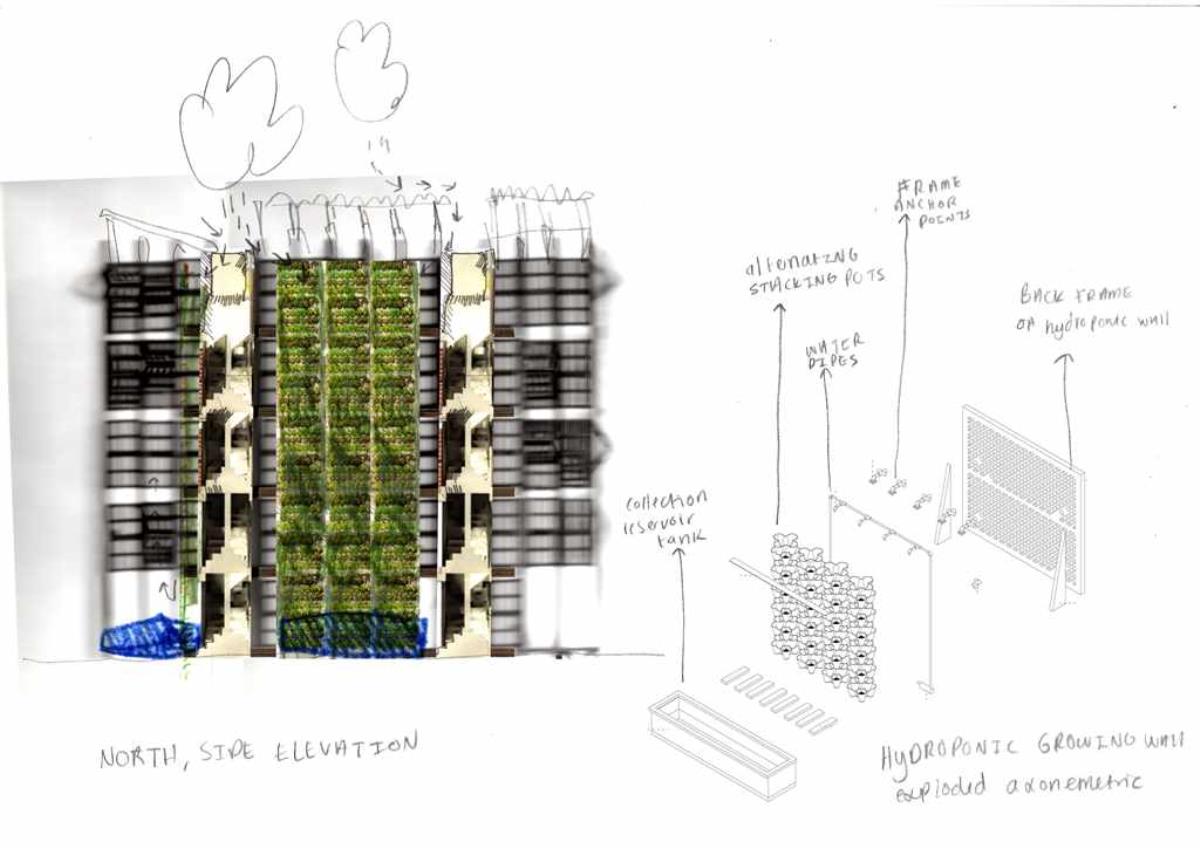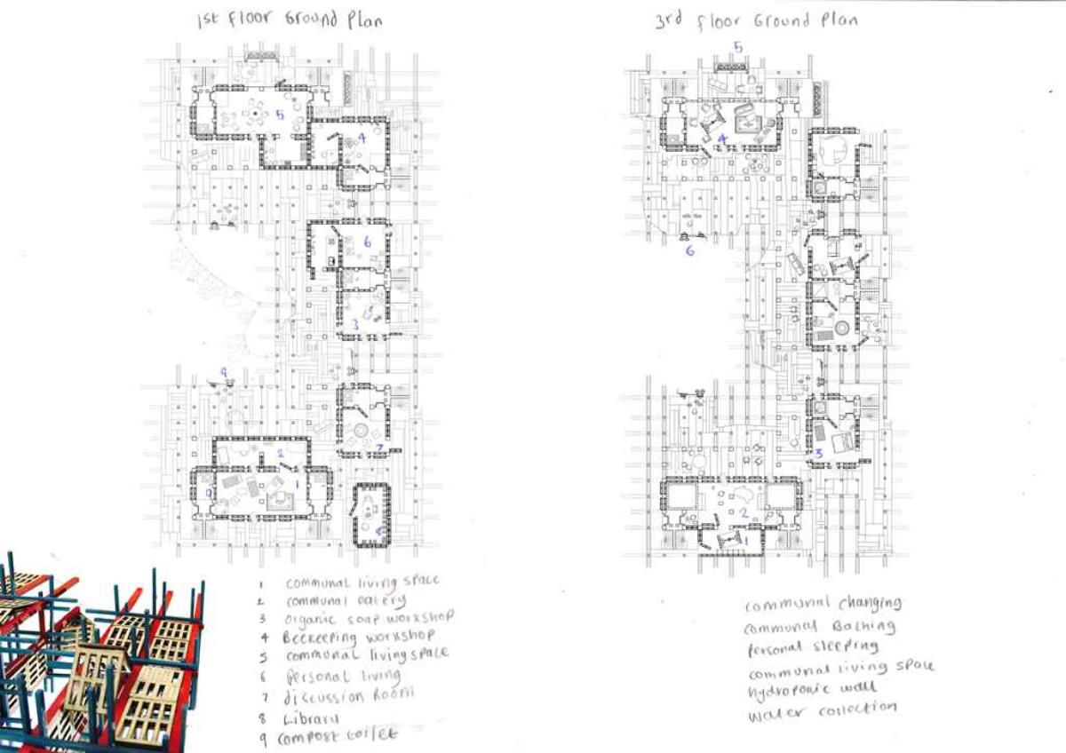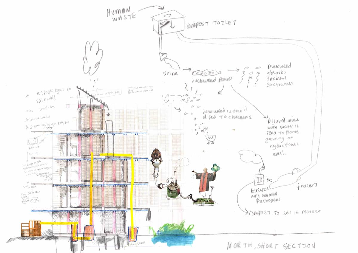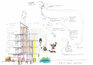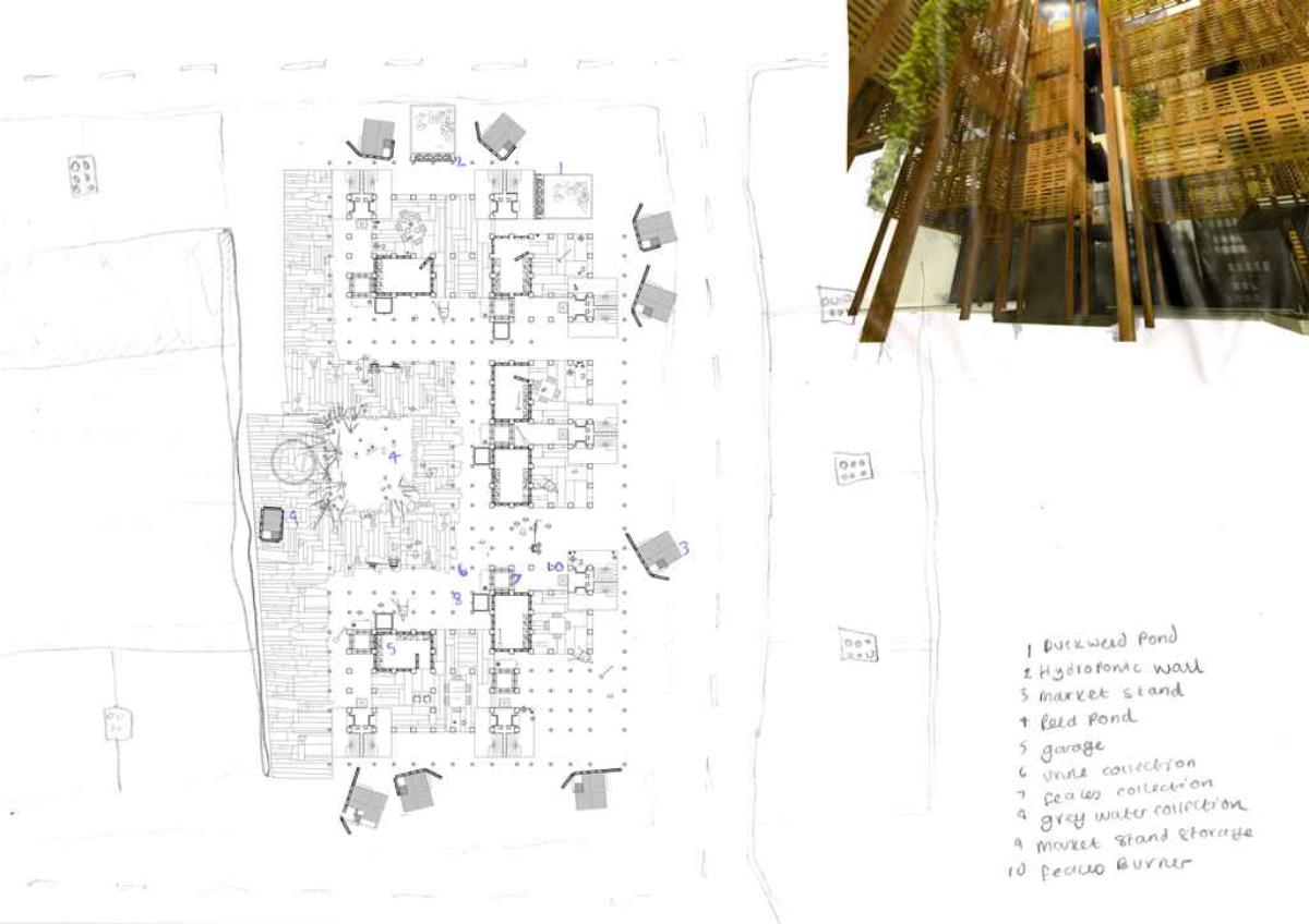 This residential project is designed to rehouse Grow Heathrow and facilitate the emergence of an autonomous community instead of providing a commodity for governed individuals of an affluent demographic. It is intended to use minimum outside services and utilities; an almost self-sufficient community using algae growing as a primary source of protein, rainwater collection and filtration to minimise use of mains water and small scale production: chickens for eggs, bee keeping for honey and compost all enable income generation. Communal accommodation is designed to enable and enhance co-operative living, including cooking, socialising and education. Guest accommodation is also provided enabling visitors to stay and learn. Grow Heathrow has attempted to educate and inform society of the potential for genuine alternative to living and consuming within the late Capitalist condition.