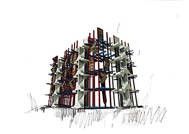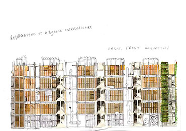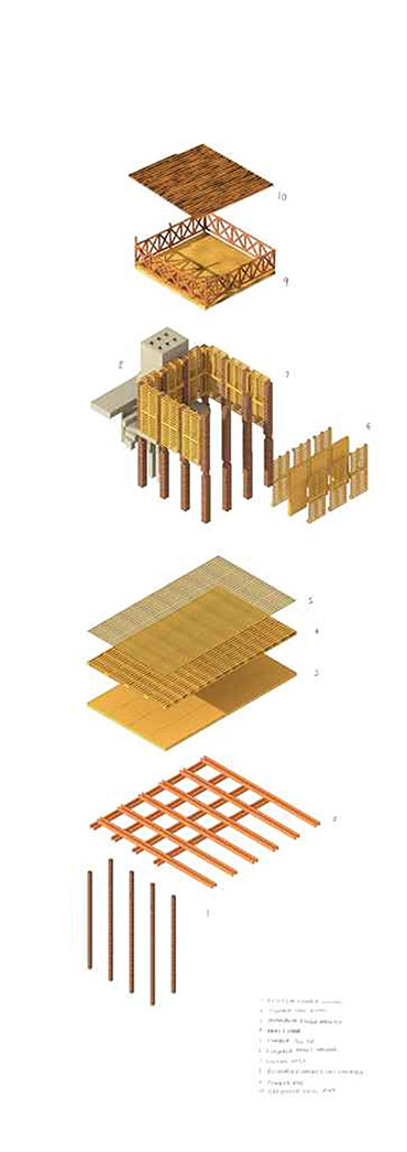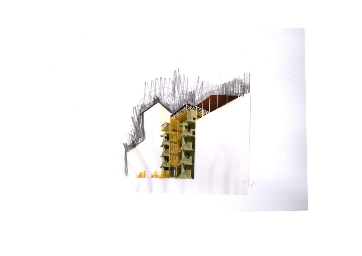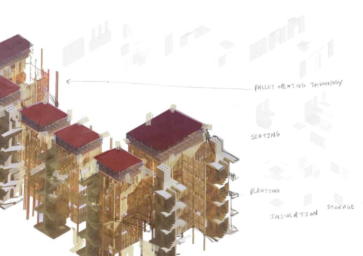 I propose we defer from entering business-orientated development and take a philanthropic approach to construction. This project focuses on a residential and mixed use building constructed primarily out of recycled pallets using the reconstructed stair towers (cast in concrete) originally part of the 19th Century housing on the site in Sclater Street. Close to the northern end of Brick Lane the project is located in an - an area rich in histories of community triumph and disaster and economic resilience, a palimpsest of memories now disregarded for commercial profit.