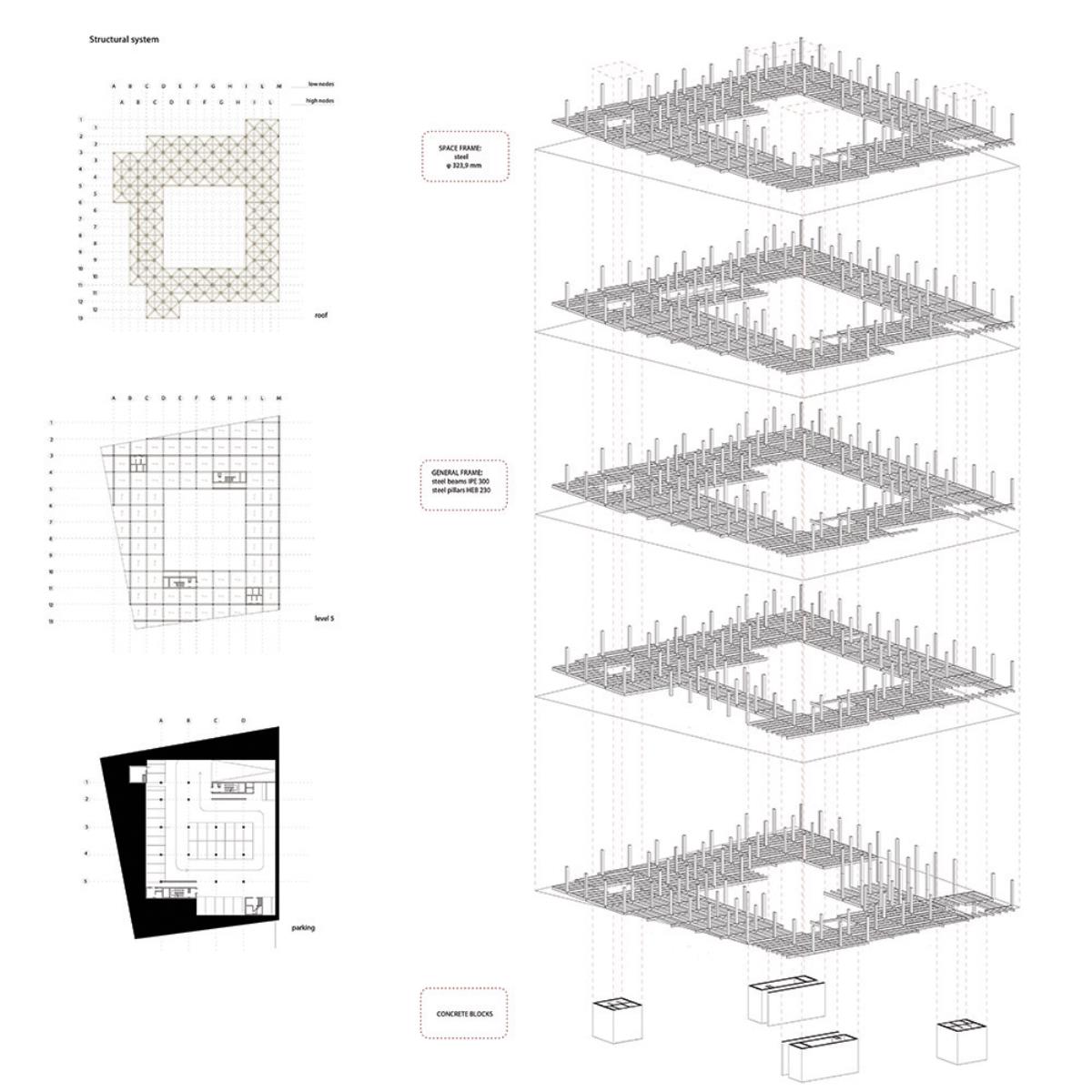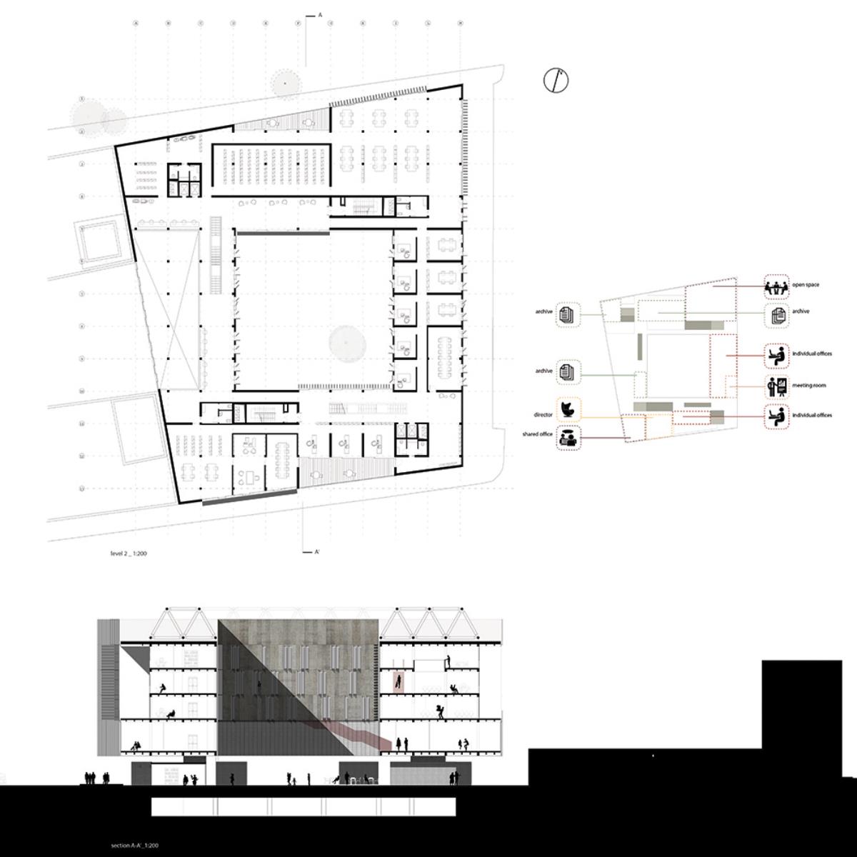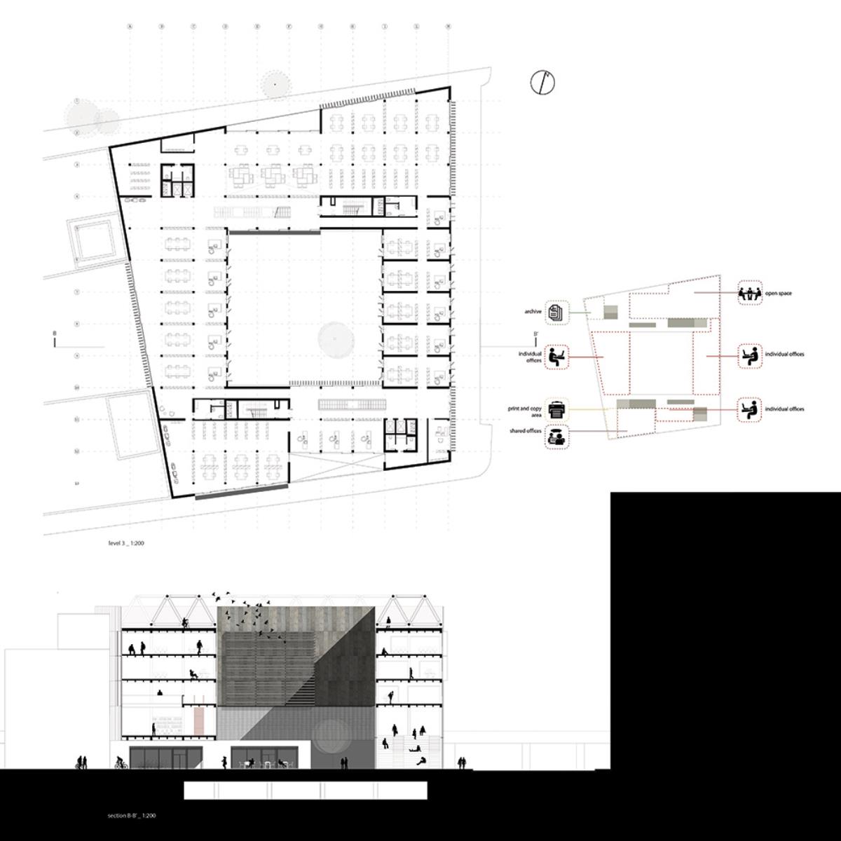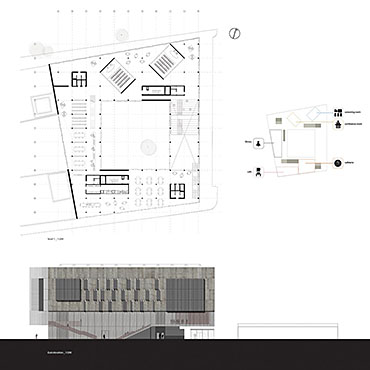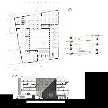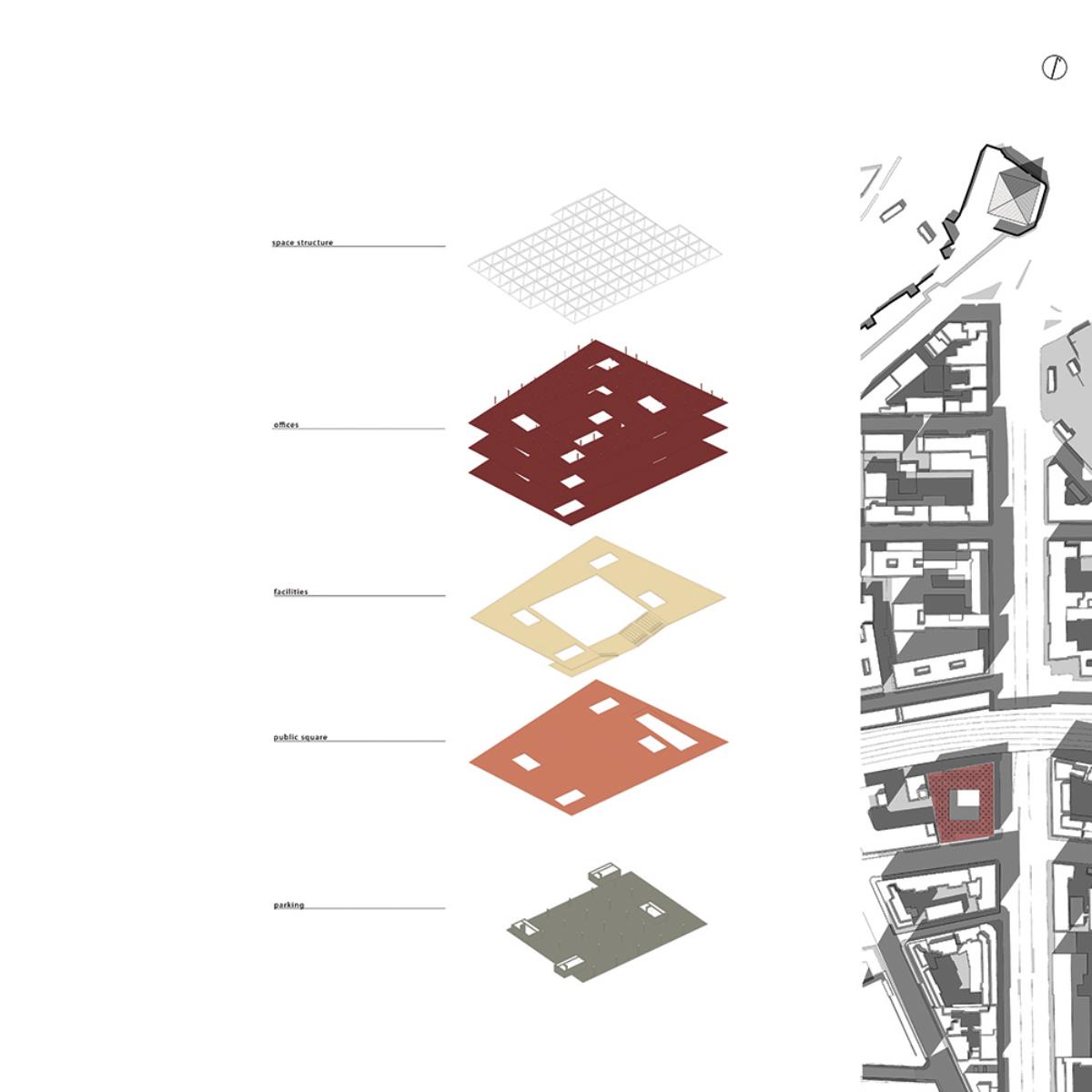 An industrial work space Part 2 Project 2015 Filippo Mattia DobrovichMargherita Porfirio Università degli Studi Roma Tre | Italy The aim of the project is the realization of an office complex with an internal square courtyard and a underground parking lot. The configuration of the complex also provides a suture in the preexisting fragmented urban tissue by proportionally inserting itself in the residential and commercial tissue close by, granting a unitary image. The area in which the project insists is an encounter of stratifications and it's filled of architectural complex that represent historical fundamental periods of the city.Today this area is the core of a big urban requalification plan: underneath the old “Gasometro” a big industrial part of the city is developed and this character is undertaken in the stylistic, technologic and structural elements used in the projectThe rotation of the courtyard outside the perimeter of the volume creates two different spaces: a regular space for the individual offices and a more fluent space for the distribution and shared offices.A fundamental aspect of the whole creative process was to keep a boundary between visual and physical permeability. The building, with a space structure which makes it seemed suspended, is able to preserve what happens inside of the courtyard which is also visible from the outside. Tutor(s) Paolo Desideri