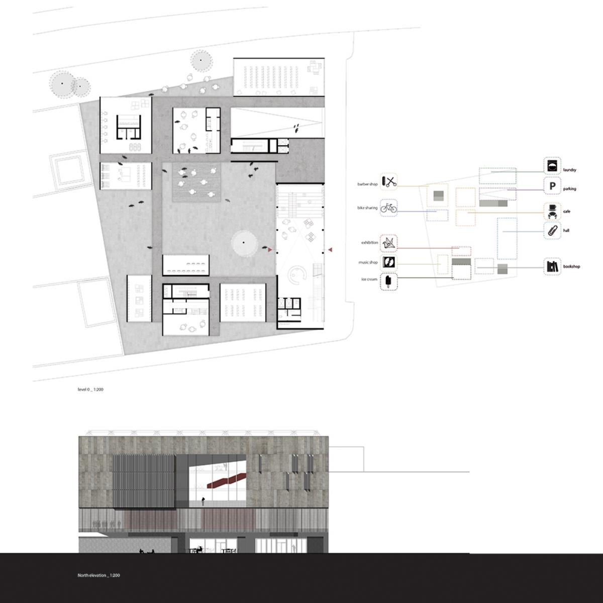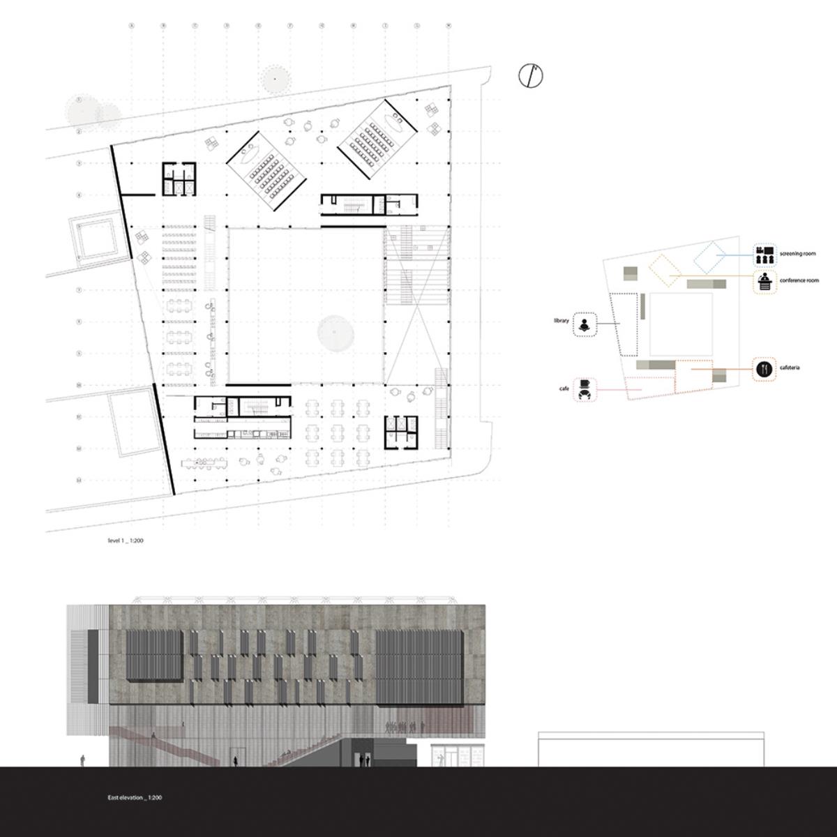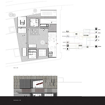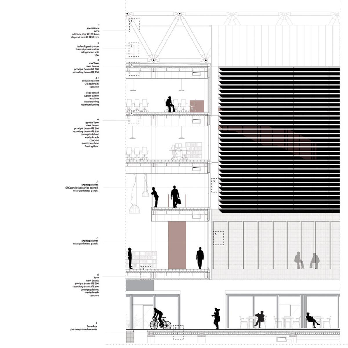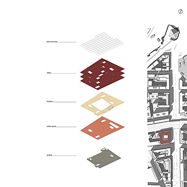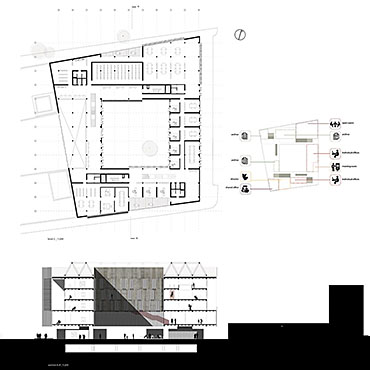 An industrial work space Part 2 Project 2015 Filippo Mattia DobrovichMargherita Porfirio Università degli Studi Roma Tre | Italy The aim of the project is the realization of an office complex with an internal square courtyard and a underground parking lot. The configuration of the complex also provides a suture in the preexisting fragmented urban tissue by proportionally inserting itself in the residential and commercial tissue close by, granting a unitary image. The area in which the project insists is an encounter of stratifications and it's filled of architectural complex that represent historical fundamental periods of the city.Today this area is the core of a big urban requalification plan: underneath the old “Gasometro” a big industrial part of the city is developed and this character is undertaken in the stylistic, technologic and structural elements used in the projectThe rotation of the courtyard outside the perimeter of the volume creates two different spaces: a regular space for the individual offices and a more fluent space for the distribution and shared offices.A fundamental aspect of the whole creative process was to keep a boundary between visual and physical permeability. The building, with a space structure which makes it seemed suspended, is able to preserve what happens inside of the courtyard which is also visible from the outside. Tutor(s) Paolo Desideri