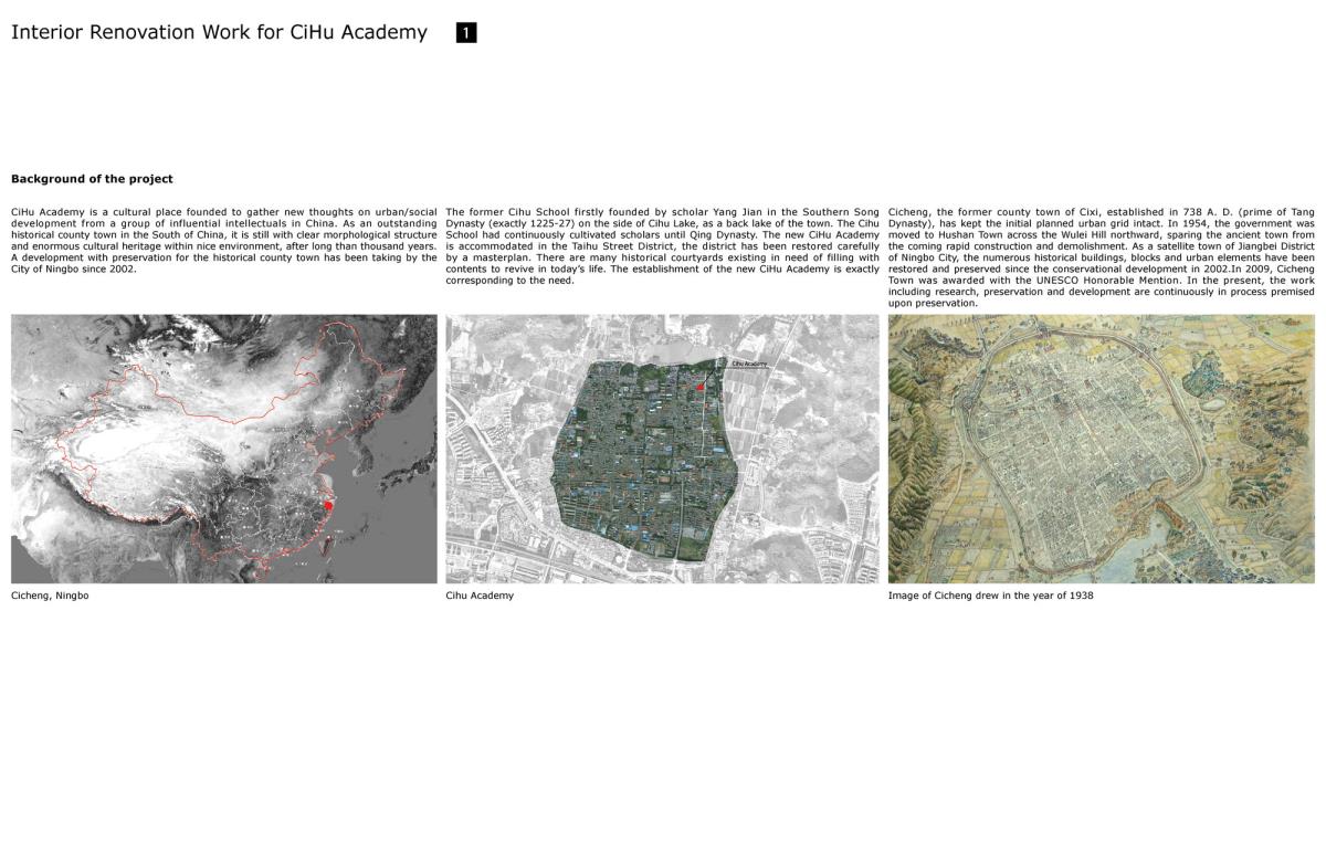 CiHu Academy is a cultural place founded to gather new thoughts on urban/social development from a group of influential intellectuals in China. As an outstanding historical county town in the South of China, Cicheng maintains its clear morphological structure and abundant cultural heritage within nice environment, after more than a thousand years. A development with preservation for the historical county town has been taken by the City of Ningbo since 2002.