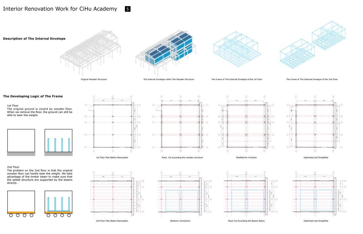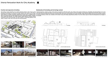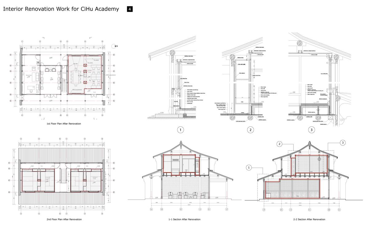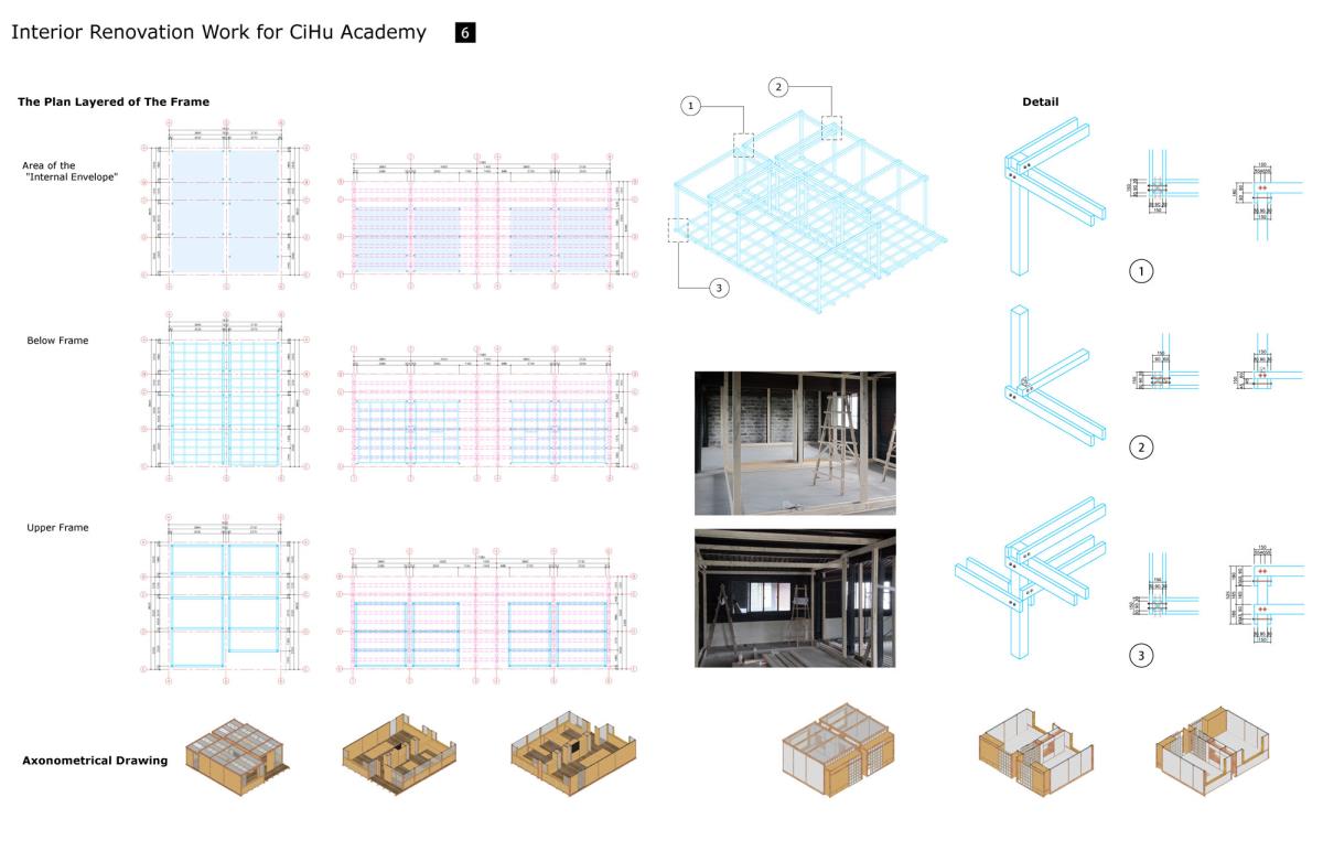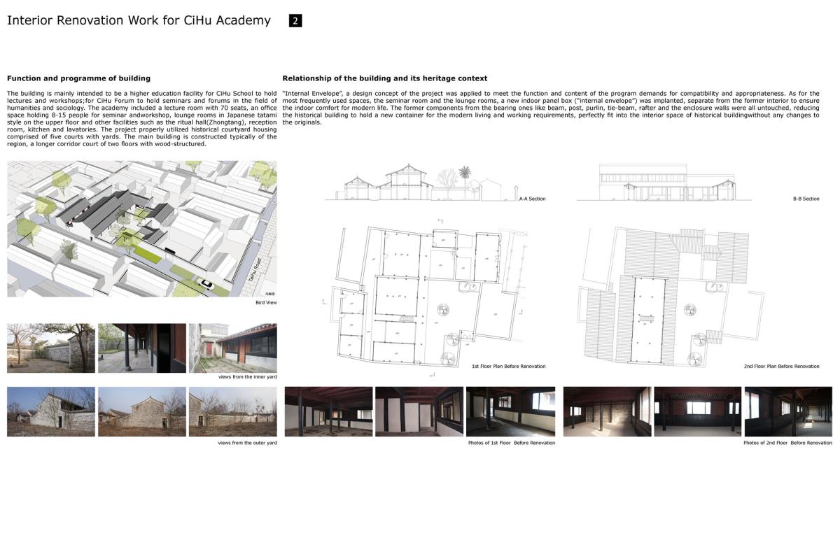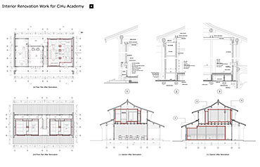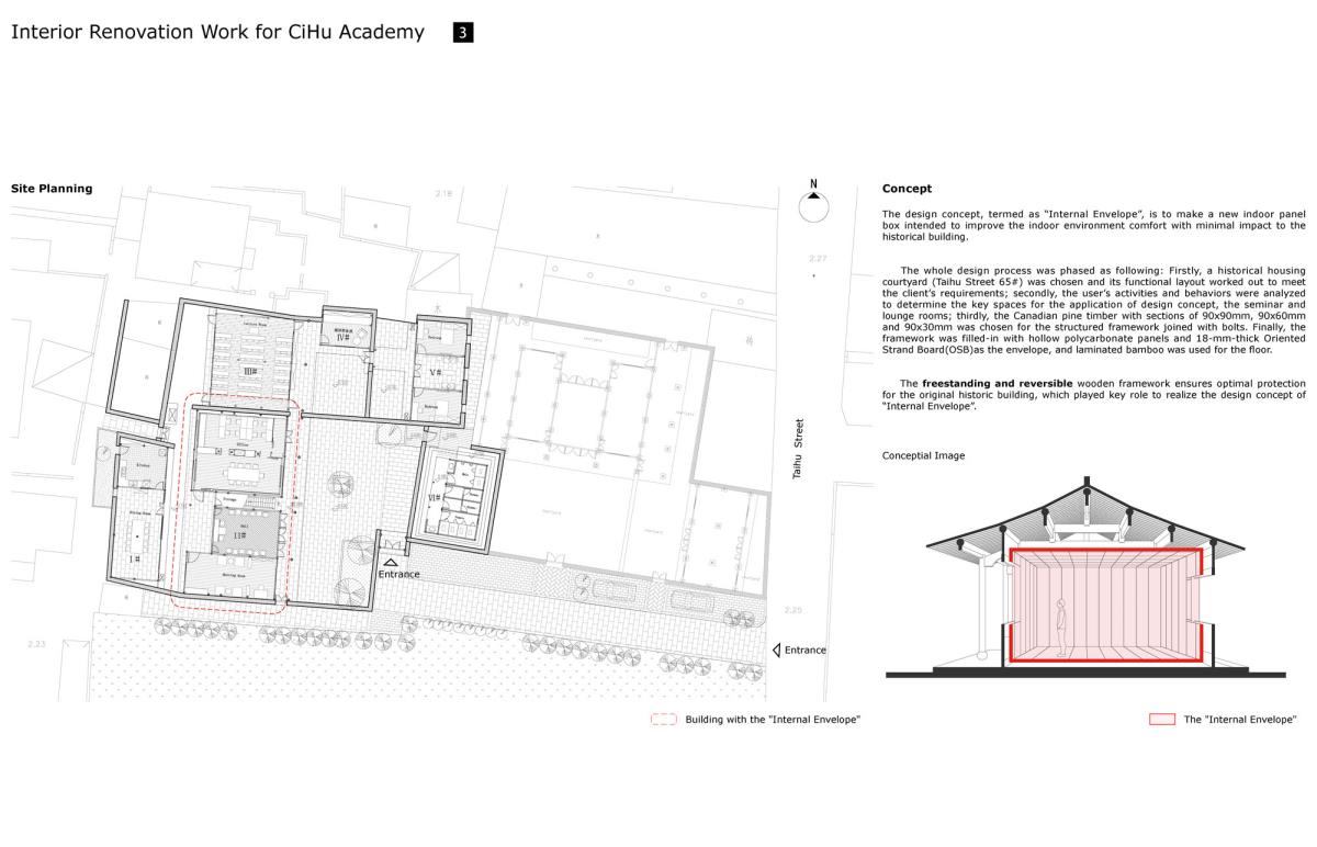 The design concept, termed as ‘Internal Envelope’, intends to make a new indoor panel box to improve the indoor environmental comfort with minimal impact to the historical building. The freestanding and reversible wooden framework ensures optimal protection for the original historic building, which played a key role to realize the design concept of ‘Internal Envelope’. The project is to resolve the functional problem of indoor environmental comfort for today’s requirement for CiHu Academy and the new use of a traditional courtyard house.