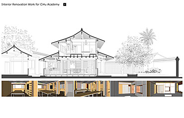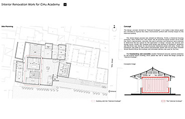 The academy included a lecture room, an office for seminar and workshop, lounge rooms on the upper floor and other facilities. The project properly utilized historical courtyard housing comprised of five courts with yards. The main building is a two-storey construction with wood-structure.