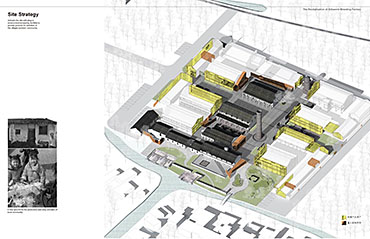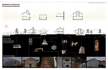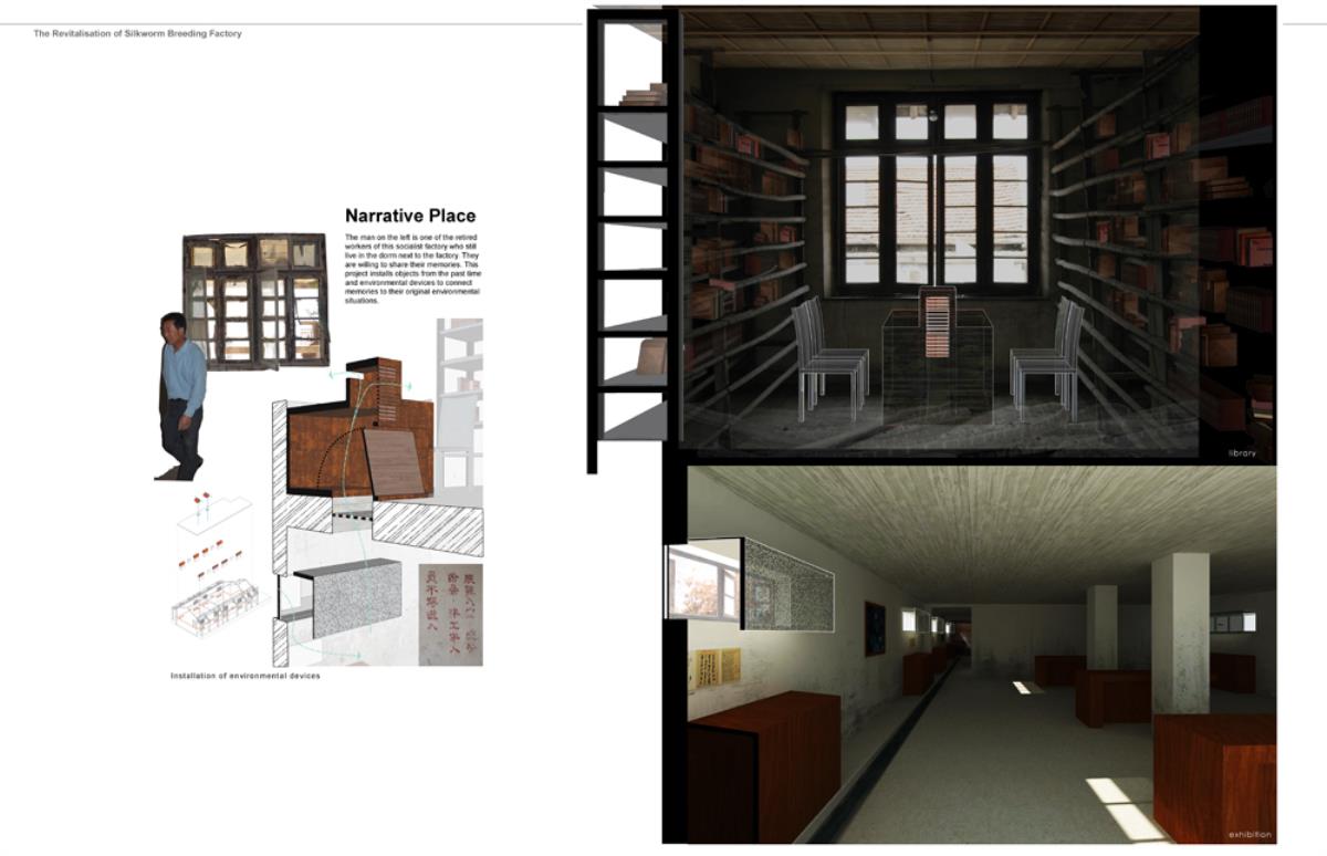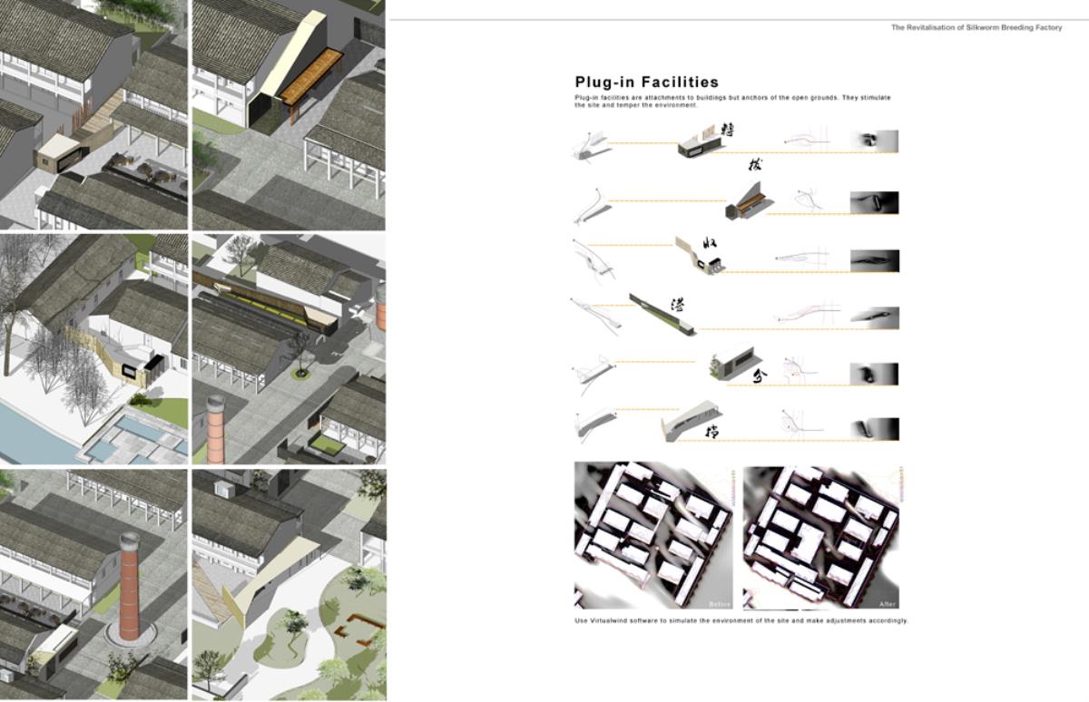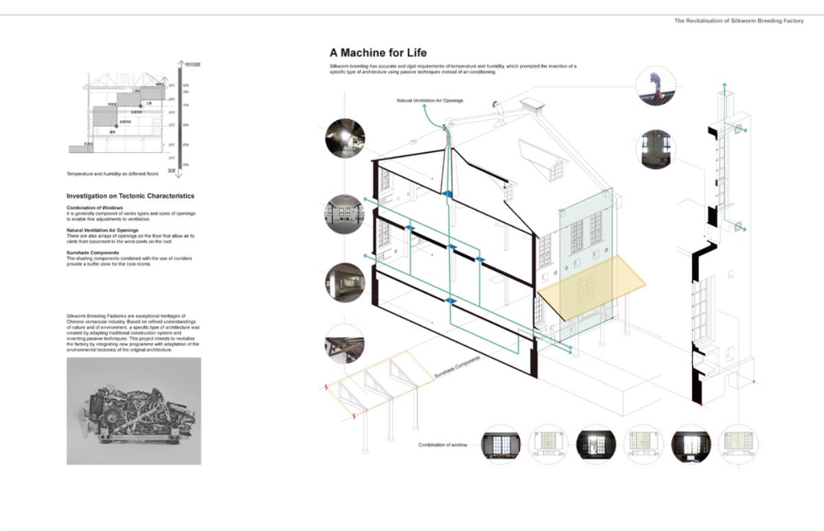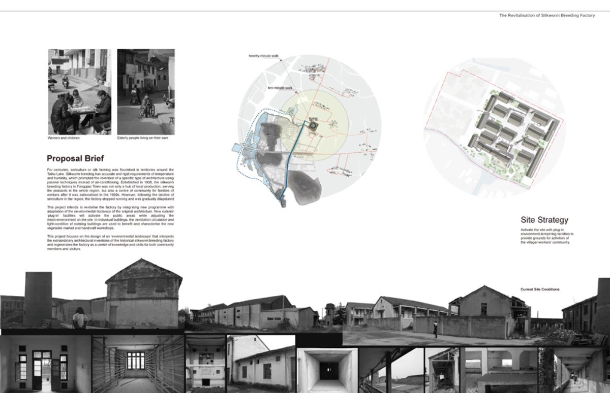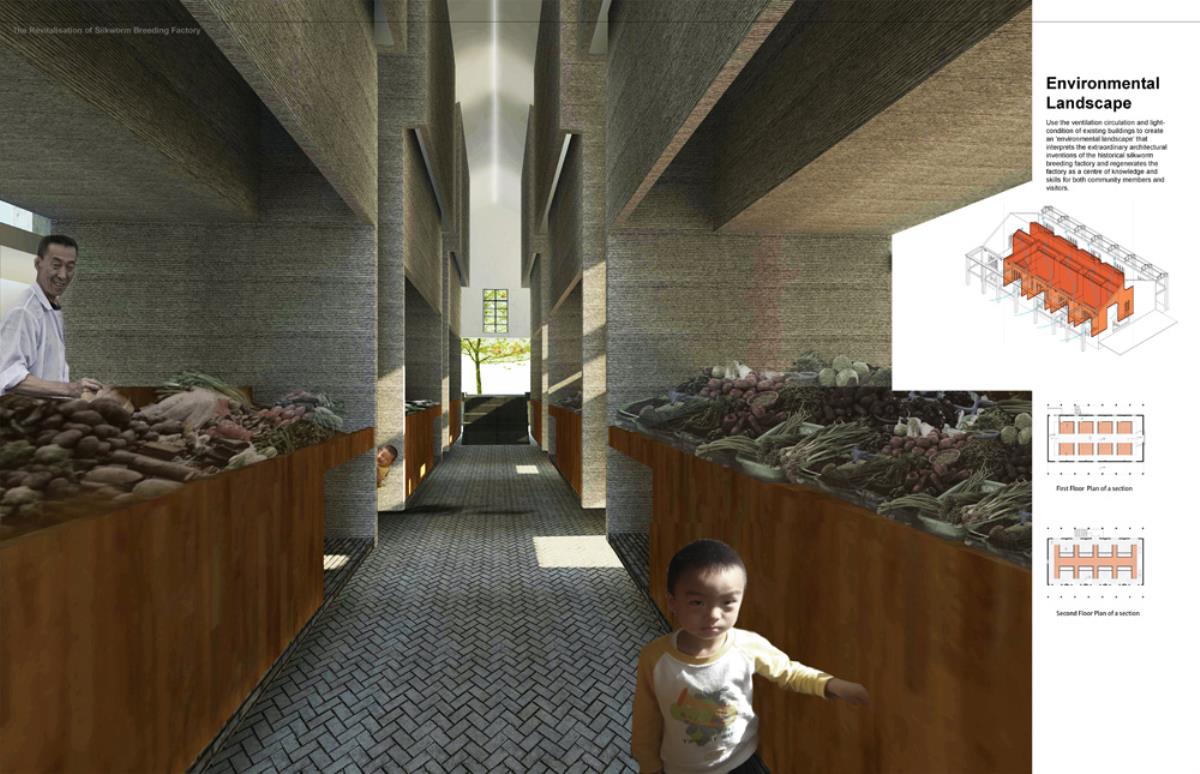 The Revitalisation of Silkworm Breeding Factory Part 2 Project 2015 Oipin Hu Nanjing University | China For centuries, sericulture or silk farming was flourished in territories around the Taihu Lake. Silkworm breeding has accurate and rigid requirements of temperature and humidity, which prompted the invention of a specific type of architecture using passive techniques instead of air-conditioning. Established in 1930, the silkworm breeding factory in Fangqiao Town was not only a hub of local production, serving the peasants in the whole region, but also a centre of community for families of workers after it was nationalised in the 1950s. However, following the decline of sericulture in the region, the factory stopped running and was gradually dilapidated.This project intends to revitalise the factory by integrating new programme with adaptation of the environmental tectonics of the original architecture. New exterior ‘plug-in’ facilities will activate the public areas while adjusting the micro-environment on the site. In individual buildings, the ventilation circulation and light-condition of existing buildings are used to benefit and characterise the new vegetable market and handcraft workshops.This project focuses on the design of an ‘environmental landscape’ that interprets the extraordinary architectural inventions of the historical silkworm breeding factory and regenerates the factory as a centre of knowledge and skills for both community members and visitors. Tutor(s) Andong Lu