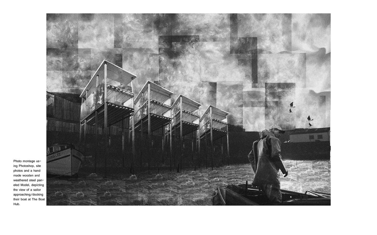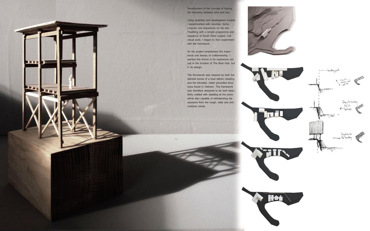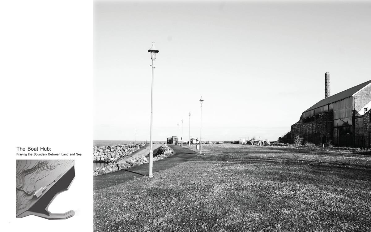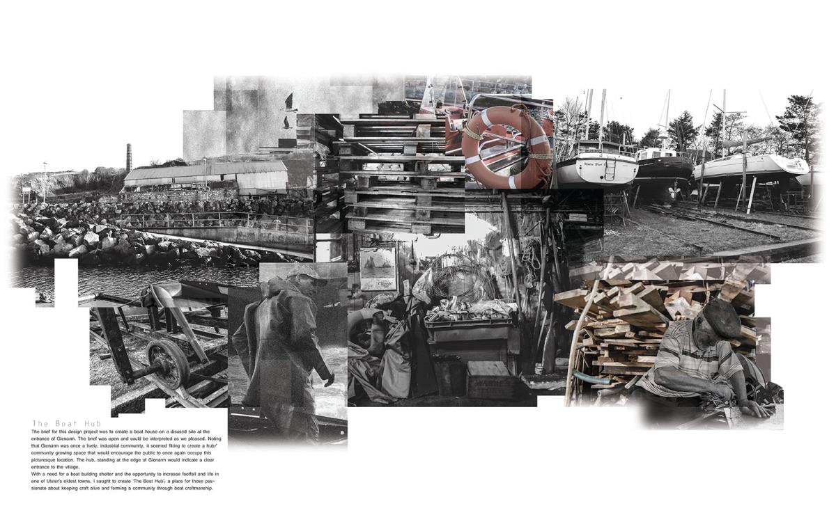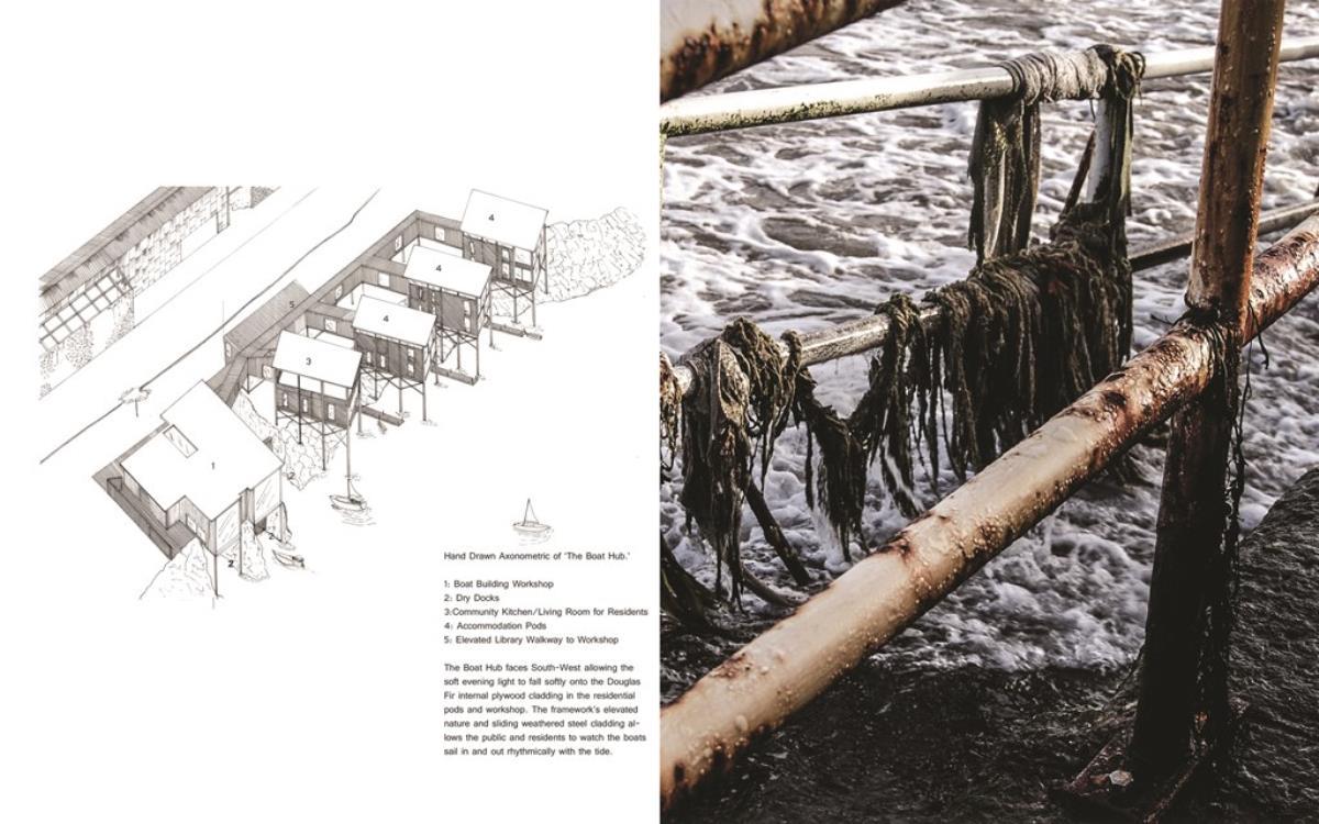 The Boat Hub: Fraying the Boundary Between Land and Sea Part 1 Project 2015 Aoife Mulvenna Ulster University | UK Perched at the entrance of the coastal village of Glenarm, at the edge of a once busy marina, lies a forgotten plot of land. Once full of activity the site sits in silence with the exception of the waves crashing against the marina’s boulders. Harbouring over 600 fluctuating boats in the summer months due to its accessibility and tidal movements, Glenarm ties itself to international sailors. A series of small platoons allows the harbour master a platform on which to repair these visiting boats. The marina, although nestled into the coastline, still falls victim to the harsh elements of the northerly weather. With a lack of shelter, the ability to carry out such intricate boat repair work becomes determined by the workability of the weather. The Boat Hub introduces a fitting place to house this work whilst offering a buildable solution to the modern day worry that craftsmanship is wilting in this technology infatuated era.The space is designed to offer the public an opportunity to explore their inner craftsman. It is a haven for passion and an advocate for thinking with your hands. It seeks to form an interchangeable community through the fluctuating sailors and visitors who stumble upon it, whilst also stitching together an existing one, forming a link between Glenarm’s residents and the marina. Tutor(s) James Luke