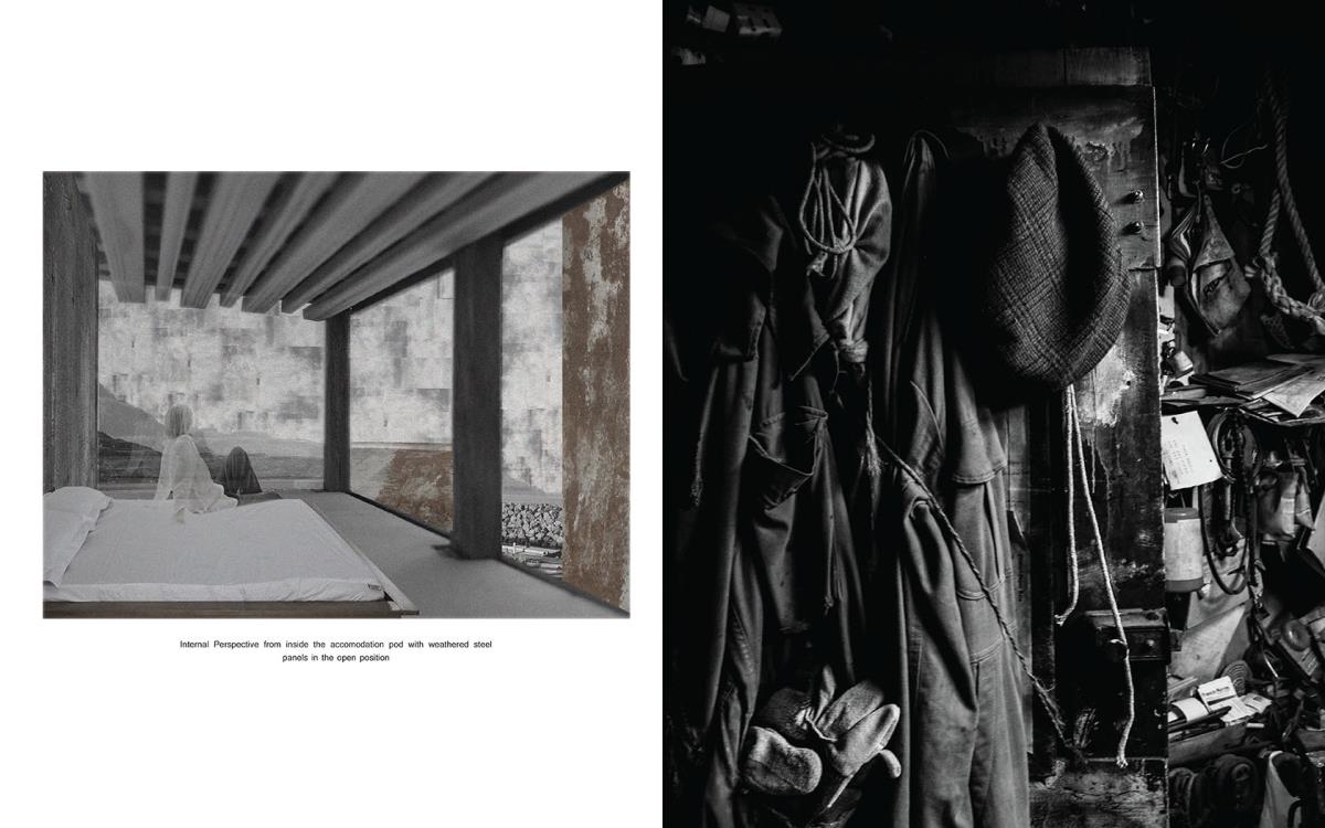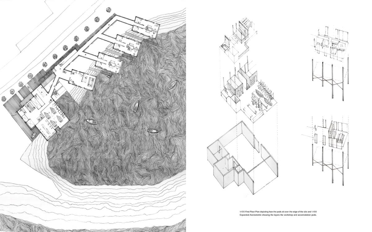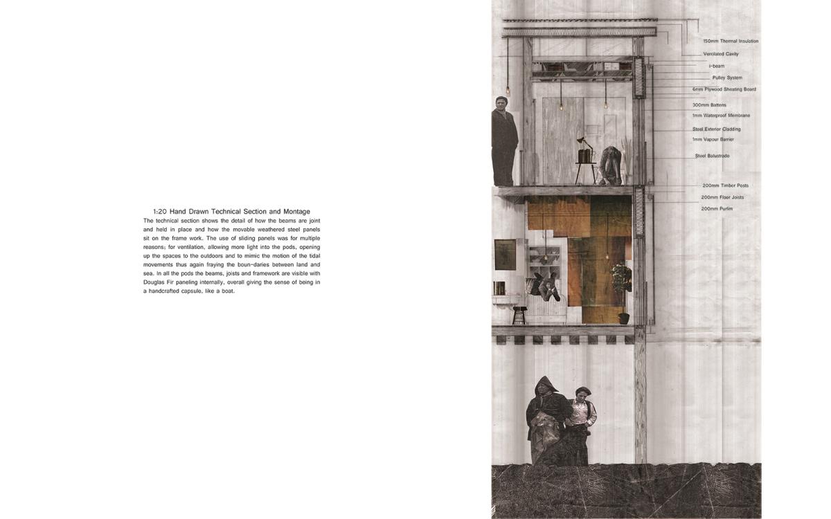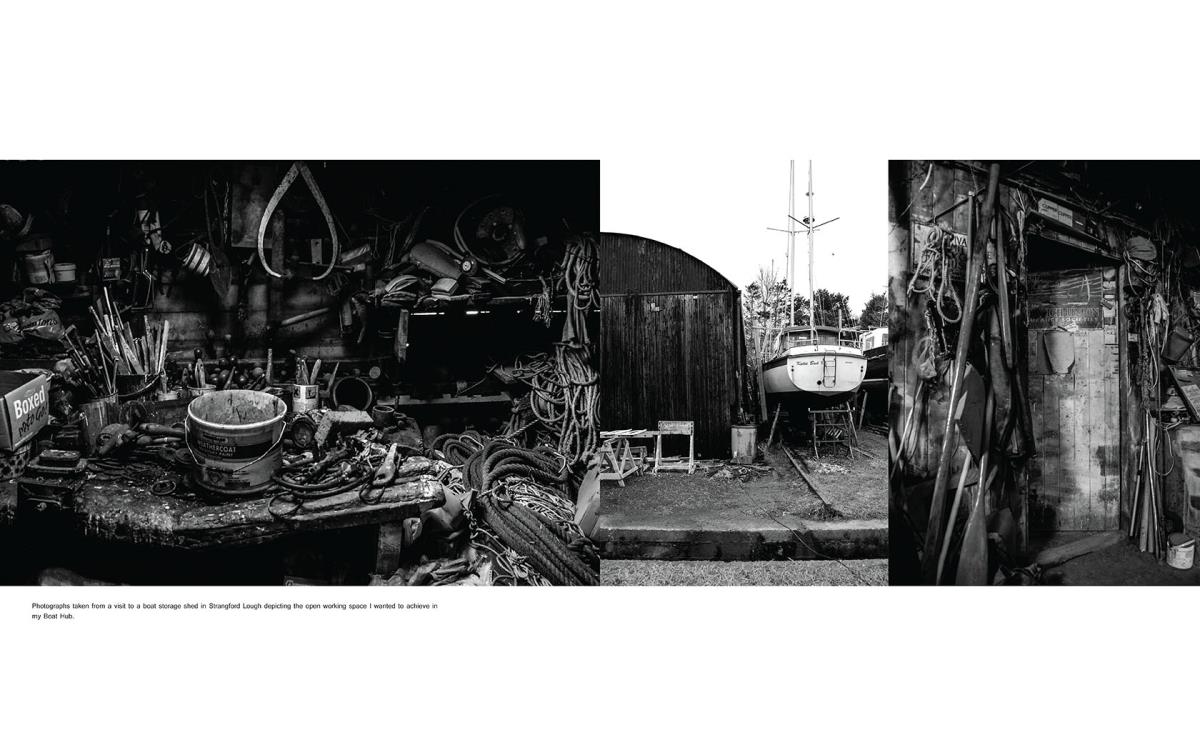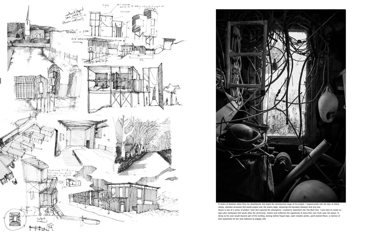 The Boat Hub: Fraying the Boundary Between Land and Sea Part 1 Project 2015 Aoife Mulvenna Ulster University | UK Perched at the entrance of the coastal village of Glenarm, at the edge of a once busy marina, lies a forgotten plot of land. Once full of activity the site sits in silence with the exception of the waves crashing against the marina’s boulders. Harbouring over 600 fluctuating boats in the summer months due to its accessibility and tidal movements, Glenarm ties itself to international sailors. A series of small platoons allows the harbour master a platform on which to repair these visiting boats. The marina, although nestled into the coastline, still falls victim to the harsh elements of the northerly weather. With a lack of shelter, the ability to carry out such intricate boat repair work becomes determined by the workability of the weather. The Boat Hub introduces a fitting place to house this work whilst offering a buildable solution to the modern day worry that craftsmanship is wilting in this technology infatuated era.The space is designed to offer the public an opportunity to explore their inner craftsman. It is a haven for passion and an advocate for thinking with your hands. It seeks to form an interchangeable community through the fluctuating sailors and visitors who stumble upon it, whilst also stitching together an existing one, forming a link between Glenarm’s residents and the marina. Tutor(s) James Luke