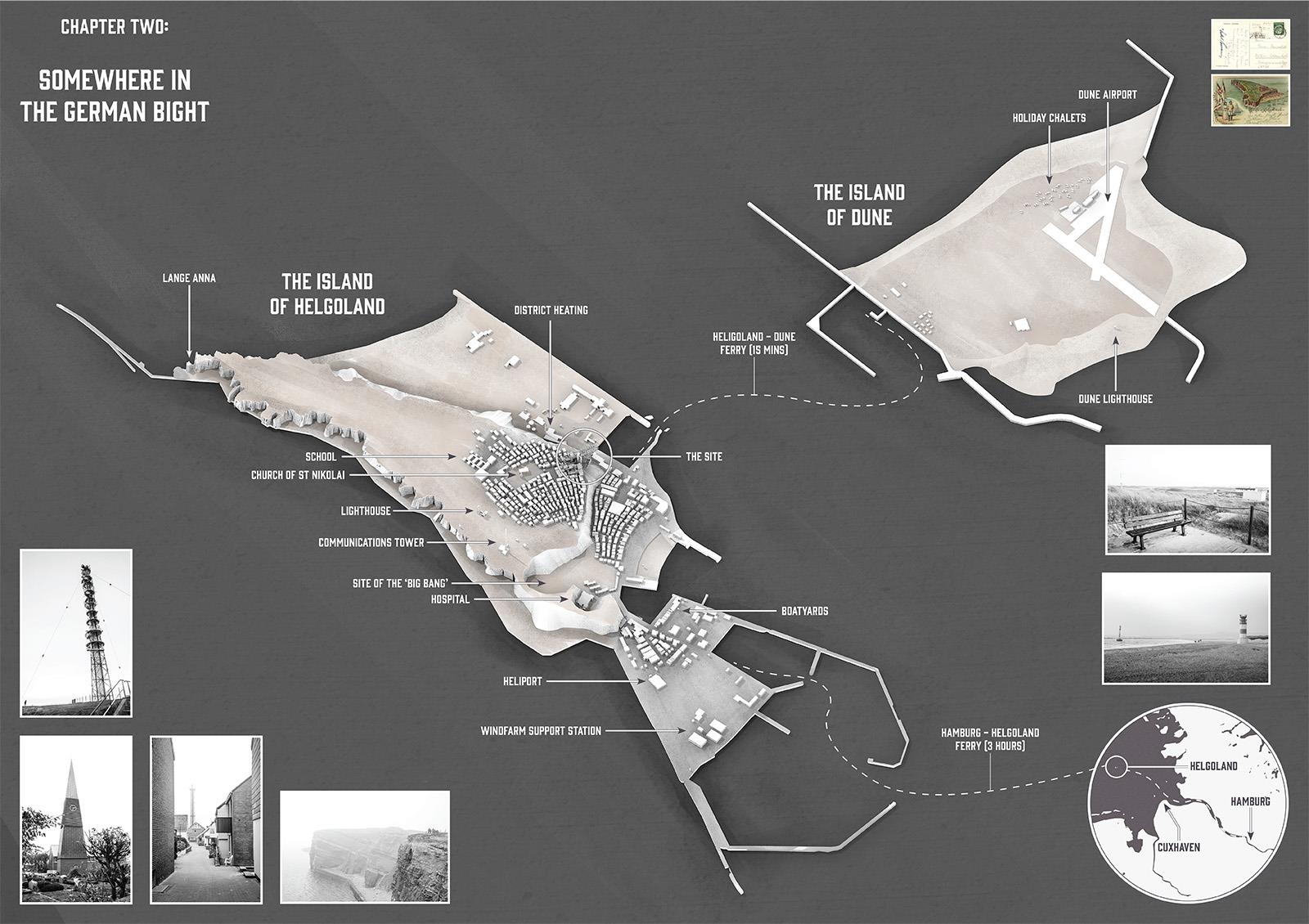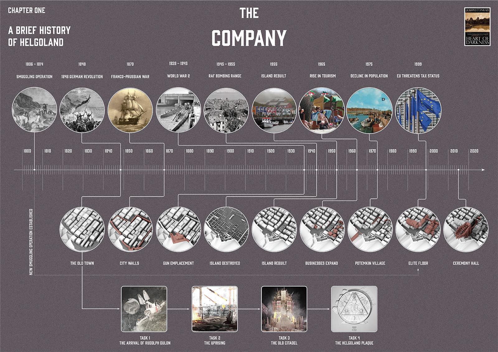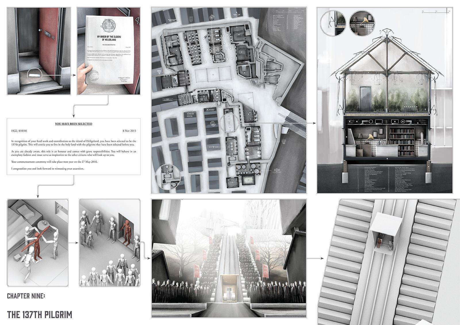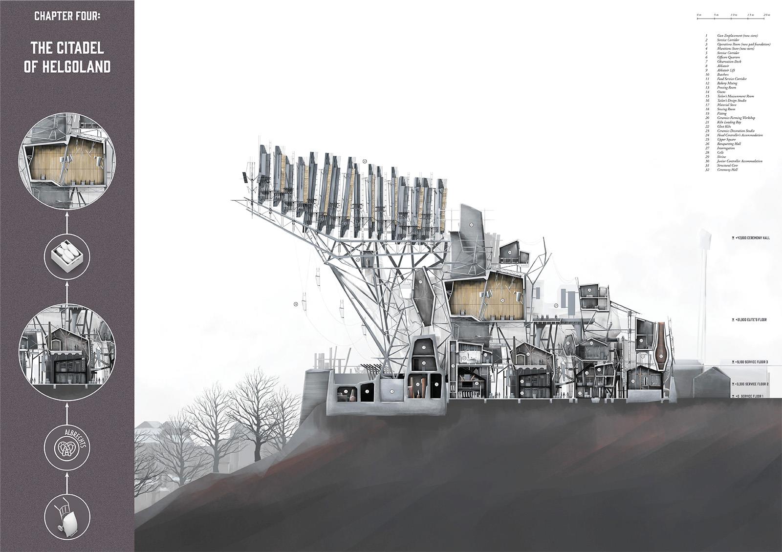 ‘The Company’ is set on Helgoland in the North Sea. The project’s narrative begins in 1848 with the shipwreck of an outsider and it chronicles the evolution of the island and its society. Urban development evolves over a timeline of 150 years culminating with a citadel, the location for key civic and religious activities. The drawings presented here depict the protagonist Elisa Hecker’s experience of architecture on the island.