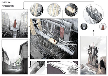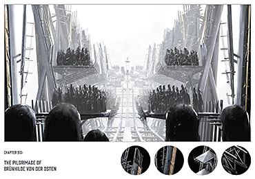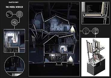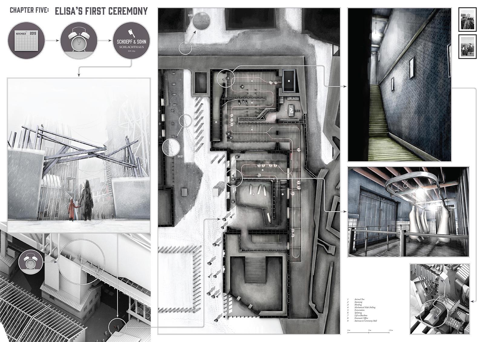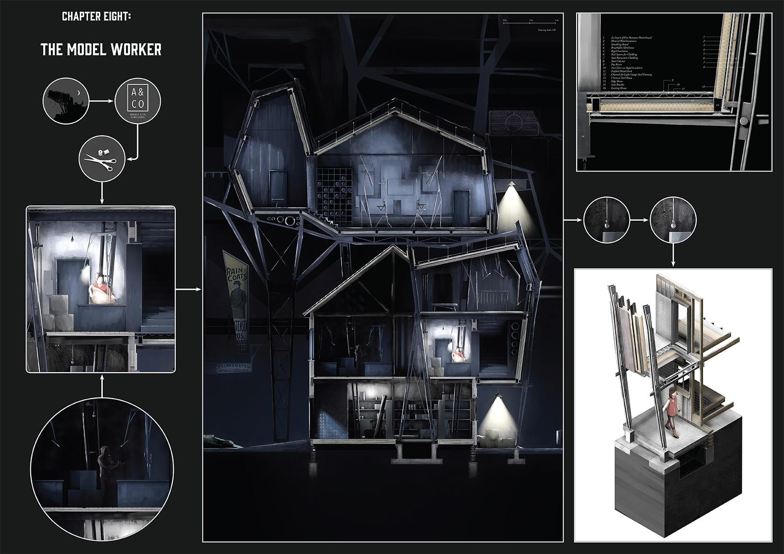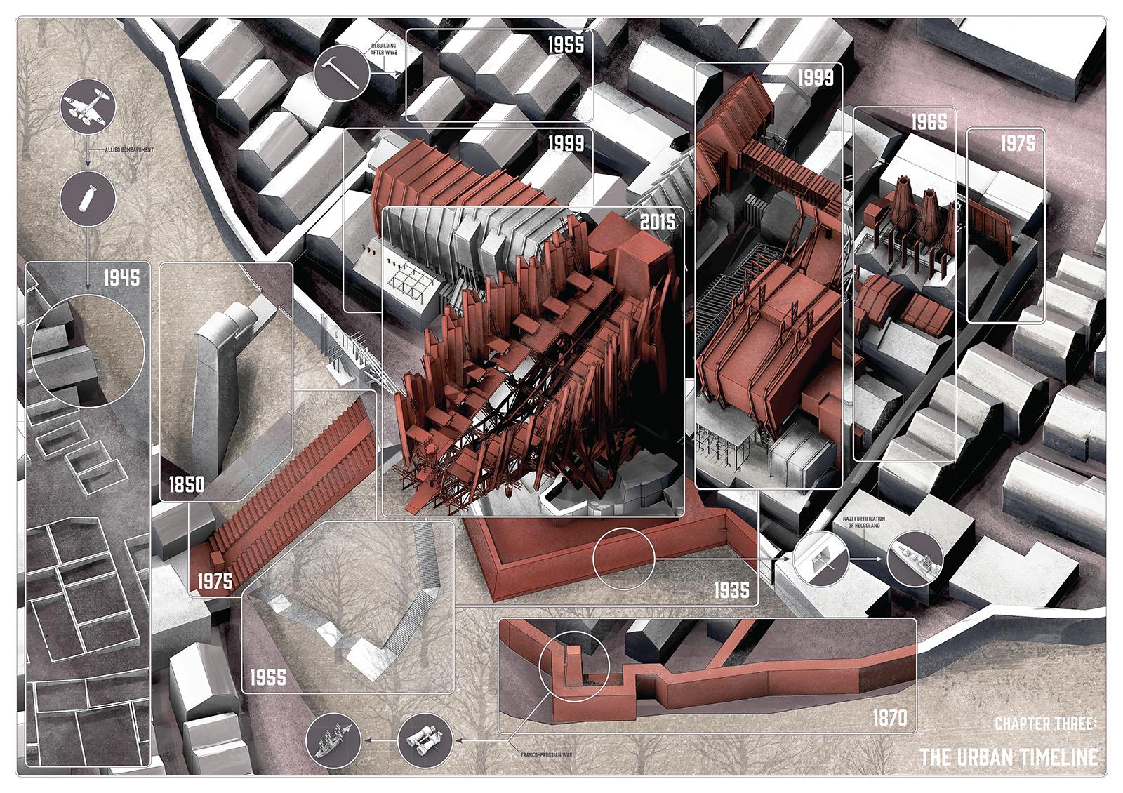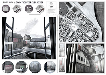 ‘The Company’ is set on Helgoland in the North Sea. The project’s narrative begins in 1848 with the shipwreck of an outsider and it chronicles the evolution of the island and its society. Urban development evolves over a timeline of 150 years culminating with a citadel, the location for key civic and religious activities. The drawings presented here depict the protagonist Elisa Hecker’s experience of architecture on the island.