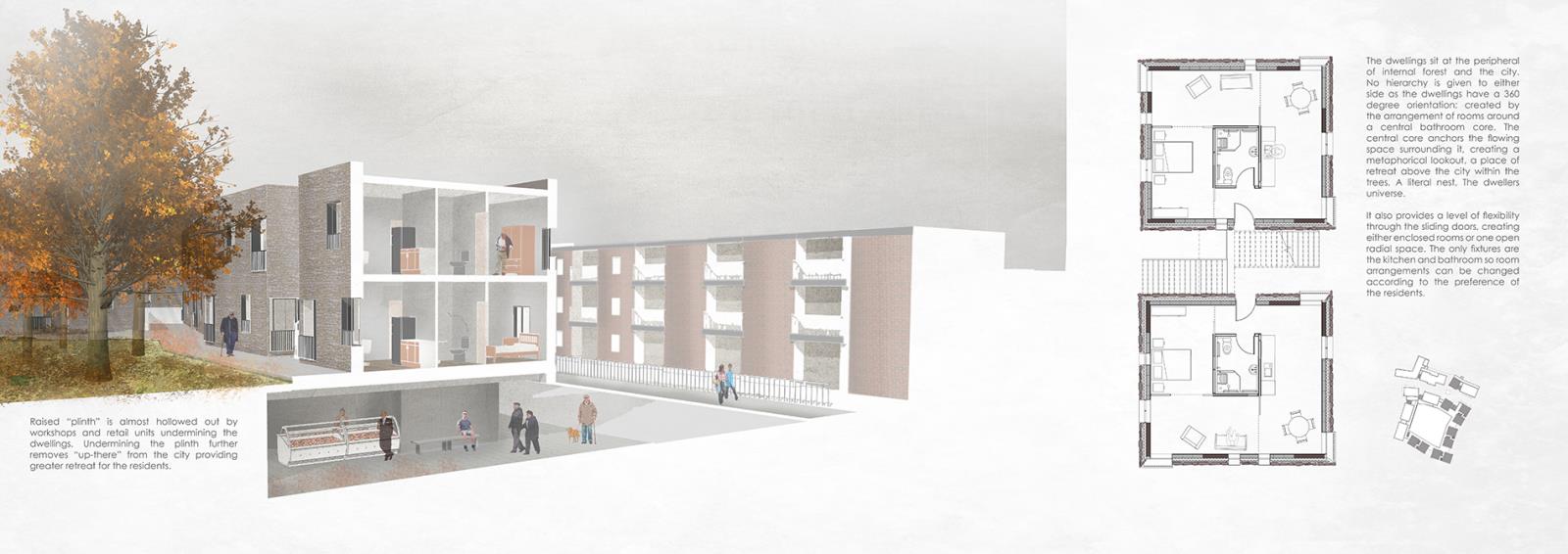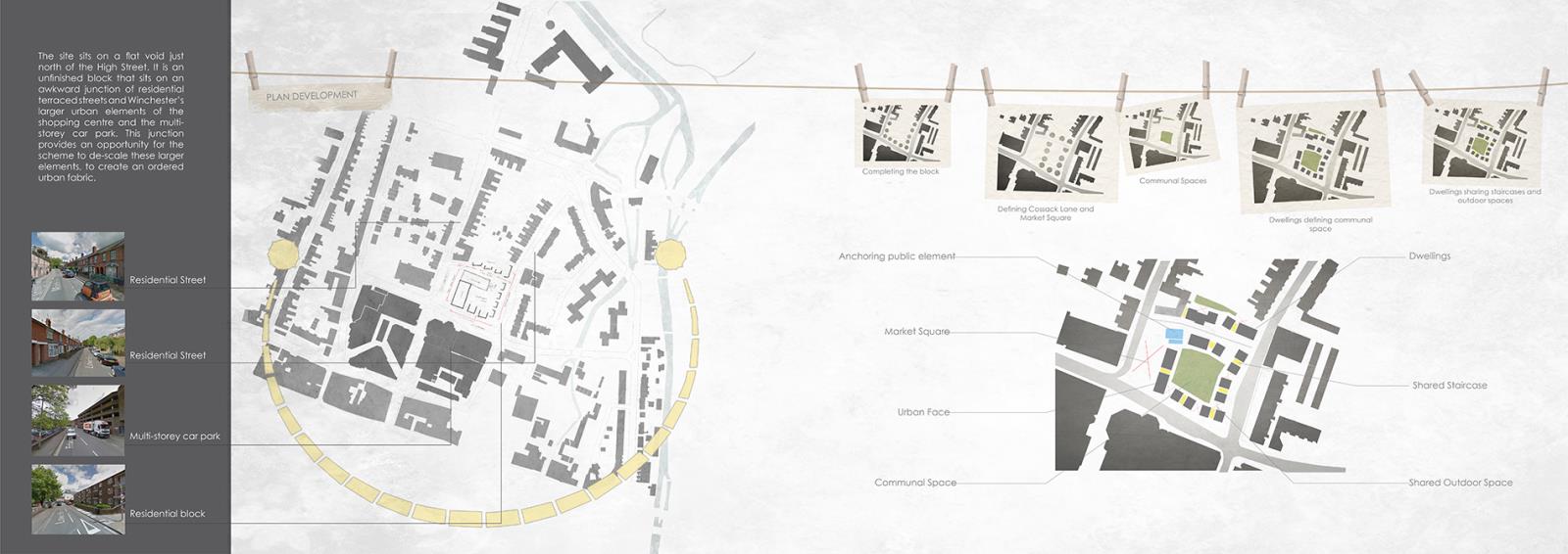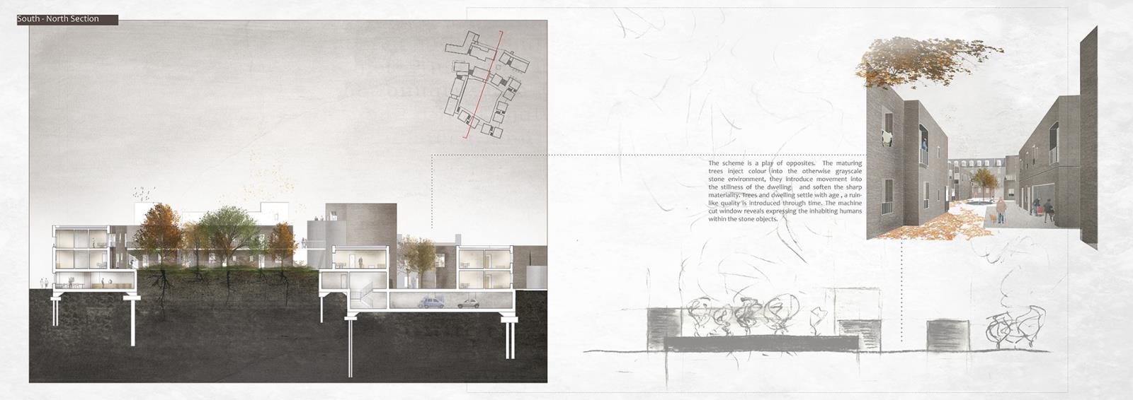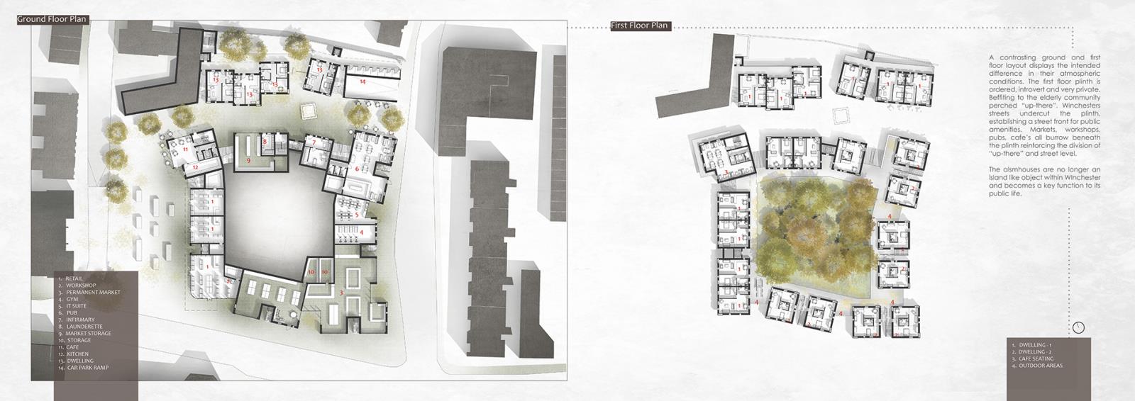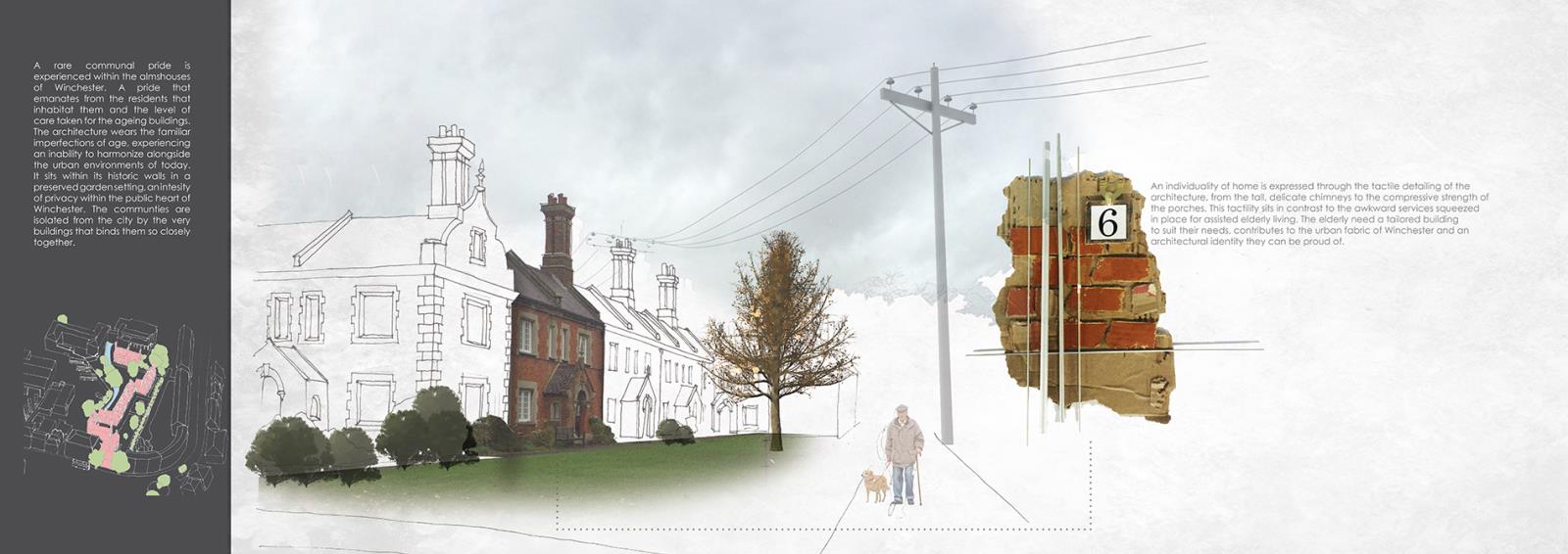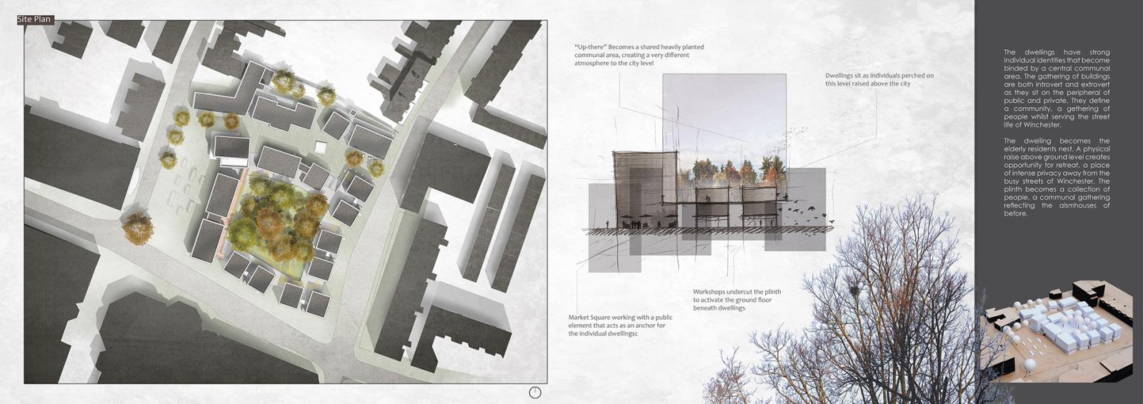 The UK has an ageing population, with the amount of people aged 85+ expecting to double by 2033. The preserved city of Winchester will also experience this demographic shift and although the presence of elderly almshouses within the city centre is high, they contribute little to the urban fabric of today. “Up-there” aims to harmonise the qualities of the current almshouses with the vibrant life of Winchester’s streets.