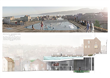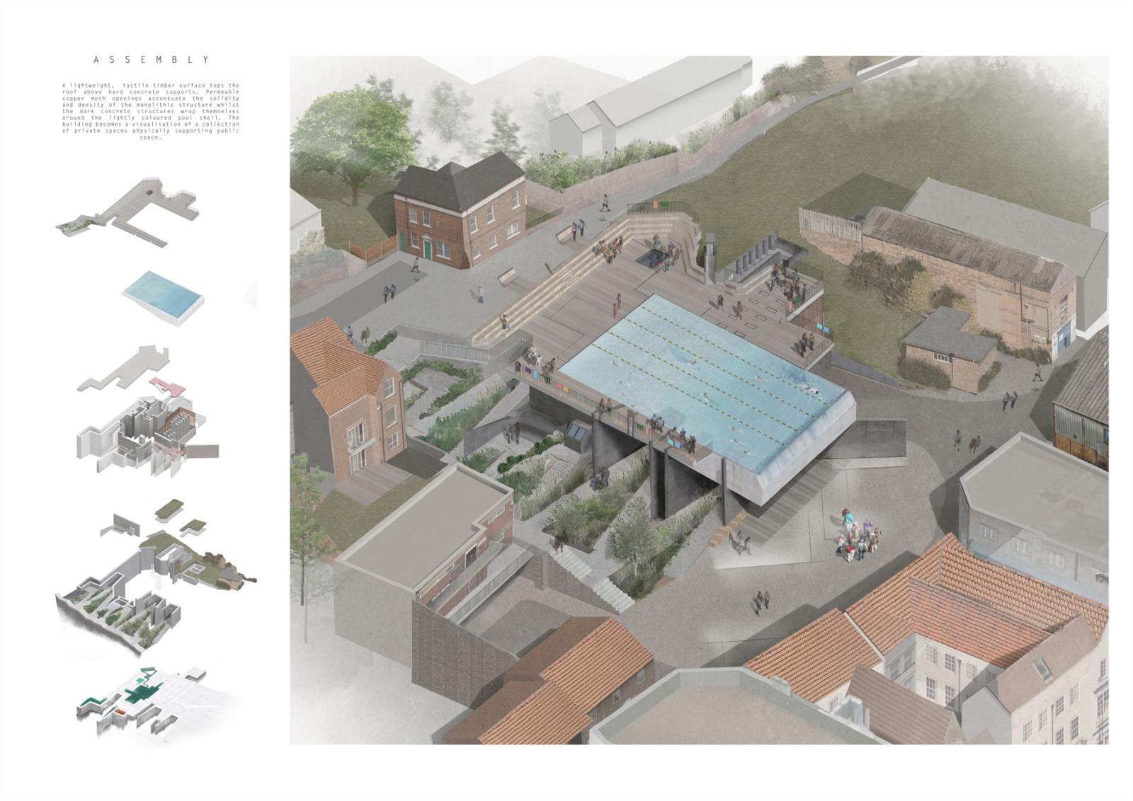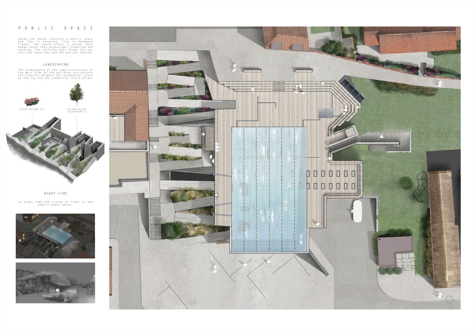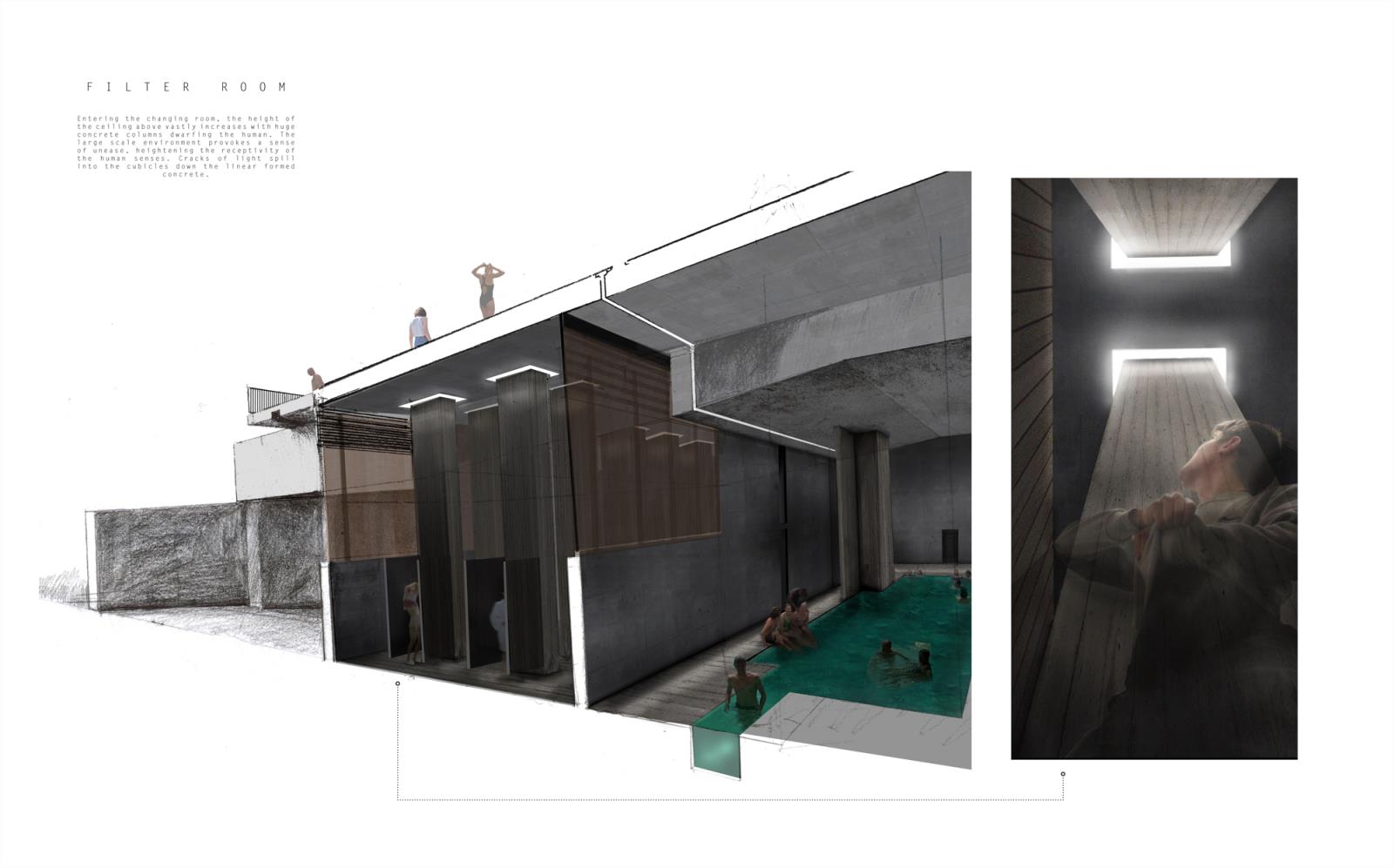 Burr Bank Bathing Machine Part 1 Project 2016 Thomas Hudson-Davies University of Sheffield | UK The design of this bath house takes inspiration from Scarborough’s historic relationship with water. The cavernous, subterranean spa references the town’s initial uses of water for its medicinal purposes with the mineral spa. Above, the bright public space and lido acknowledges the more leisurely connection to water that came later as the town developed into a popular seaside resort. The project aims to redefine the faded identity of Scarborough. Tutor(s) Simon Chadwick Ming Chung Peter Markos Nick Tyson