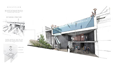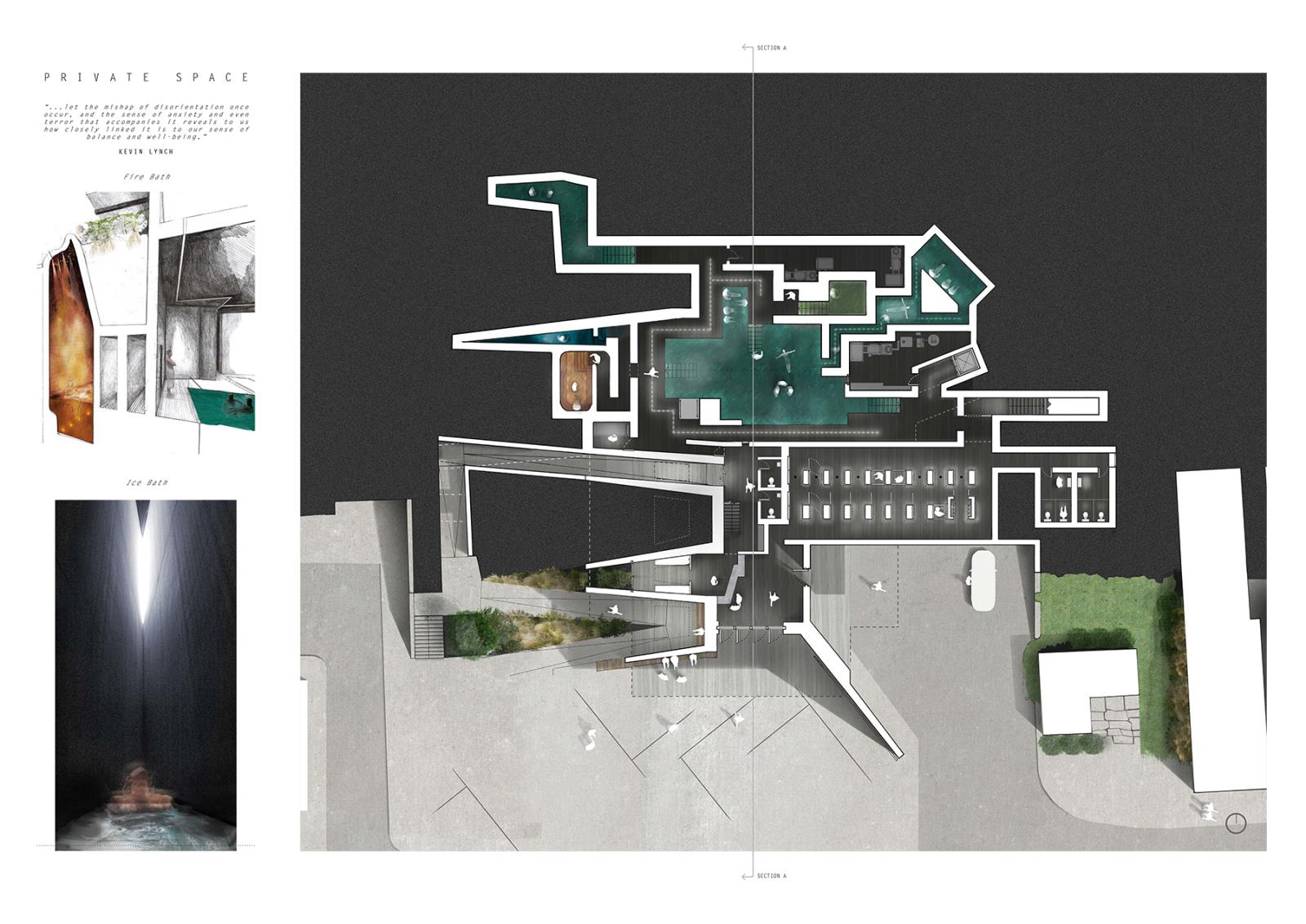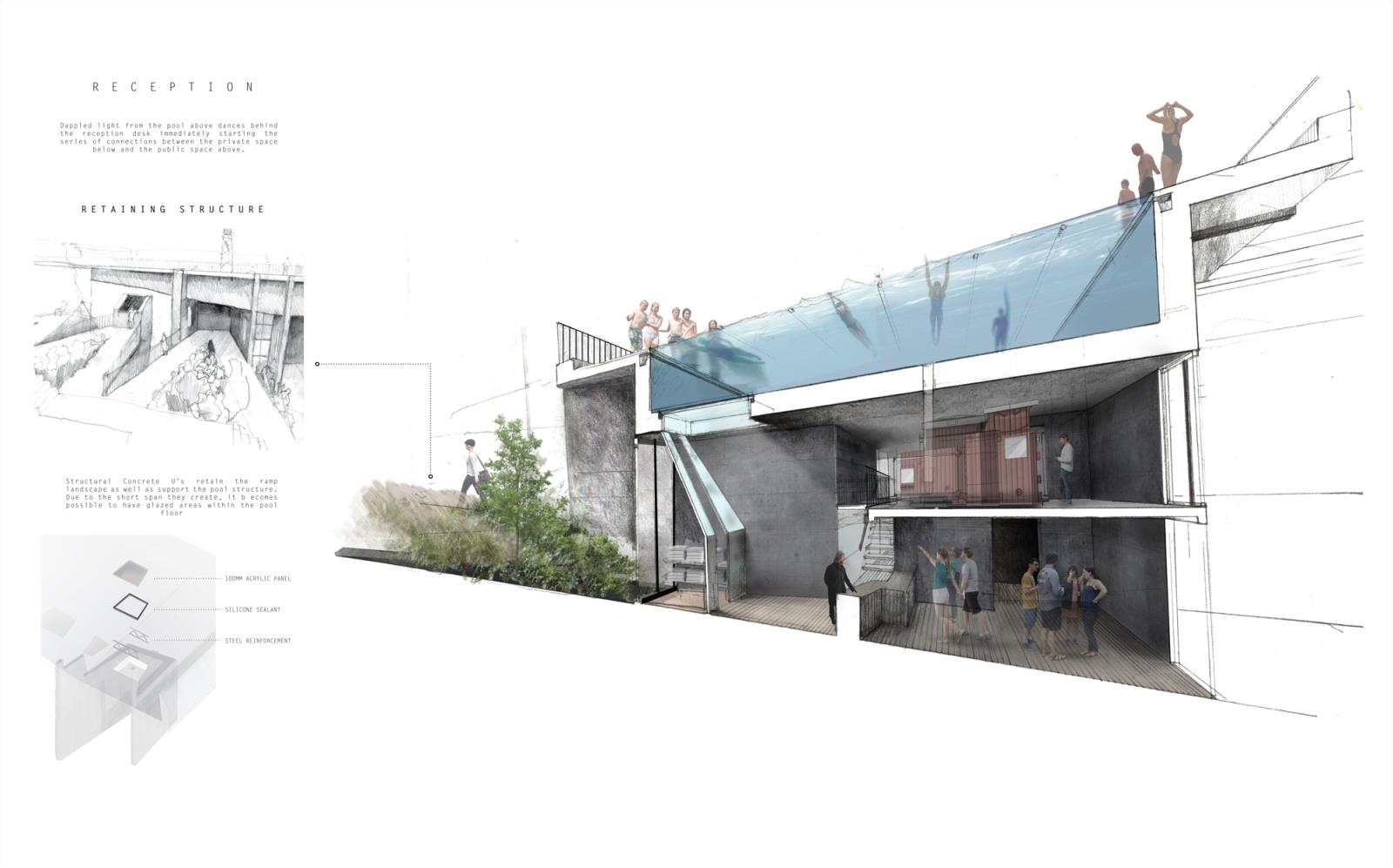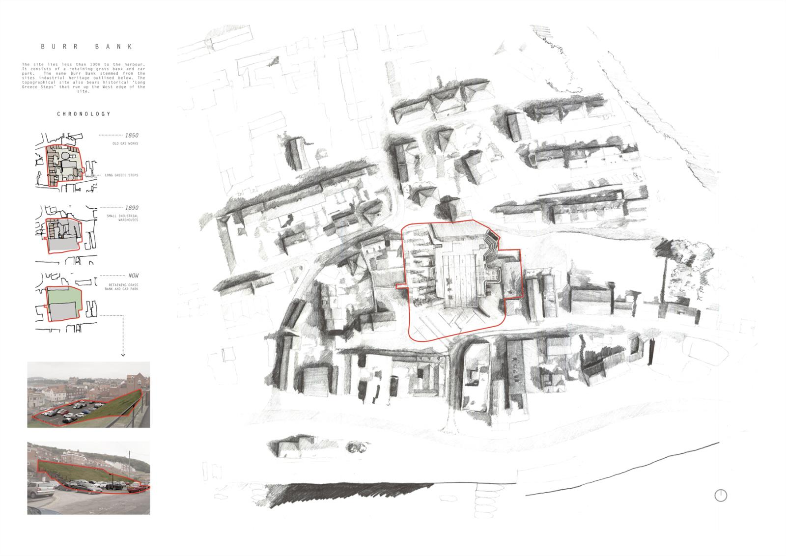 Burr Bank Bathing Machine Part 1 Project 2016 Thomas Hudson-Davies University of Sheffield | UK The design of this bath house takes inspiration from Scarborough’s historic relationship with water. The cavernous, subterranean spa references the town’s initial uses of water for its medicinal purposes with the mineral spa. Above, the bright public space and lido acknowledges the more leisurely connection to water that came later as the town developed into a popular seaside resort. The project aims to redefine the faded identity of Scarborough. Tutor(s) Simon Chadwick Ming Chung Peter Markos Nick Tyson