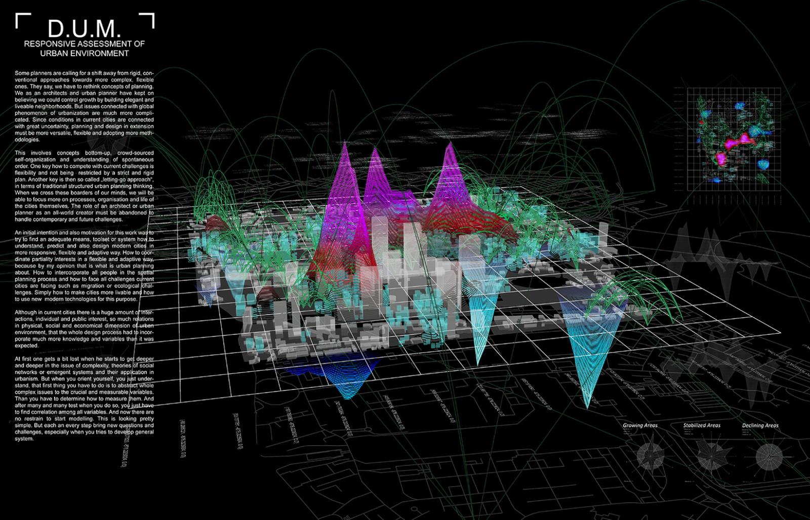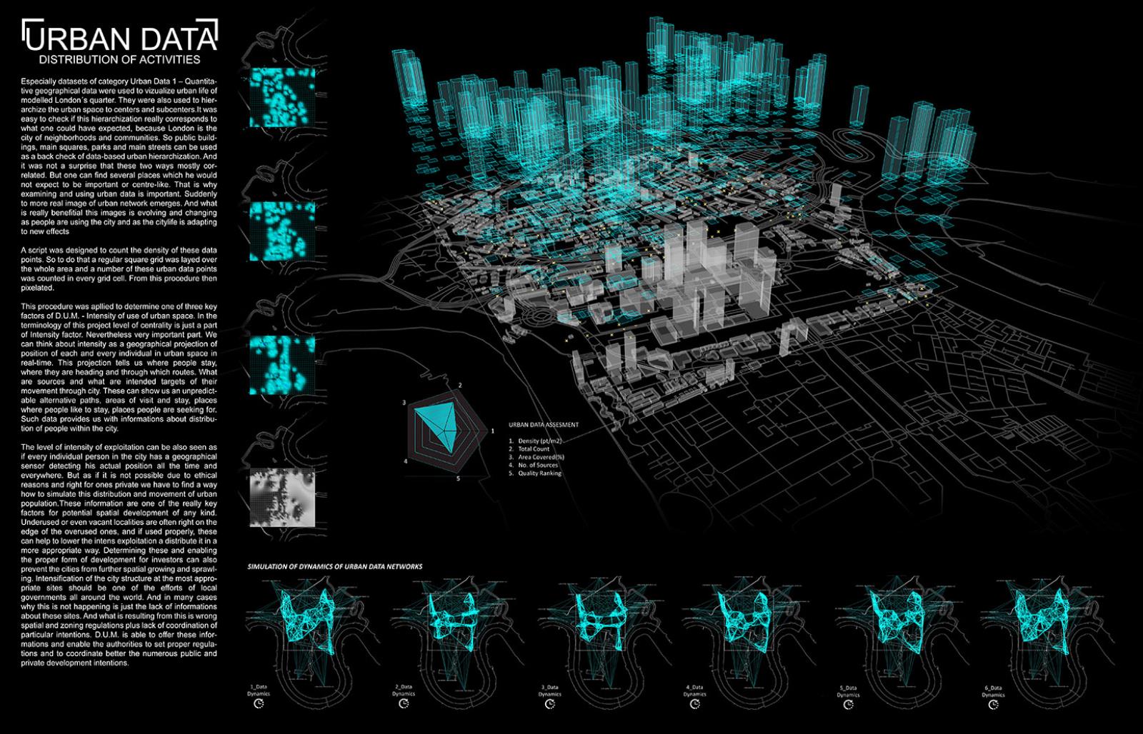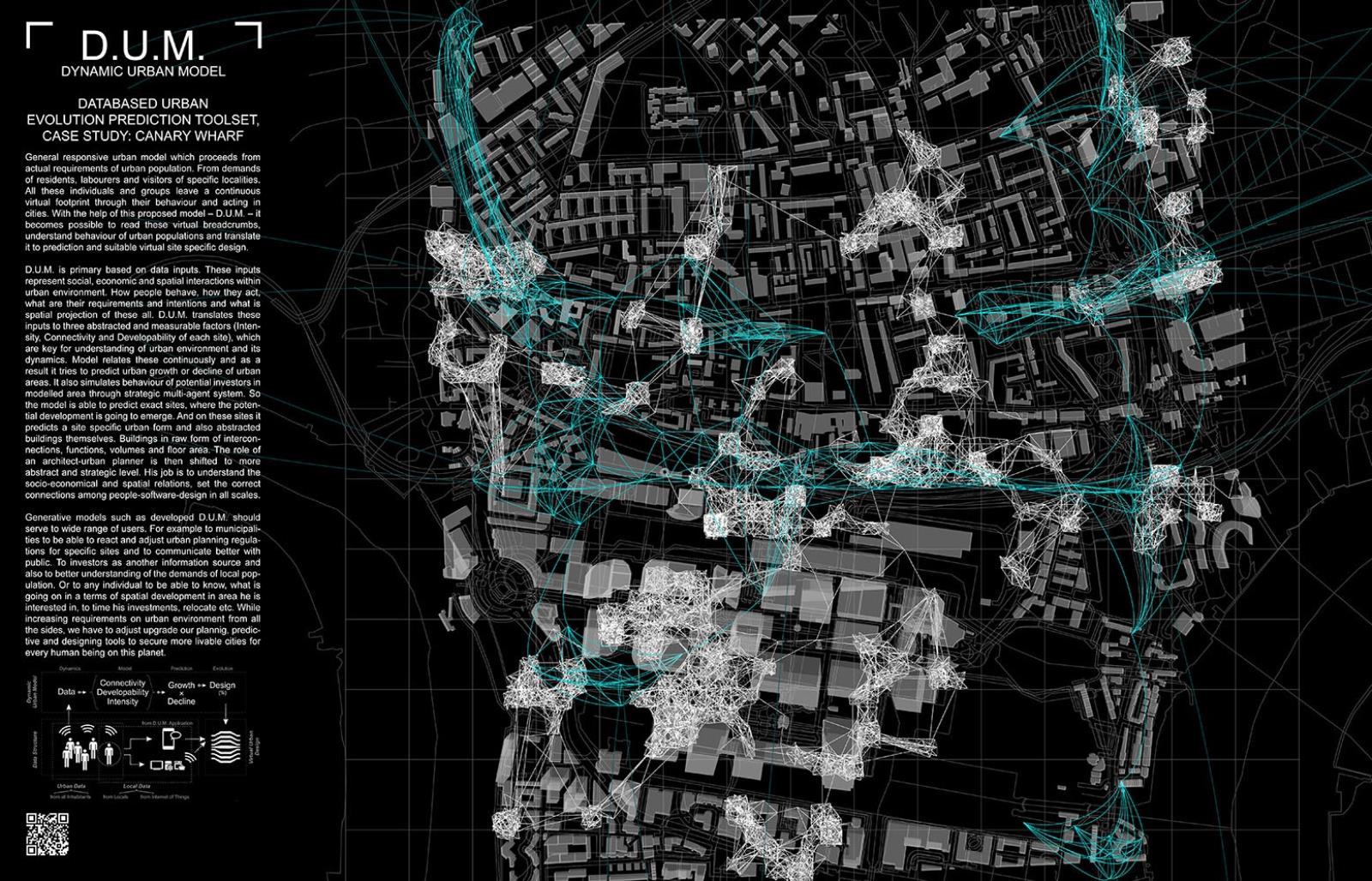 Responsive urban model which proceeds from actual requirements of urban population. From demands of residents, labourers and visitors of specific localities. All these individuals and groups leave a continuous virtual footprint through their behaviour and acting in cities. With the help of this proposed model – D.U.M. – it becomes possible to read these virtual breadcrumbs, understand behaviour of urban populations and translate it to prediction and suitable virtual site specific design.