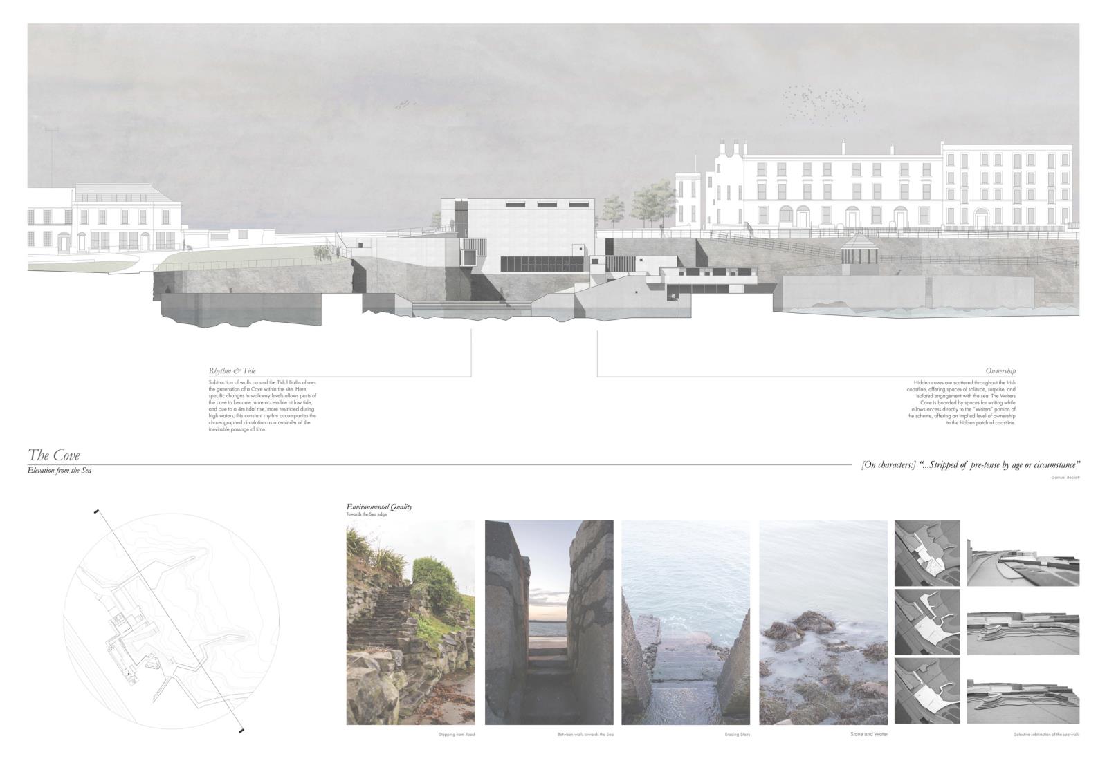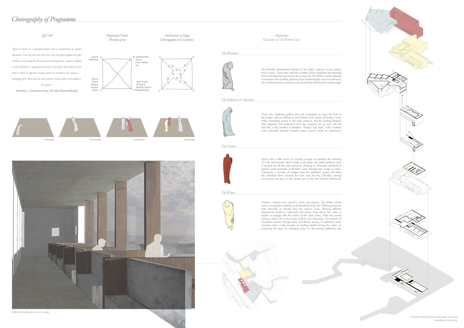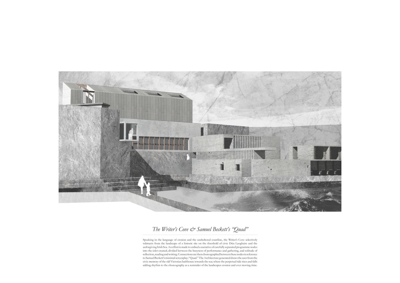 The Writers Cove: Samuel Beckett’s QUAD Part 1 Project 2016 Callum Holgate Ulster University | UK The Writers Cove is a centre for writers, performers, tourists and locals on the Dun Laoghaire coastline, Dublin. By selectively subtracting elements of the derelict Victorian bathhouse site, the centre creates a small, hidden cove between the busy townland and the rough Irish Sea. Each user group is offered a uniquely tailored journey, generated through an adaption of Samuel Beckett’s screenplay “Quad,” which reacts to context and local writing heritage. Tutor(s) James Luke
