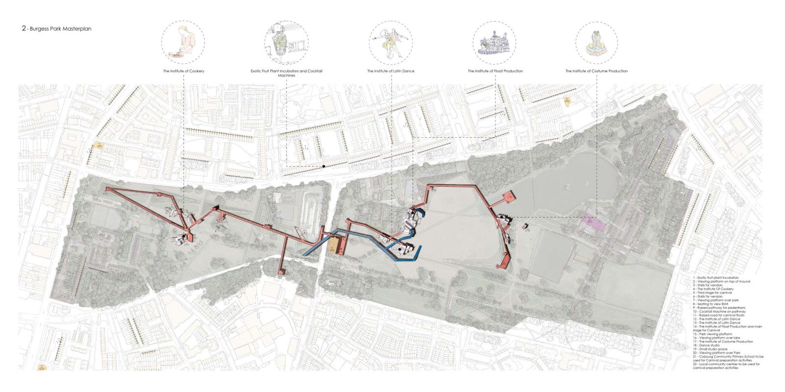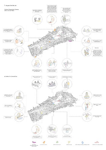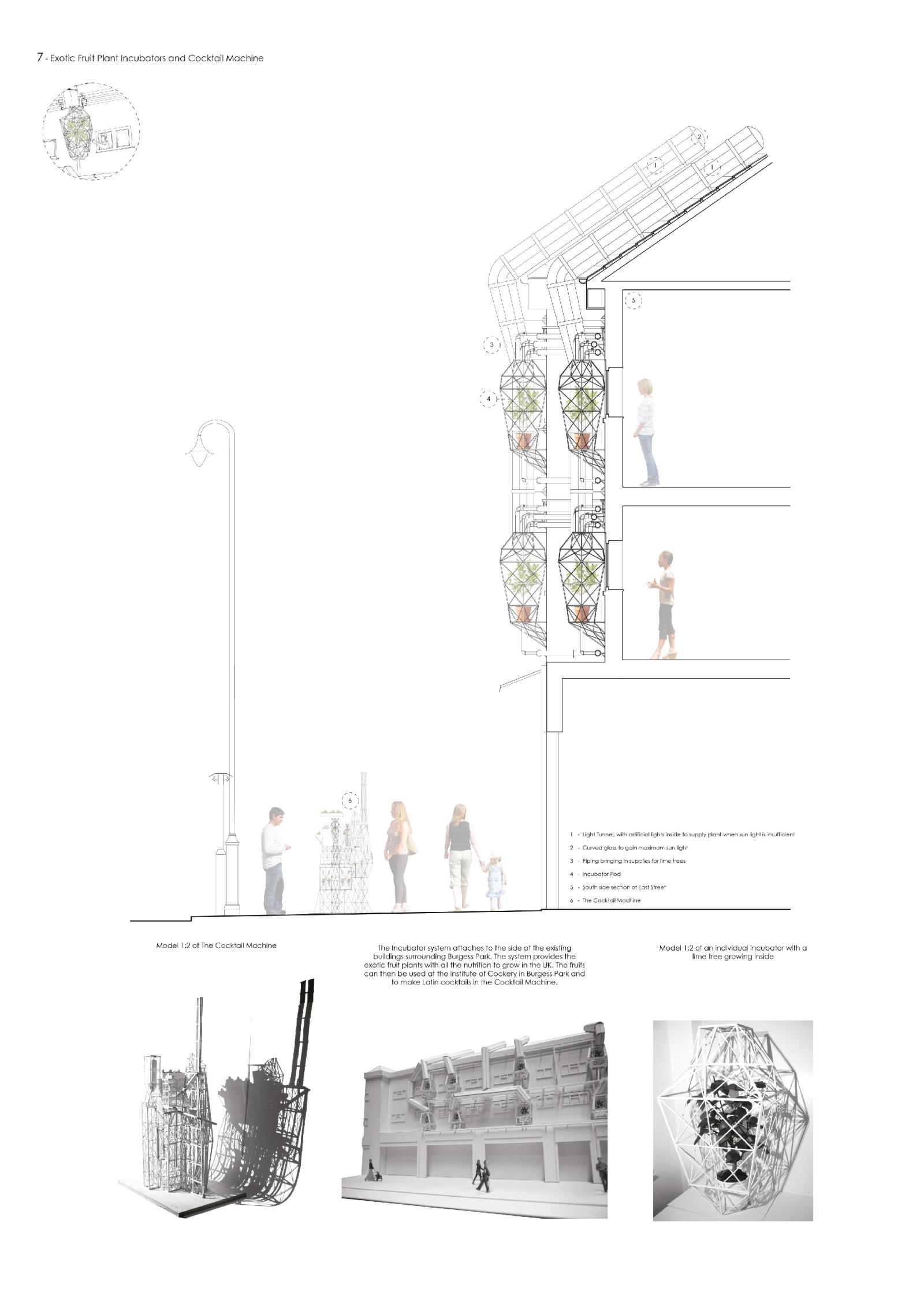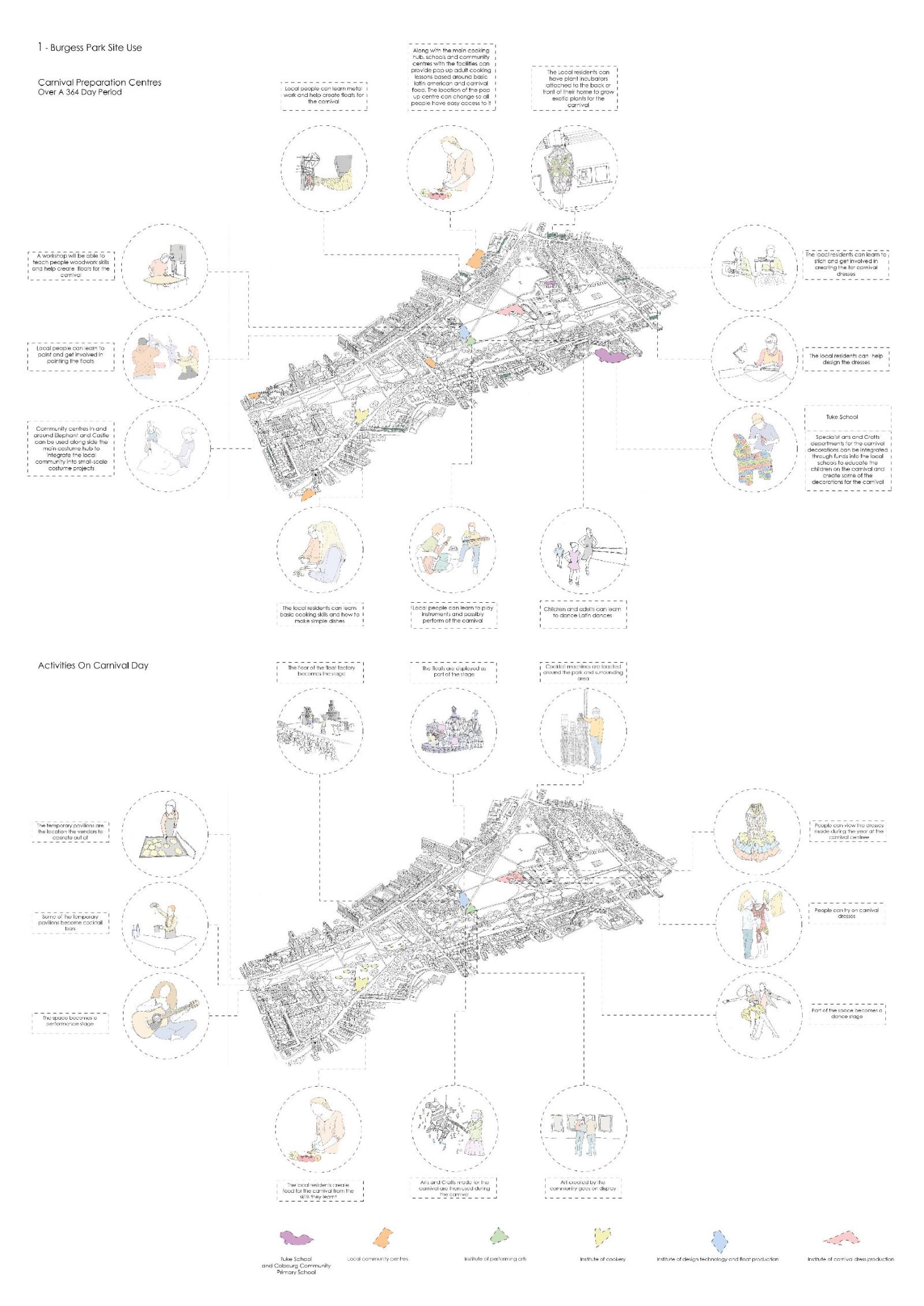 The Latin Community Carnival Part 1 Project 2016 James Goreing University of Brighton | UK The aim of the Latin Community Carnival is to engage with the local residents of Elephant and Castle by educating them in daily life skills that orientate around the carnival preparations, for instance learning dress making through designing and creating carnival dresses. The Carnival itself would also be interactive, incorporating mechanical cocktail machines into the festivities where carnival goers would pull on levers to create a carnival cocktail. Tutor(s) Pedro Gil Christo Meyer