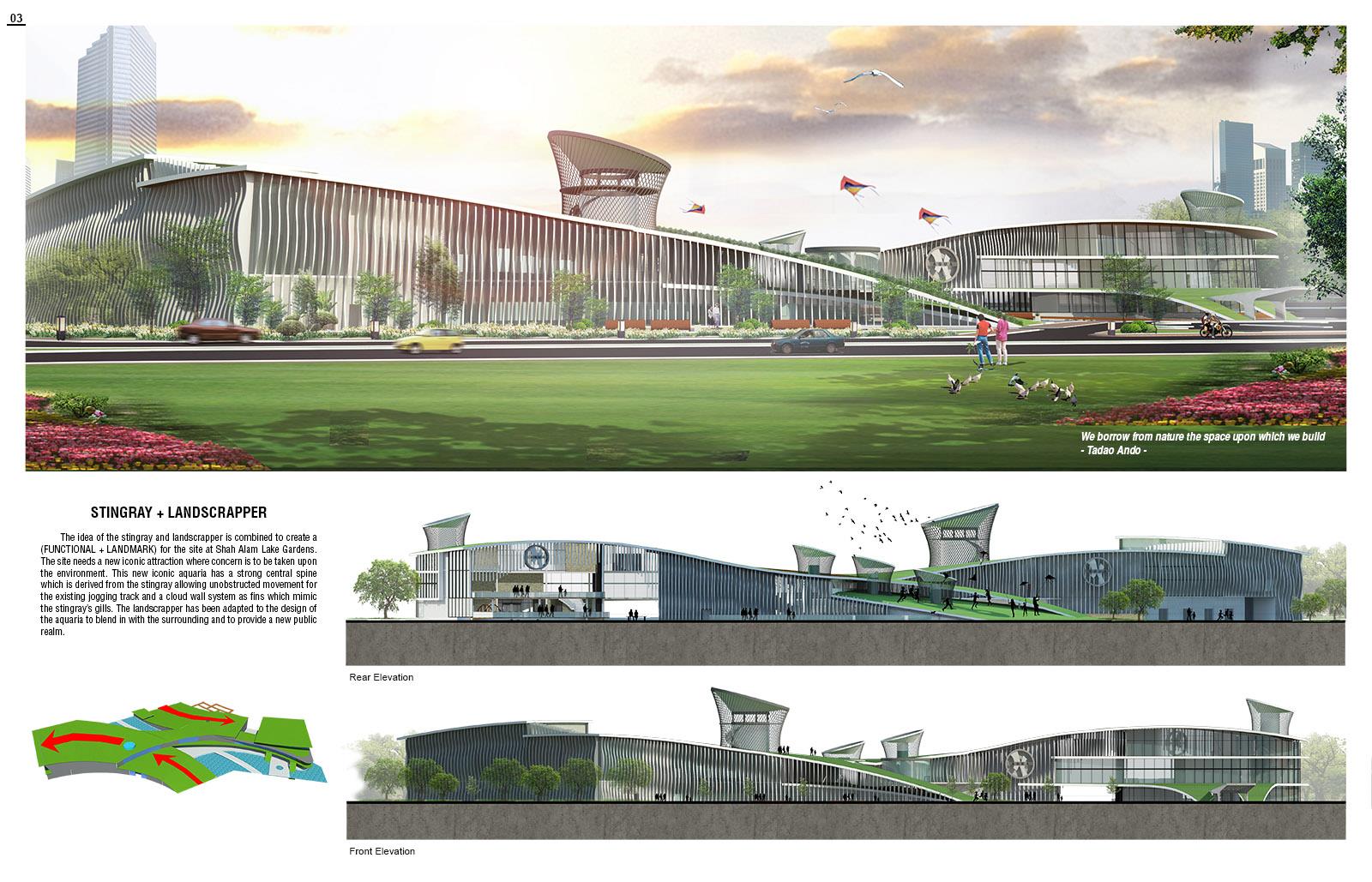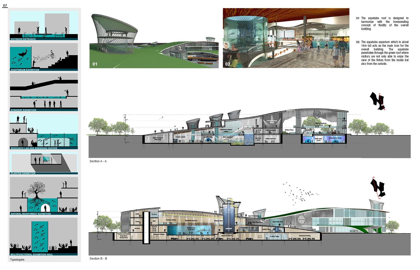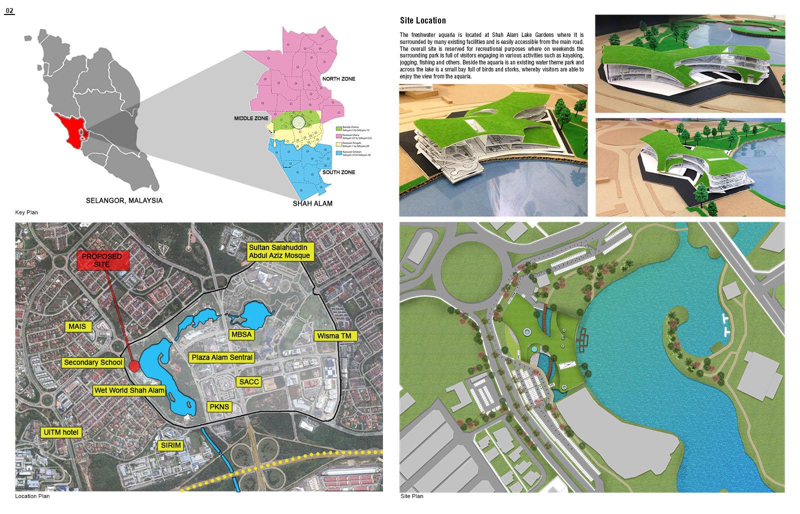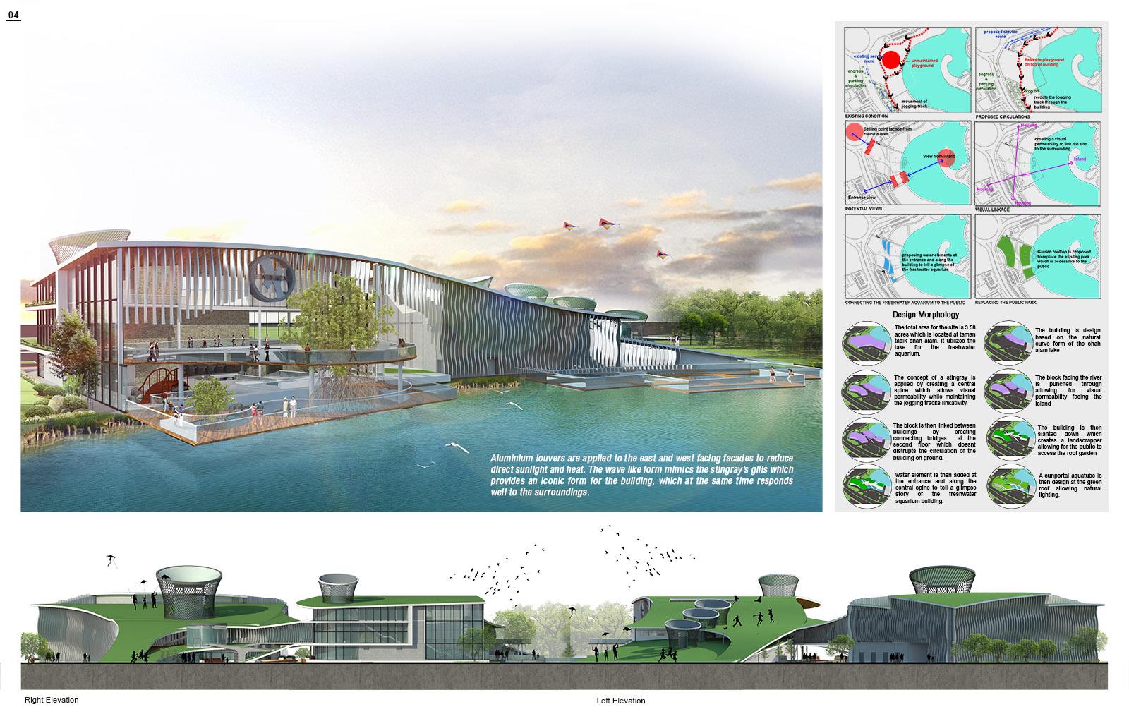 The project is an innovative freshwater aquarium, as opposed to saltwater, designed to educate the Malaysian public and tourists on freshwater eco-systems. Freshwater fishes in a myriad of form, size, shape, colour and movement are showcased within their various habitats. Its location at a freshwater lake garden in the Selangor capital city provides an introduction towards the aquaria. Its curvaceous form and green roof blends with the surrounding natural environment.
