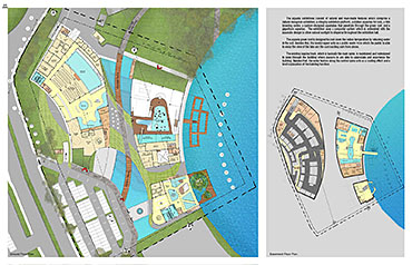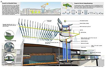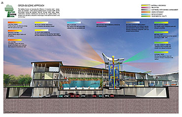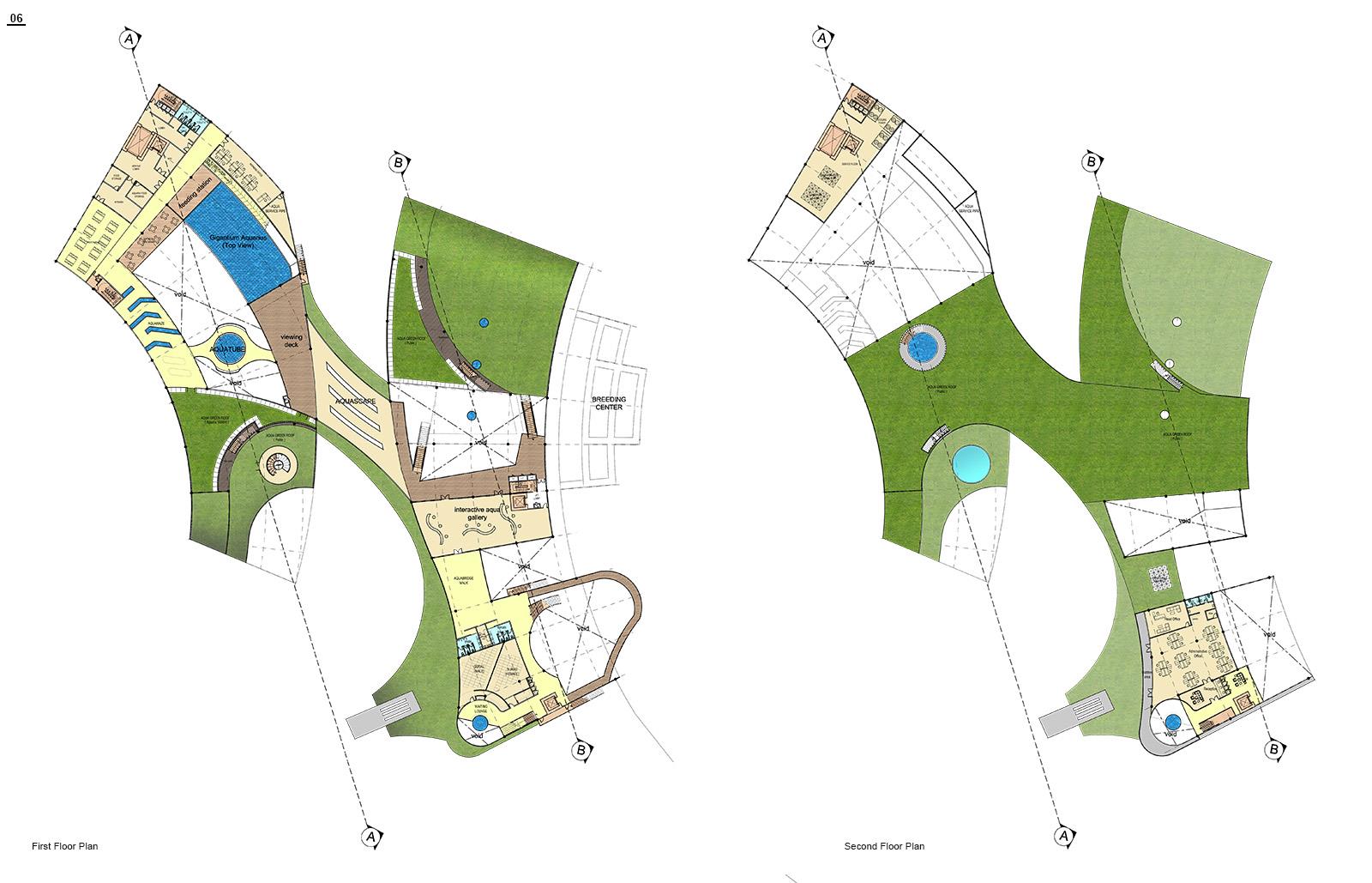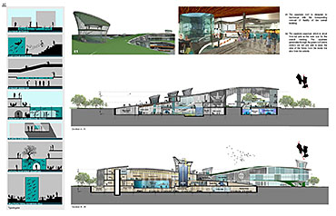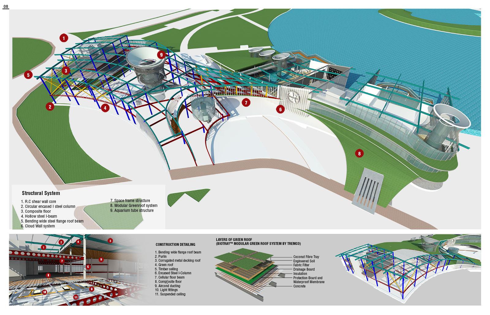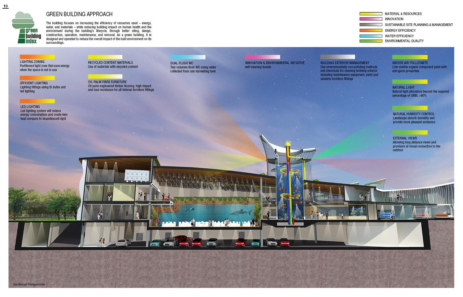 The project is an innovative freshwater aquarium, as opposed to saltwater, designed to educate the Malaysian public and tourists on freshwater eco-systems. Freshwater fishes in a myriad of form, size, shape, colour and movement are showcased within their various habitats. Its location at a freshwater lake garden in the Selangor capital city provides an introduction towards the aquaria. Its curvaceous form and green roof blends with the surrounding natural environment.