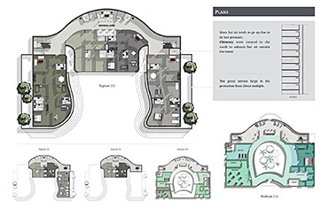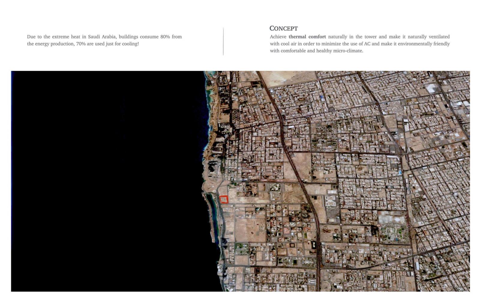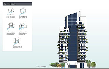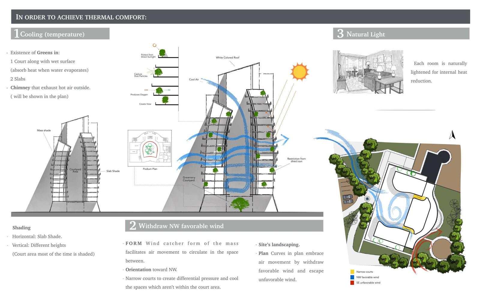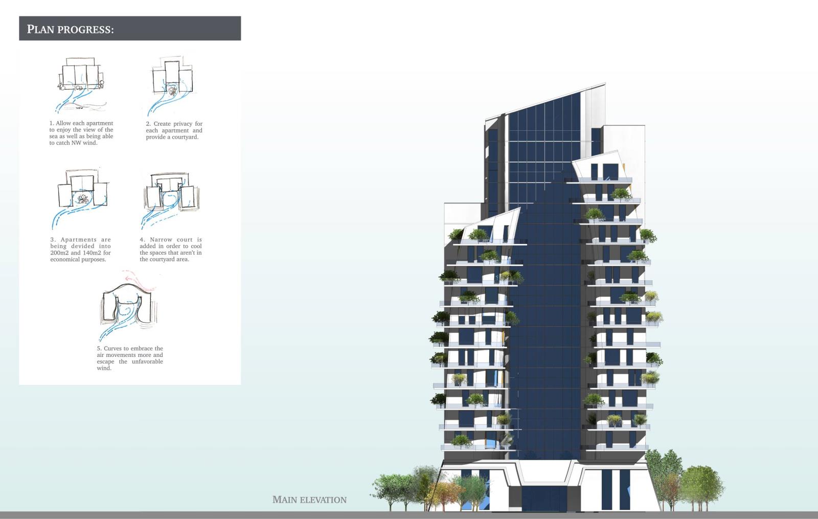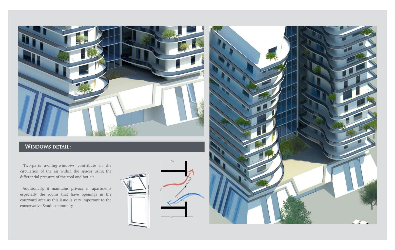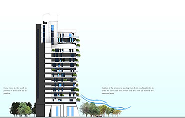 As a response to this issue, the proposed project aims to achieve thermal comfort and natural ventilation in the tower. The building orientation catches the favorable wind, the mass differential heights act as a wind catcher and facilitate air movements, the existence of a courtyard and further solutions were adapted.