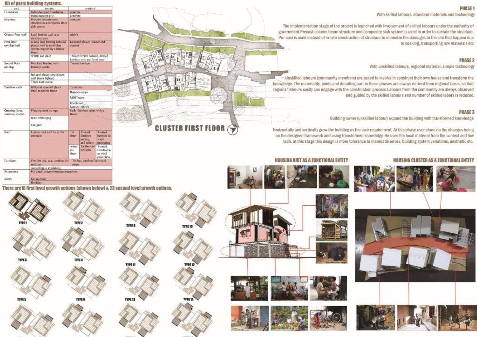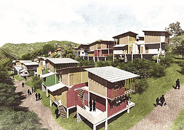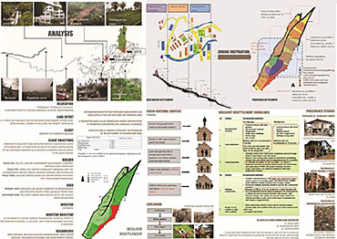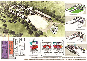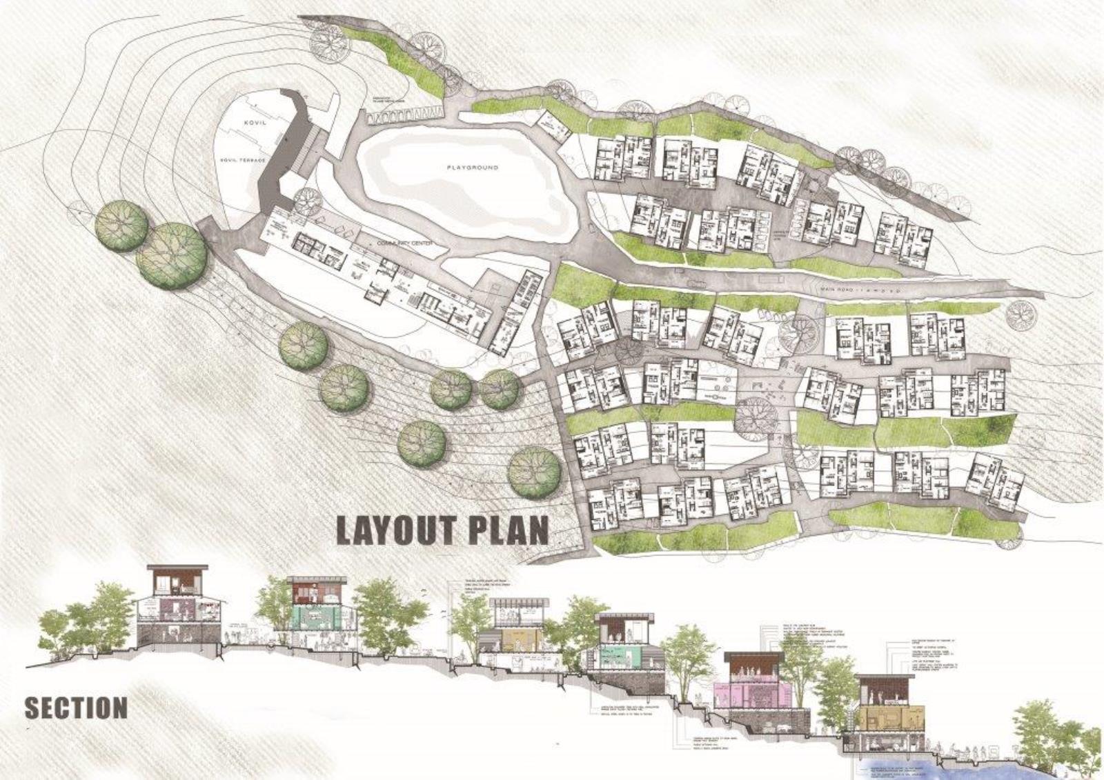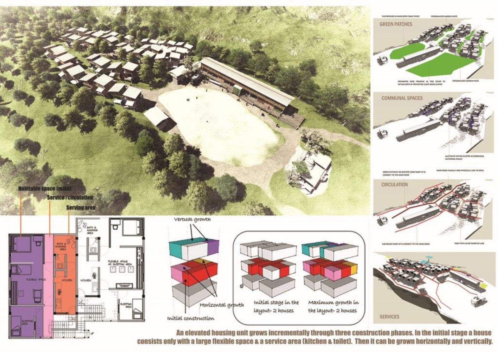 This project encompasses a ‘resettlement program’ for a community displaced by a landslide that killed more than 70 inhabitants. Responding to concerns of time, cost and building system resolution for landslide vulnerability, the project supports the socio-communal values of a community moving forward with a new site and a new life. Subsequently, the project tackles the program-specific restrictions, challenges and possibilities of environmental, social, cultural, economical and technological contexts.