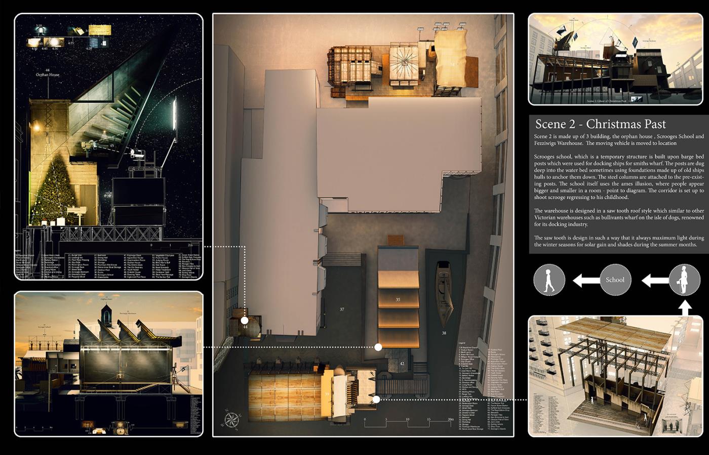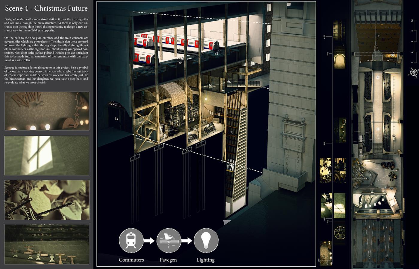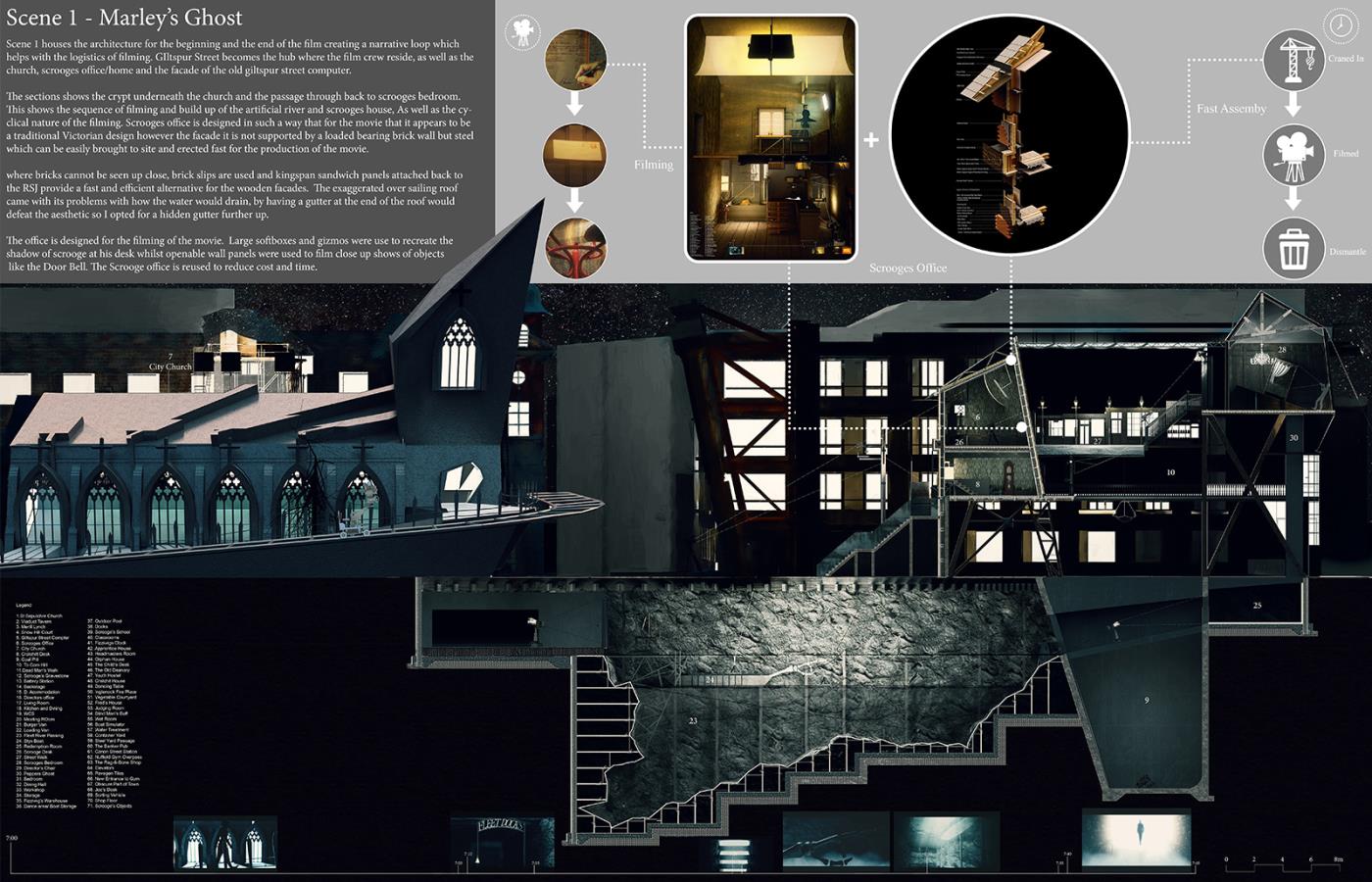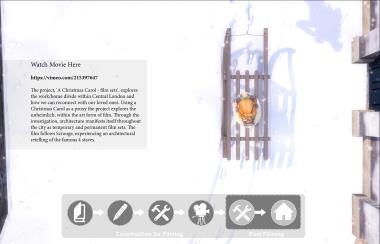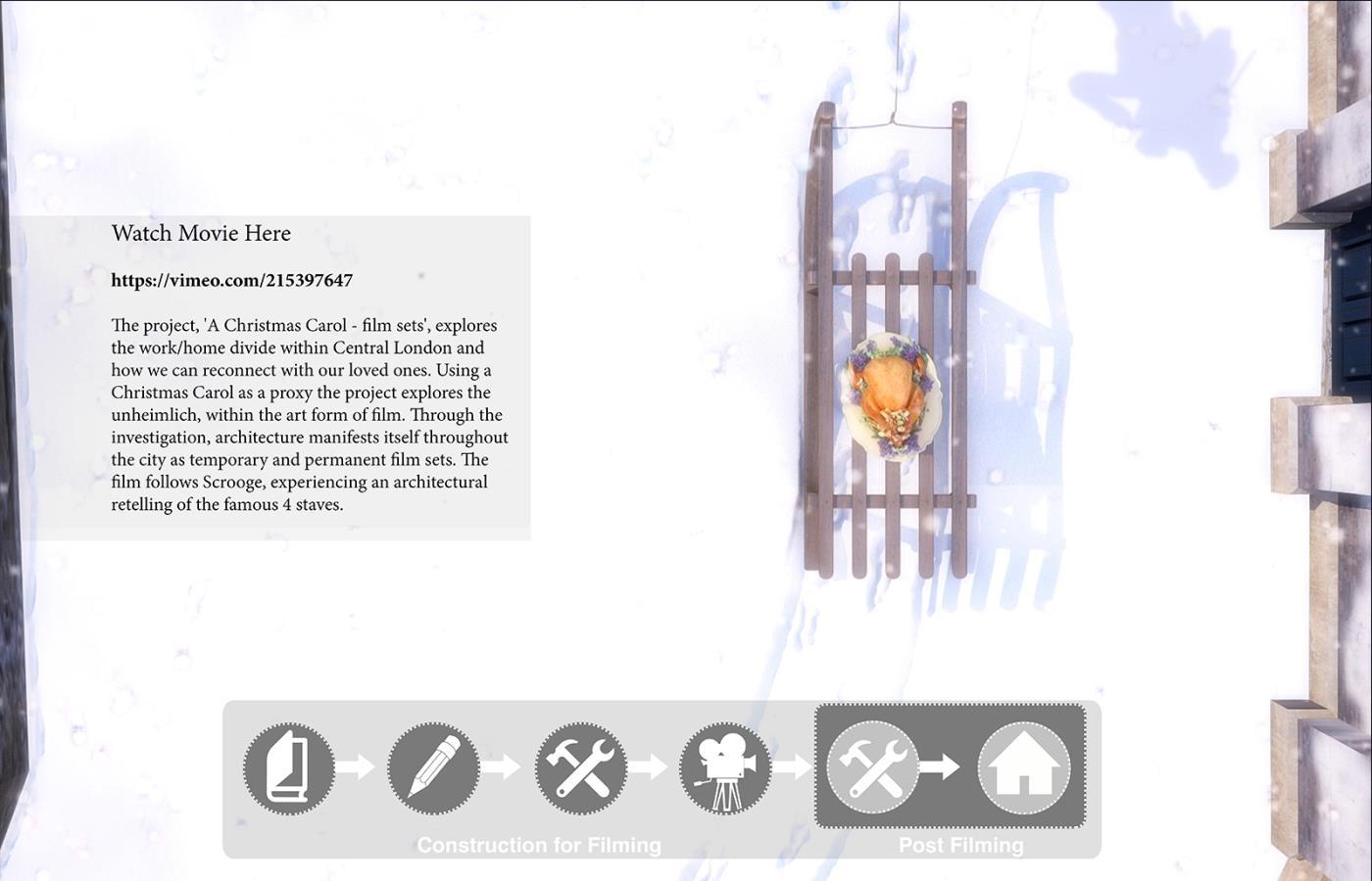 A Christmas Carol - Film Sets Part 2 Project 2017 Bradley Sowter University of Kent | UK The project, 'A Christmas Carol - film sets', explores the work/home divide within Central London and how we can reconnect with our loved ones. Using a Christmas Carol as a proxy the project explores the unheimlich, within the art form of film. Through the investigation, architecture manifests itself throughout the city as temporary and permanent film sets. The film follows Scrooge, experiencing an architectural retelling of the famous 4 staves. Tutor(s) Adam Cole George Thomson
