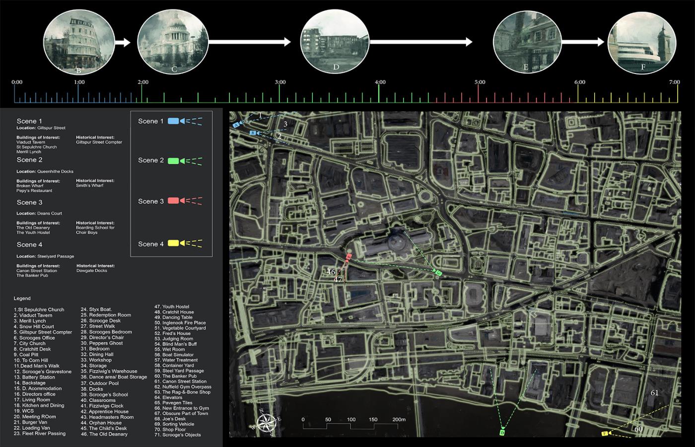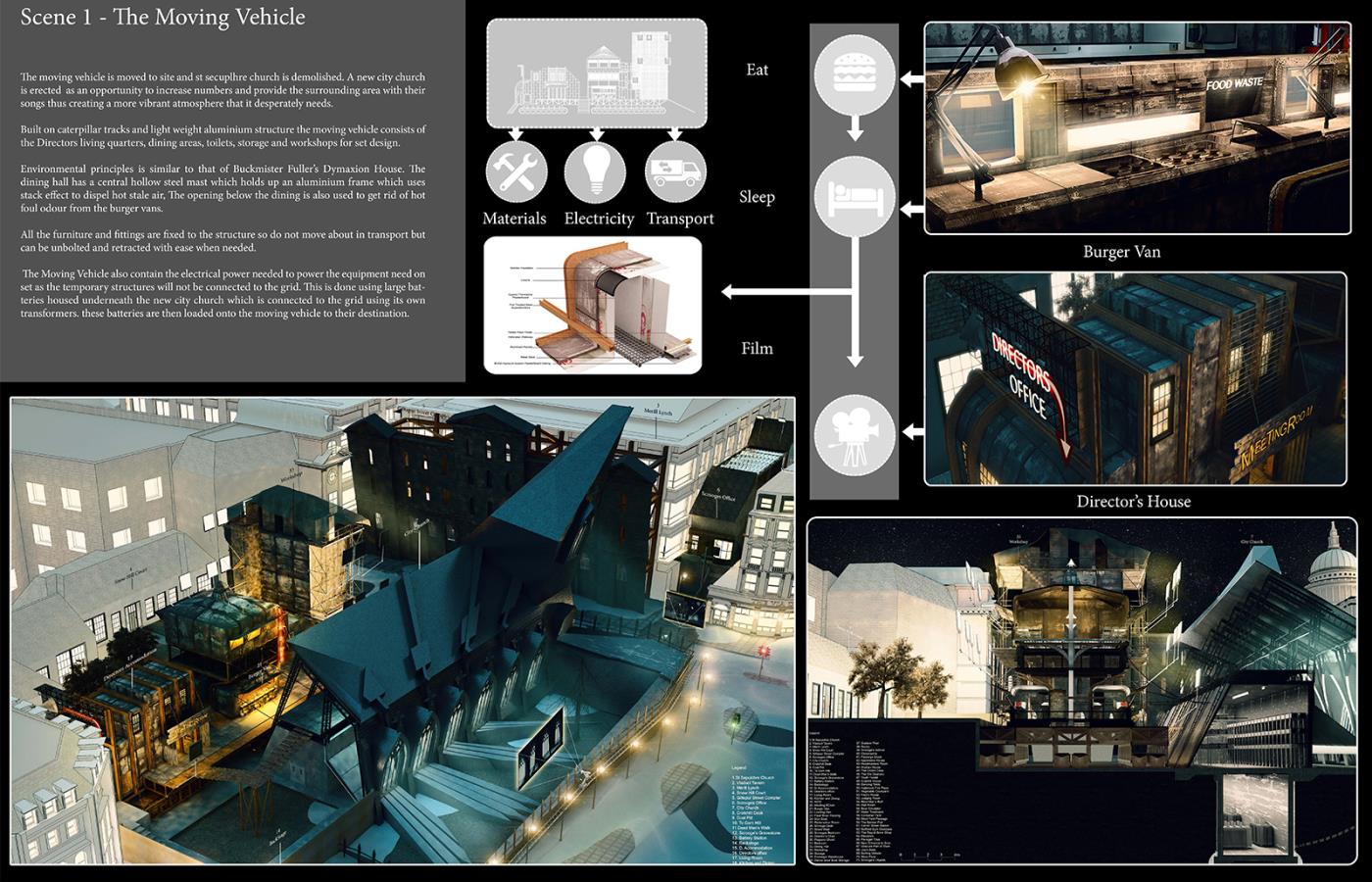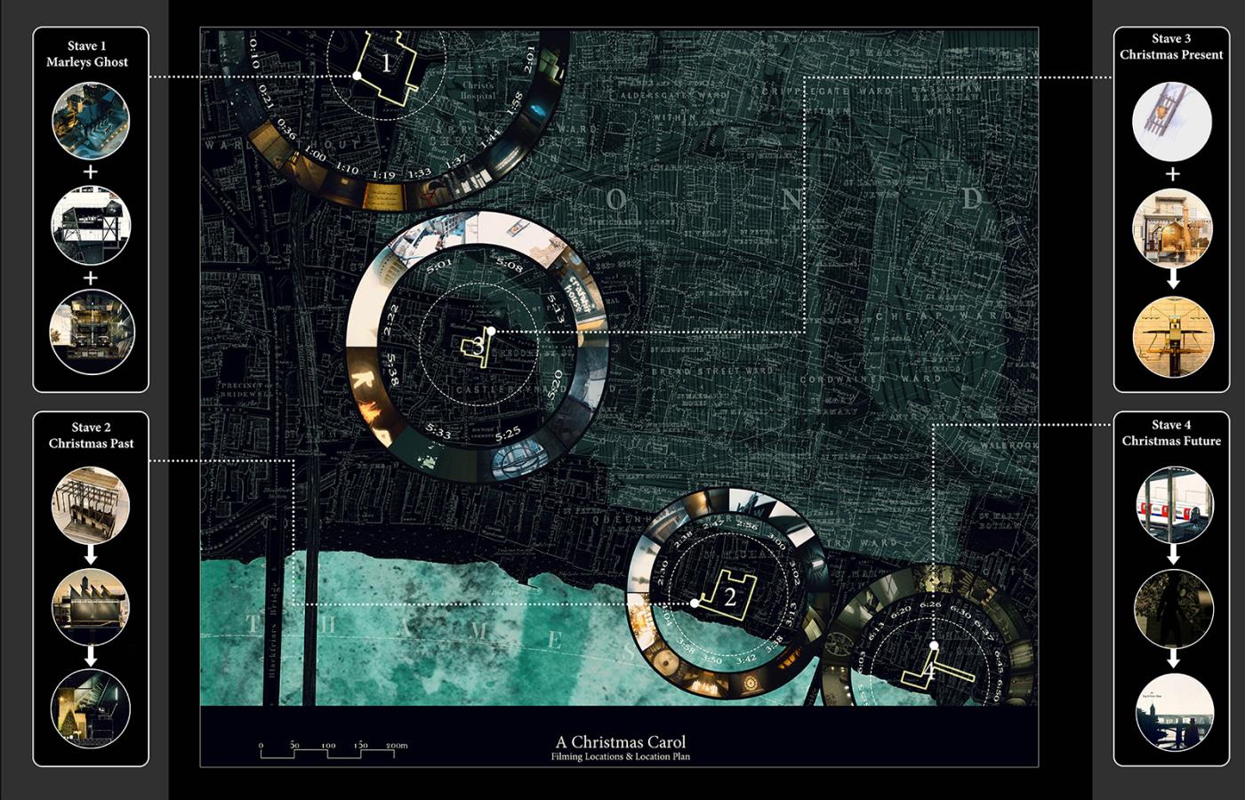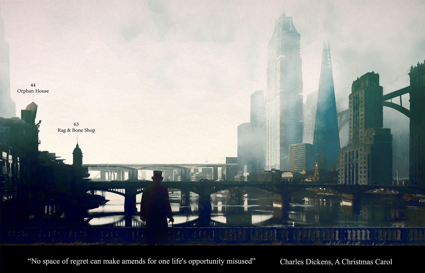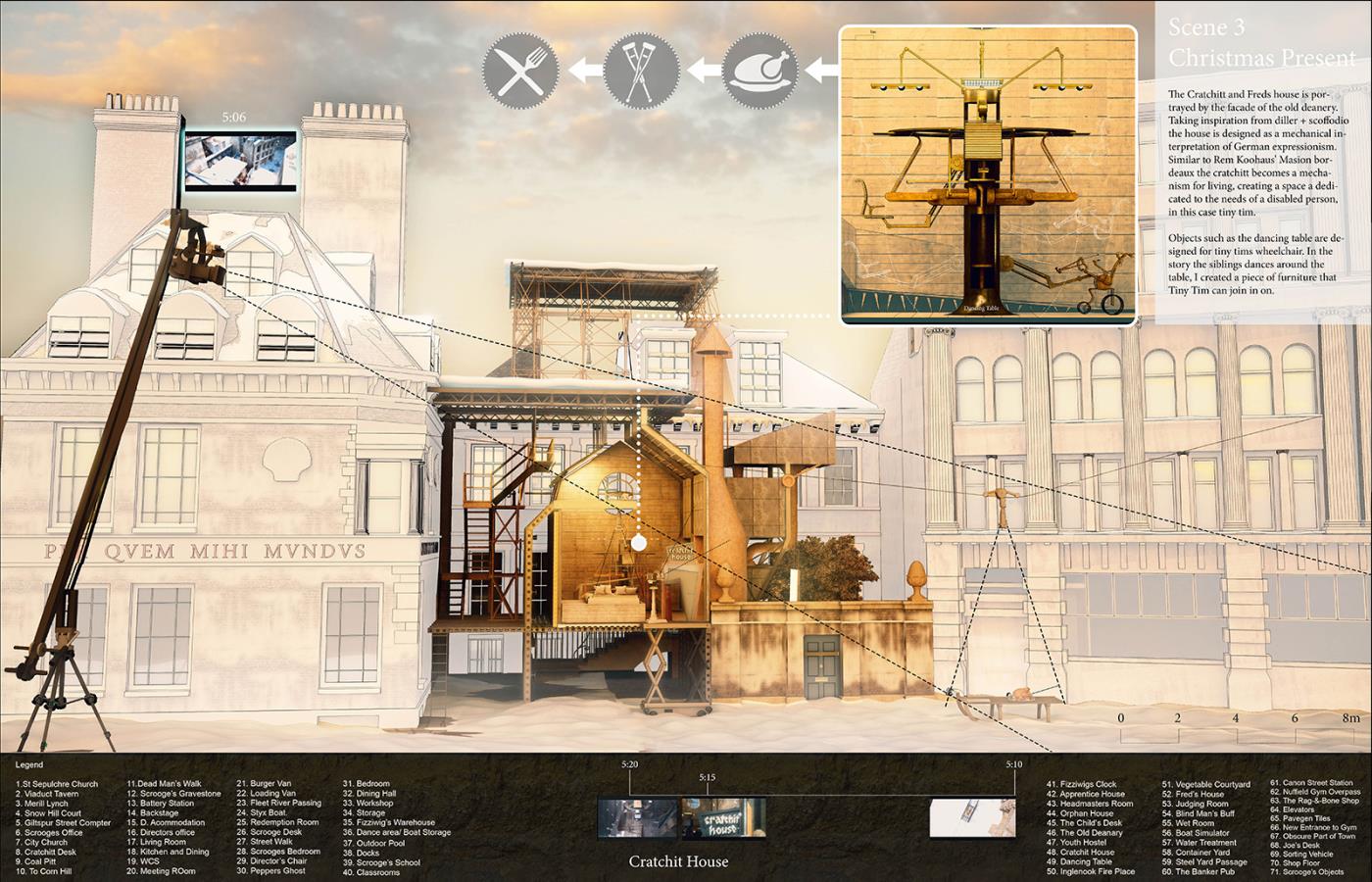 A Christmas Carol - Film Sets Part 2 Project 2017 Bradley Sowter University of Kent | UK The project, 'A Christmas Carol - film sets', explores the work/home divide within Central London and how we can reconnect with our loved ones. Using a Christmas Carol as a proxy the project explores the unheimlich, within the art form of film. Through the investigation, architecture manifests itself throughout the city as temporary and permanent film sets. The film follows Scrooge, experiencing an architectural retelling of the famous 4 staves. Tutor(s) Adam Cole George Thomson