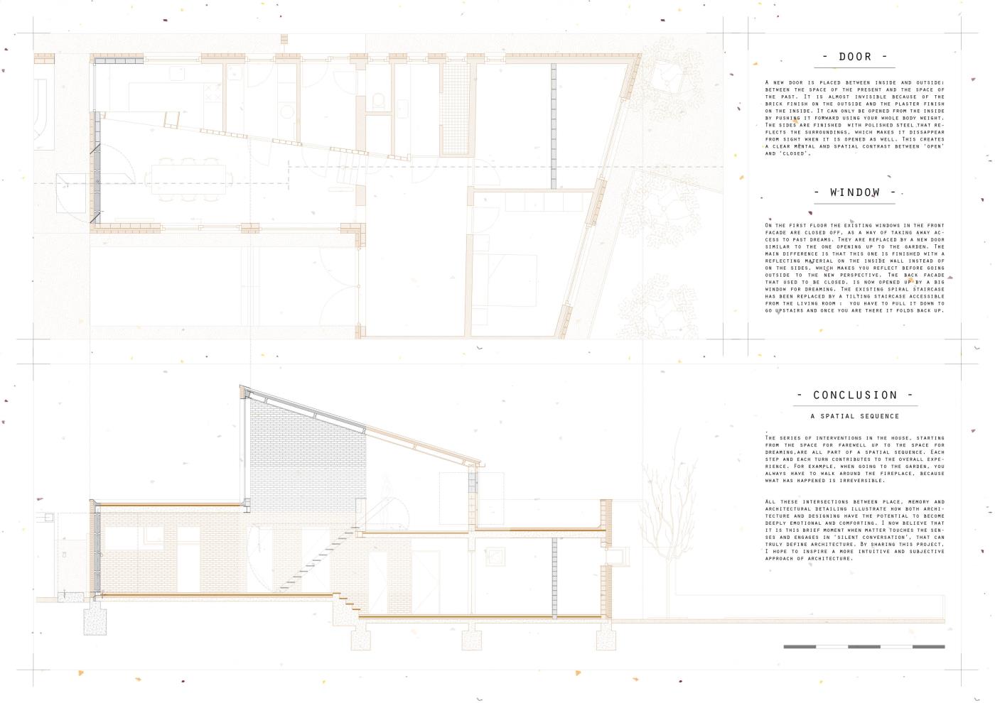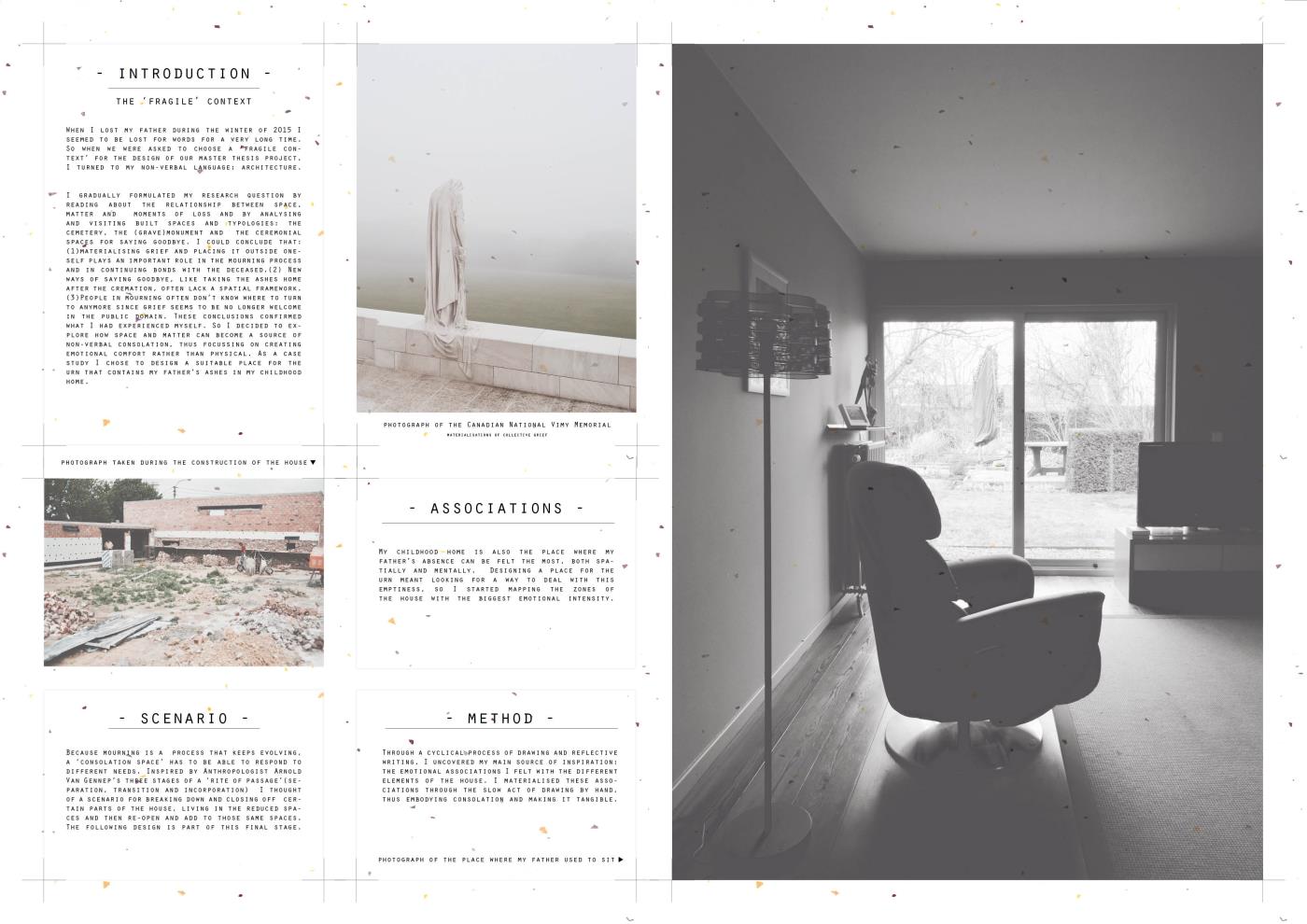 The Emotional Potential of (Making) Architecture: Embodying Consolation Part 2 Project 2017 Eva Demuynck Catholic University of Leuven | Belgium As a way of coming to terms with the recent loss of my father, my main focus for this master thesis project was researching how space and matter can offer non-verbal consolation. I did this while designing a series of spatial interventions in my childhood home. The resulting intersections between place, memory and architectural detailing, illustrate how both architecture and designing have the potential to become deeply emotional and comforting. Tutor(s) Thierry Lagrange Johan Van Den Berghe