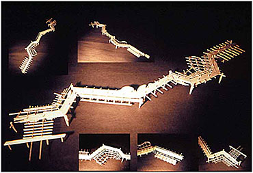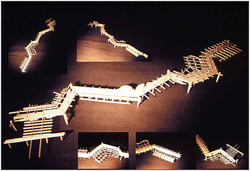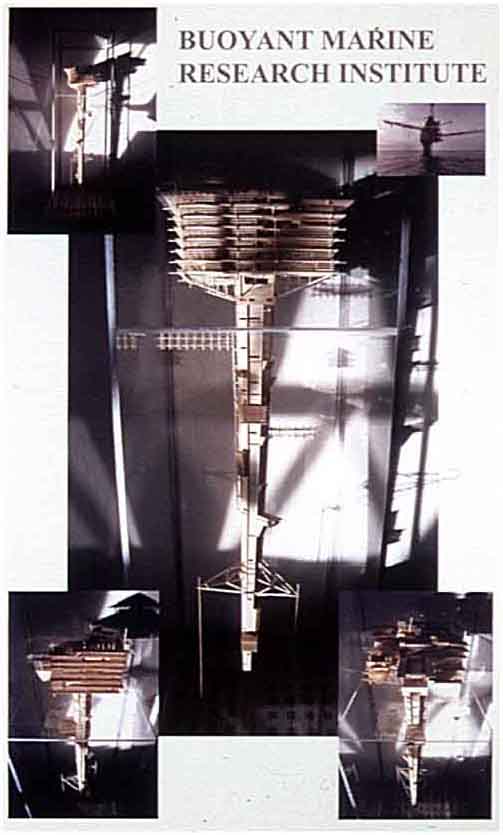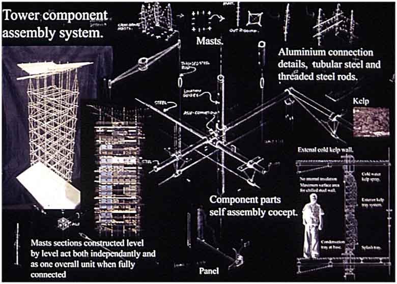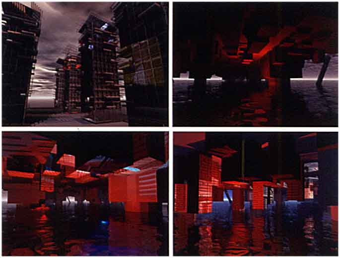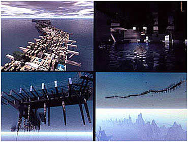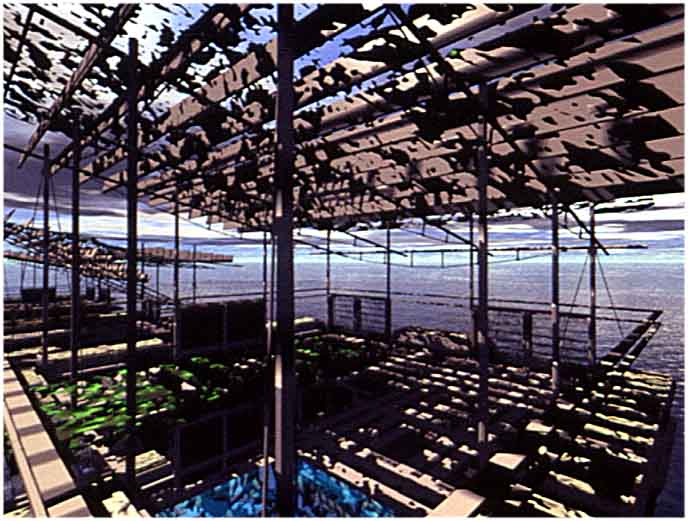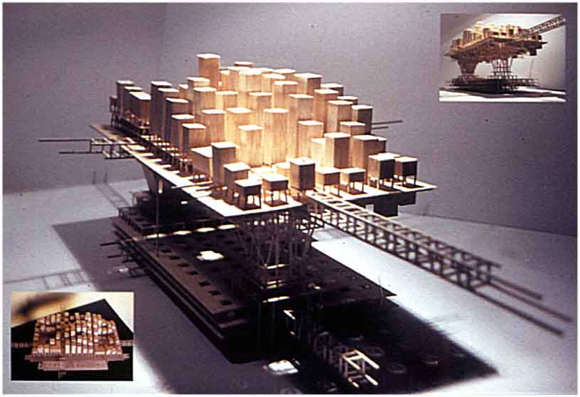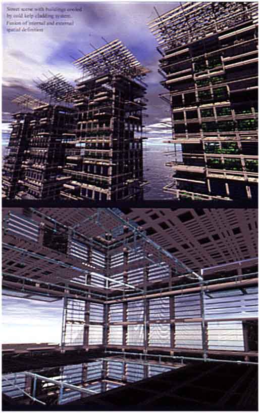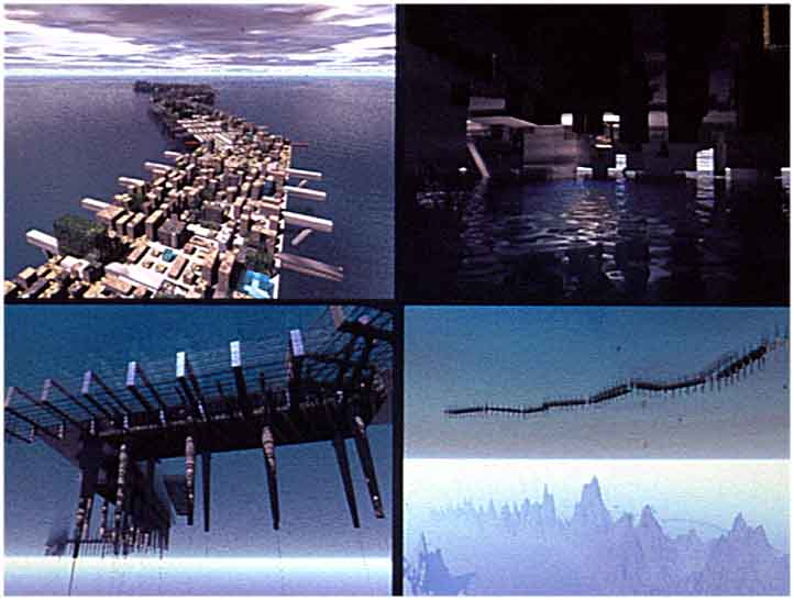 Floating City Part 2 Project 2000 Jamie Bromley Oxford Brookes University Oxford | UK FLOATING CITYThe brief for the project was two-fold: firstly, to explore the effect that scale and hierarchy have on our attitudes to architecture and the city; and secondly, to propose innovative new ways for people to live in the modern capitalist city.In the light of mankind's exponential technological development, continually pushing the boundaries of our knowledge, we are able to explore and analyse the furthest corners of the universe. What this study suggests is that the new frontier for mankind might be far closer to home. Seventy one percent of our planet's surface is water. Living on this planet successfully in future will undoubtedly involve an far more intricate understanding of the potential of our oceans. Hence the project consists of a design for a floating city as a preliminary investigation of our ability to adapt to and successfully inhabit the oceans, with the view of maybe one day alleviating the pressure on land and the damage to its fragile ecosystems.The technology and experience are already well established for the creation of artificial islands. Far from being a monastic-style retreat into the past, this new type of city would have to embrace adavanced technology to survive. Resources such as food, power, and above all space, are abundant in the oceans; however, they are themselves part of equally delicate ecosystems. Any development on open water would also be subject to scrupulous ecological considerations, paramount for any development in this age. This city was conceived as an opportunity to implement a kind of break from our present, resource-squandering consumer society. An integral part of this new beginning is rooted in collective ideas for controlling capitalism, ensuring that the city could never fall into the hands of faceless multi-national corporations. The economy of the city needs to remain at a intermediate scale, returning money to its proper role as the servant of productive and consumptive activity.The linear form of the city follows a natural fault line of divergent tectonic plates that are located in the Pacific Ocean to the east of the Philippines, above the so-calleld 'ring of fire'. The city is essentially a semi-submersed, buoyant, tethered megastructure that is anchored to the seabed and positioned above hydrothermal vents, which supply energy to the city in the form of super-heated water. The dynamic behaviour of the mega-structure is similar to an inverted multifilar pendulum, where excess buoyancy plays the roll of gravity and the megastructure is held level by the pantograph-like configuration of the tension legs. The air-deck accommodation (everything above sea level) comprises of a grid system of high-density individual towers, 8 metres by 8 metres, with 5 metres of separation between them. Organized around central courtyards and market places, the intention is for the clustered towers to provide maximum three-dimensional permeability to pedestrians as well as cooling ocean breezes and light. In contrast to the scale, mass and inertia of the megastructure below, the urban experience of the air-deck towers helps to create a smaller, more human scale.The towers are constructed from tensile, lightweight, self-assembly component systems, reflecting in their design a fusion of external and internal space, and an overlap of spatial definition made possible by the tropical location. For these tensile structures, certain solutions have been developed that would be unique to the floating city, including sea kelp cold-wall cladding systems and sea kelp particleboards. The result is a city that would be dramatically unlike any other. The streetscapes of myriad kelp cladding systems would glisten in the sunlight as the buildings were kept cool, drenched in nutrient-rich chilled sea water that has been retrieved from the depths of the ocean. Large one-off structures are dotted throughout the city grid, and a multi-level research institution plus university would form the economic hub for the development of marine-based technological studies. Sites for open-air markets, or for relaxing in parks and beaches, would be appended as demanded by the city's inhabitants. Food and sources of kelp for construction would be grown in floating fields located either to the side or underneath the main megastructure.What I want to ask through this project is quite direct. Dare we assume that our land resources will sustain us in the future? Dare we even imagine that all of our land will exist, given potential climatic changes ? The evidence is convincing in favour of the massive resources and opportunities that the oceans represent for our future. The proposal here suggests hundreds of thousands of people inhabiting 1.5 square kilometres of ocean; that is 1.5 square kilometres out of a possible 360,000,000 square kilometres that are available. JAMIE BROMLEY - FLOATING CITYJamie's project for a protoype floating city achieves that rare quality of being both highly idealised and seriously pragmatic. His solution to the problems of population explosion and land scarcity is to construct enormous urban centres which can float on the three-fifths of the earth's surface that is covered with ocean. These new cities can also take advantage of the incredible thermal currents that are created by underwater volcanoes at the fissures in tectonic plates, providing abundant and constantly replenishable energy. Jamie's vision is for a dense complex city that combines the structural advantages of giant oil-platforms and no-nonsense urban grids, and yet mixes these with all the chaos and dramatic incident offered by high density living. What is described is a kind of floating Manhattan or Hong Kong, but with a far more ecological bent. Anyone who has been to Iceland will know of the benefits of super-abundant geothermal power - low costs, no pollution, endlessly replenishible resources, fuel co