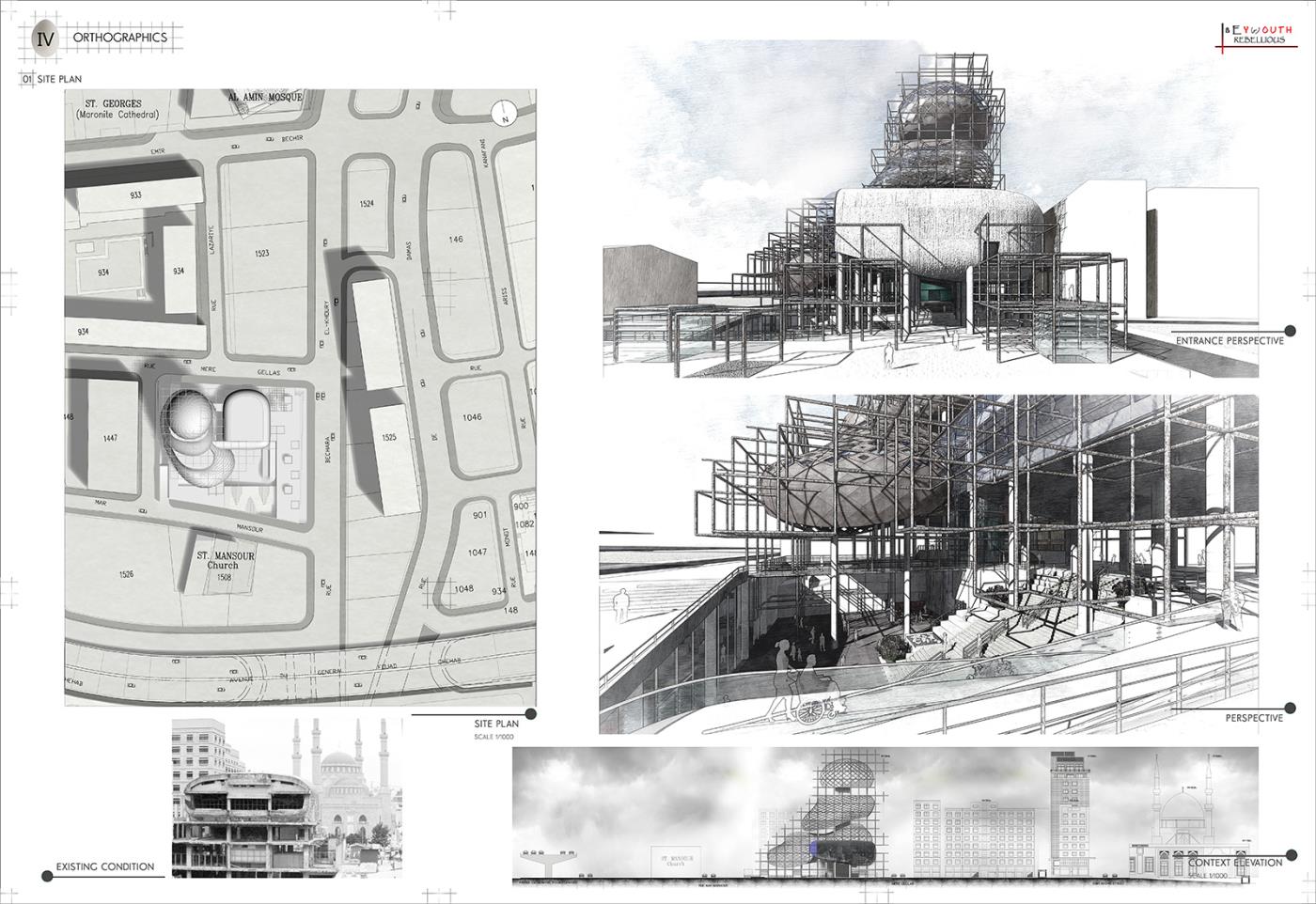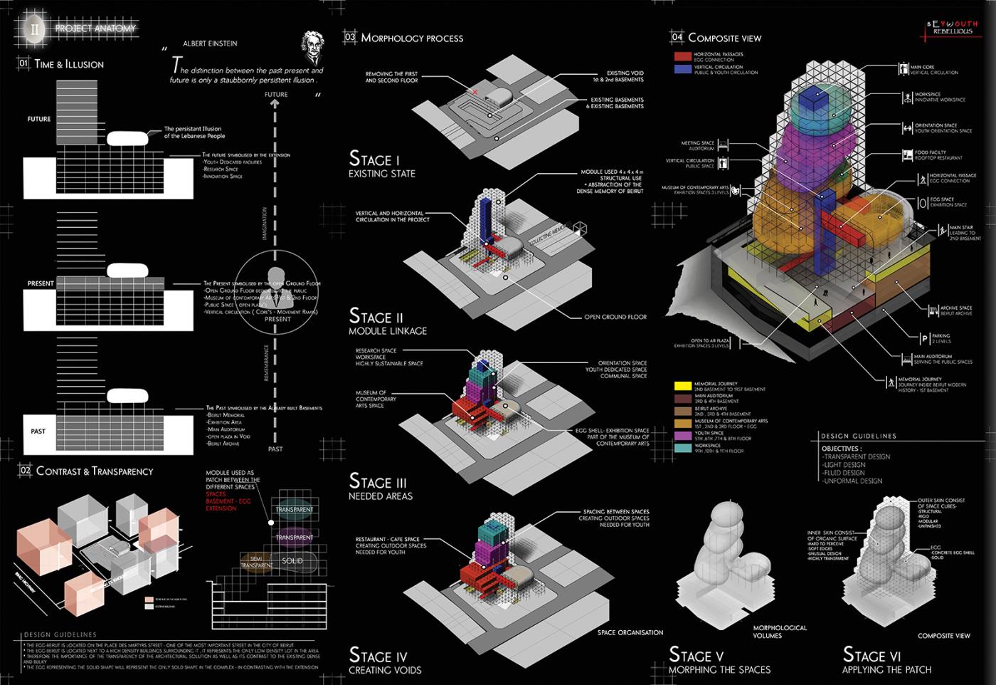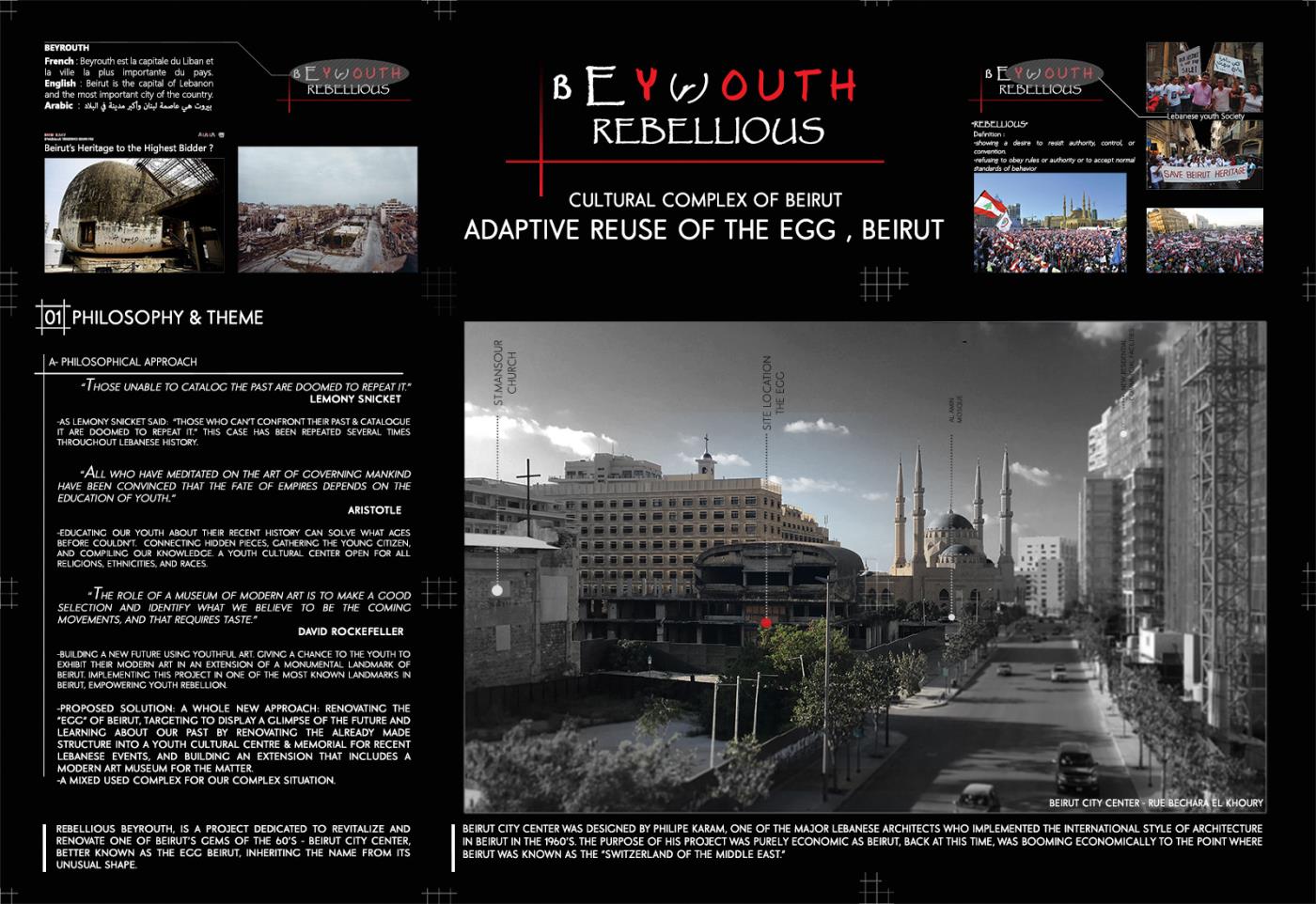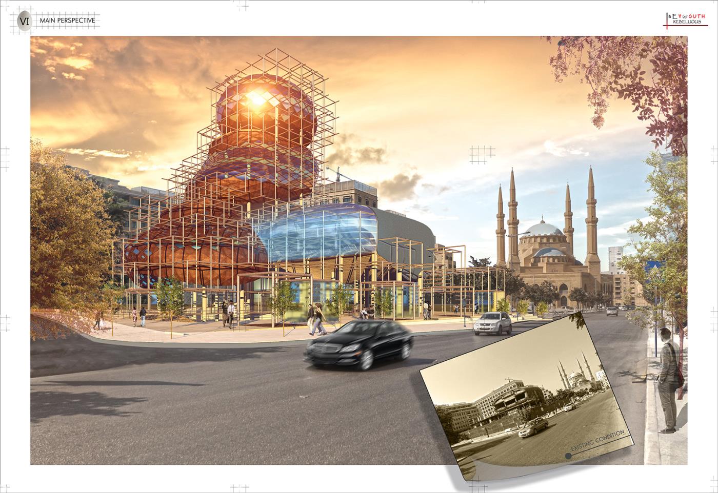 Beyrouth Rebellious Part 2 Project 2017 Bahaa Aboul Khoudoud Beirut Arab University - Debbieh campus | Lebanon Rebellious Beyrouth, is a project dedicated to revitalize and renovate one of Beirut’s Gem of the 60’s, Beirut City Centre, better known as The EGG Beirut, inheriting the name from its Unusual shape & designed previously by Joseph Philippe Karam.The proposed project includes the renovation of the forgotten ruin to a facility dedicated to the youth society of Lebanon & the History of Beirut. Tutor(s) Nader Azab Hesham El-Arnaouty Ibtehal El-Bastawissi