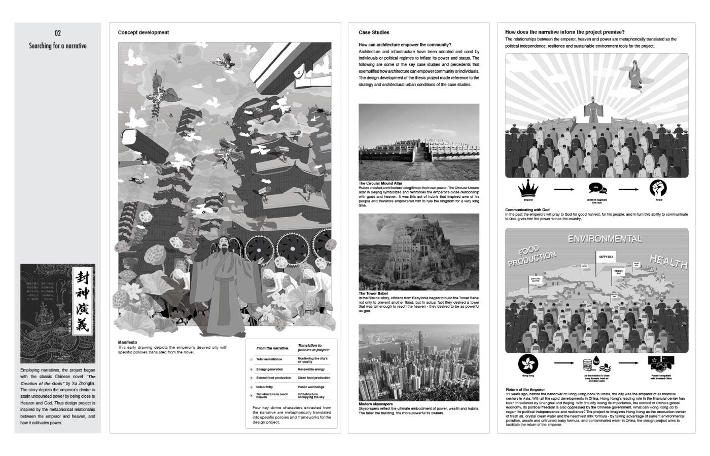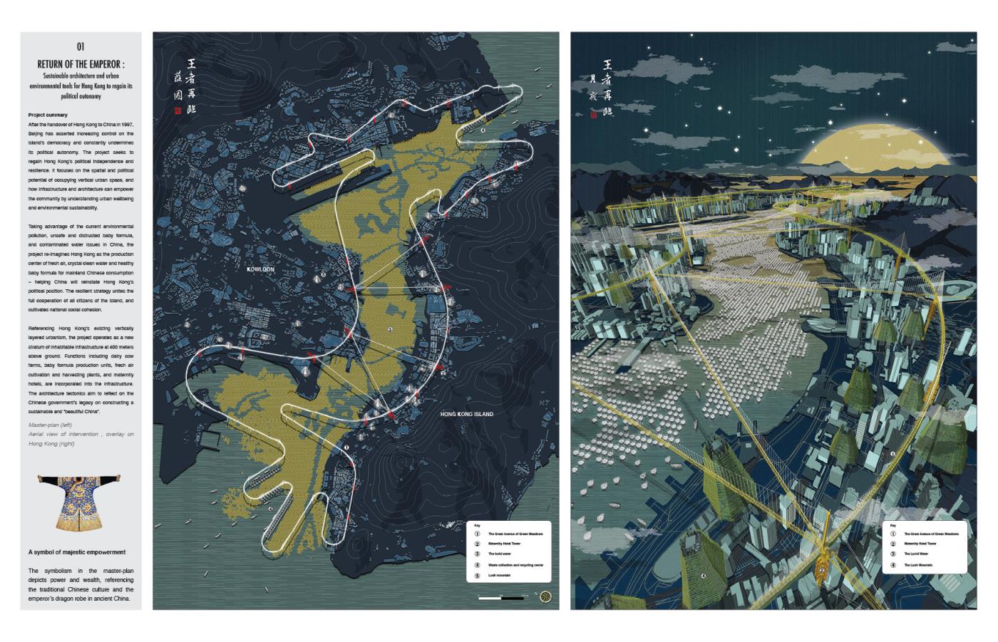 Return of the Emperor: Sustainable Architecture and Urban Environmental Tools for Hong Kong to Regain its Political Autonomy Part 2 Project 2018 Ivan Tsz Long Chan Aarhus School of Architecture | Denmark Since the handover of Hong Kong back to China in 1997, Beijing has asserted increasing control on the island’s democracy. As a response, the project seeks to regain and redefine Hong Kong’s political independence and resilience. The focus is on the spatial and political potential of occupying vertical urban space, and how infrastructure and architecture can empower the community by understanding urban wellbeing and environmental sustainability. Tutor(s) Simon Dickens CJ Lim Eva Rosborg Aagaard