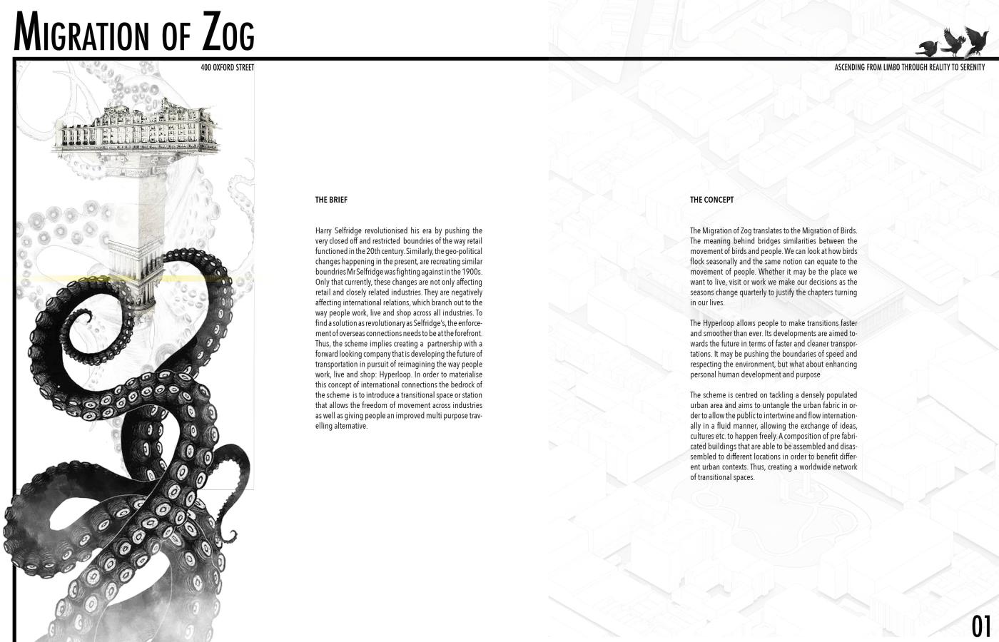 Migration of Zog Part 1 Project 2018 Shpend Pashtriku Ravensbourne University London | UK The Migration of Zog is a forward looking scheme that aims to redefine the working, living and shopping, by introducing and update to the already renowned Hyperloop system. This update is concerned with not only moving people, but moving lives. The scheme implies the design of pods transportable via the Hyperloop, and easily relocating them into extensive slot-in system framework buildings spread across the major cities of the world. Tutor(s) Idrees Rasouli
