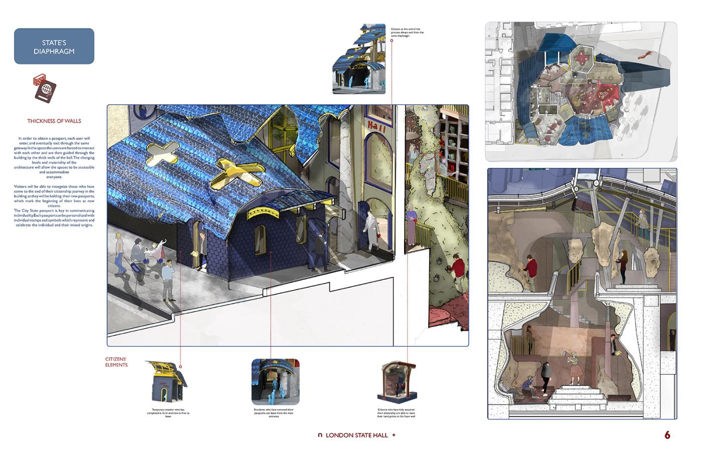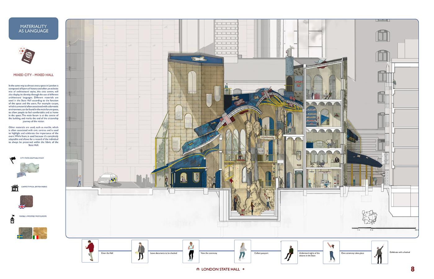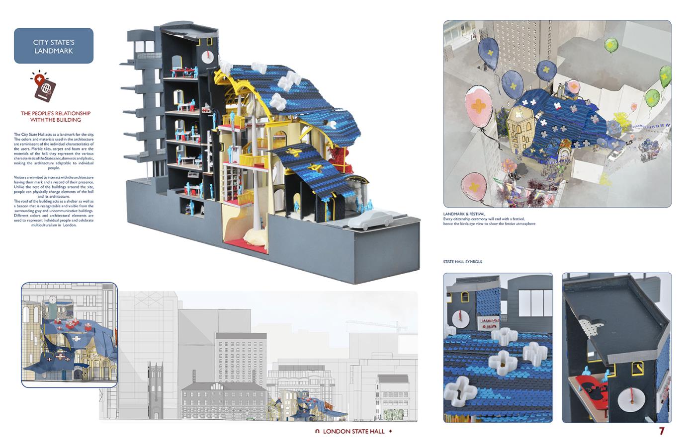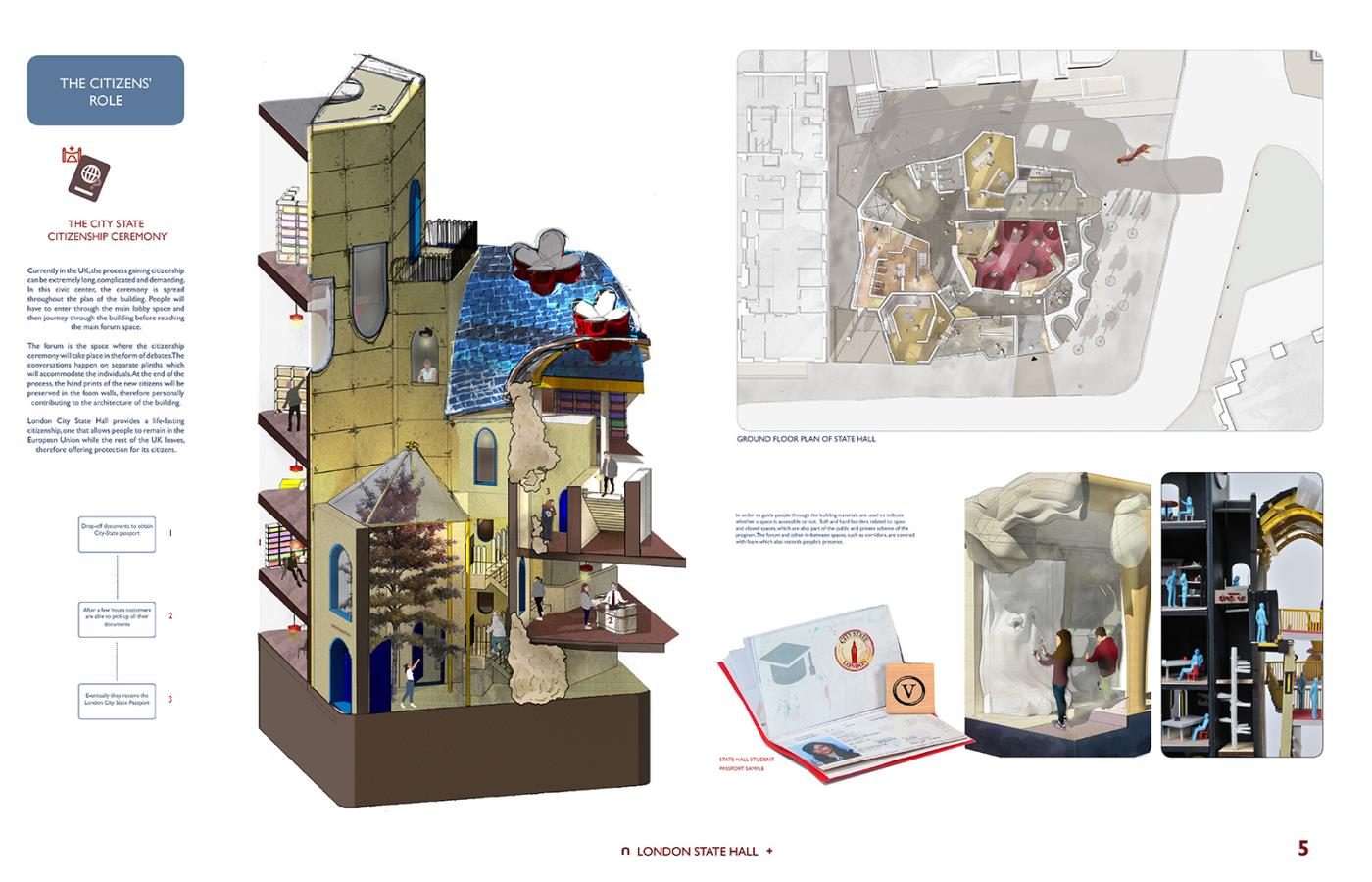 London State Hall Part 1 Project 2018 Marjut Lisco Oxford Brookes University Oxford | UK London State Hall brings a new perspective on a post-Brexit scenario, where the British capital stays in Europe becoming an independent state. Residents, students, workers and travelers would receive a new passport, which would allow citizens to preserve the benefits of the EU community. A new proposed citizenship ceremony would celebrate every individual. This civic center embraces materiality to represent its motto: flexibility and freedom by using expanding foam. Tutor(s) Hugh McEwen Greg Nordberg Catrina Stewart