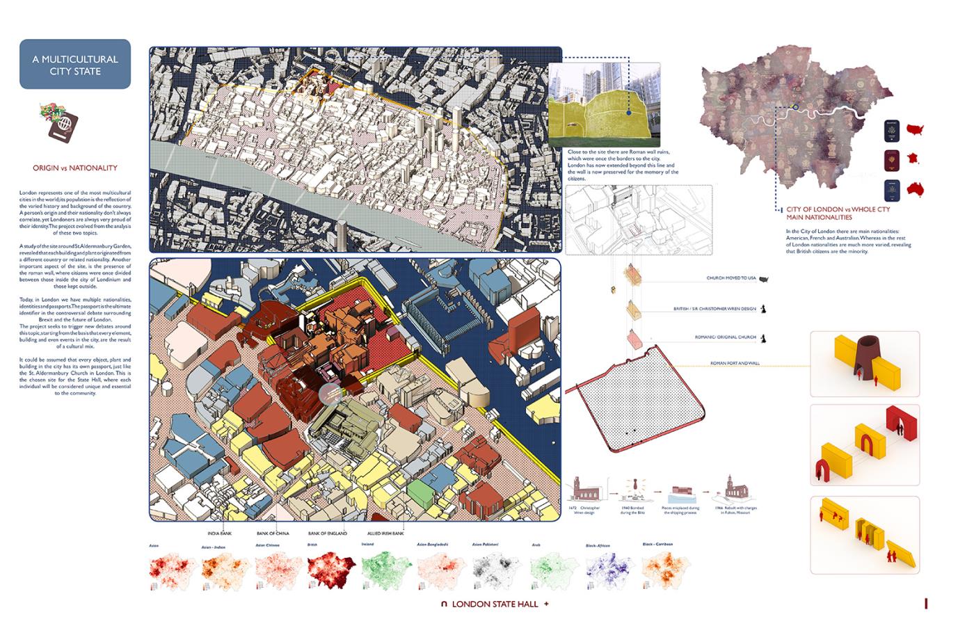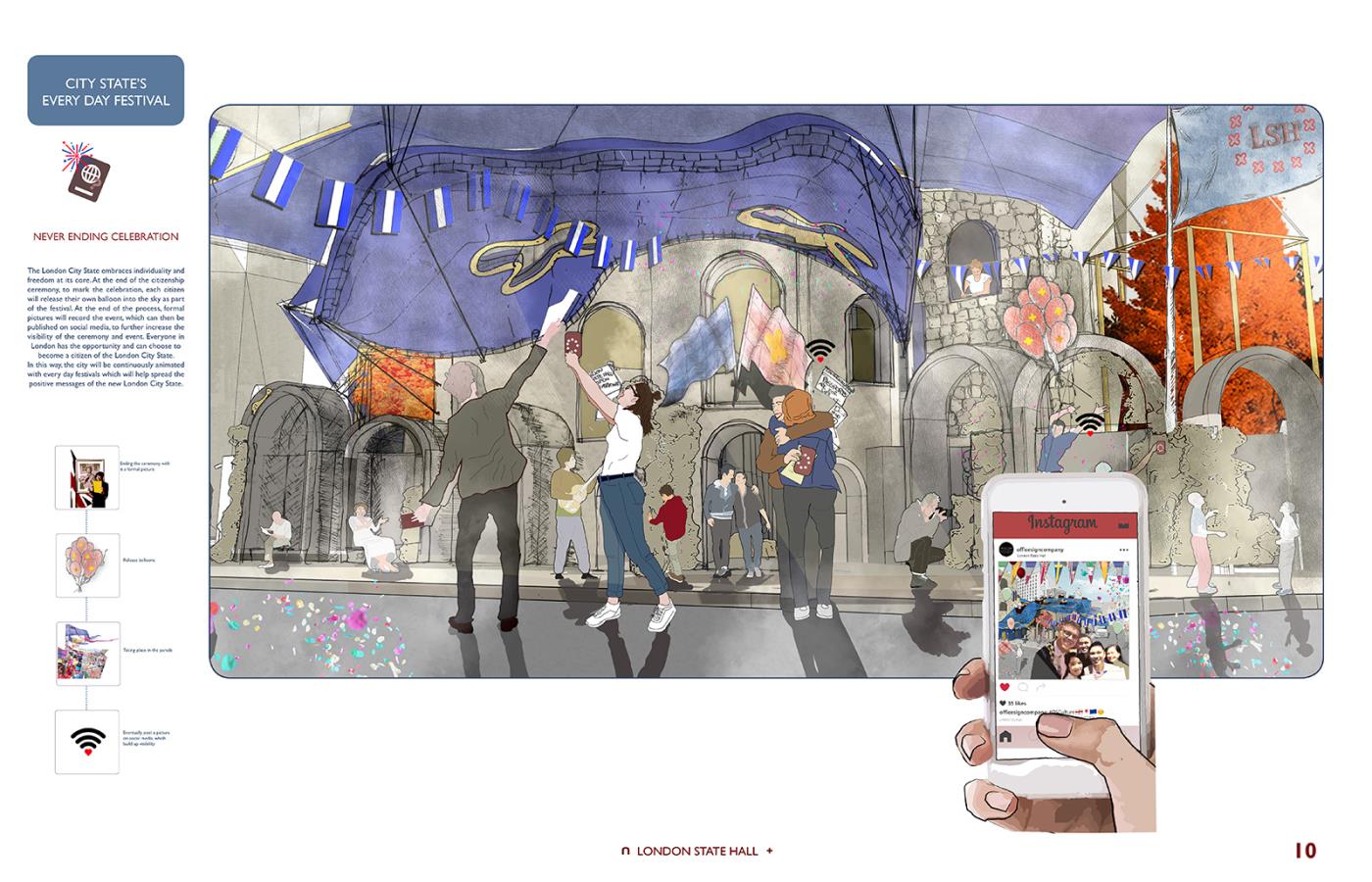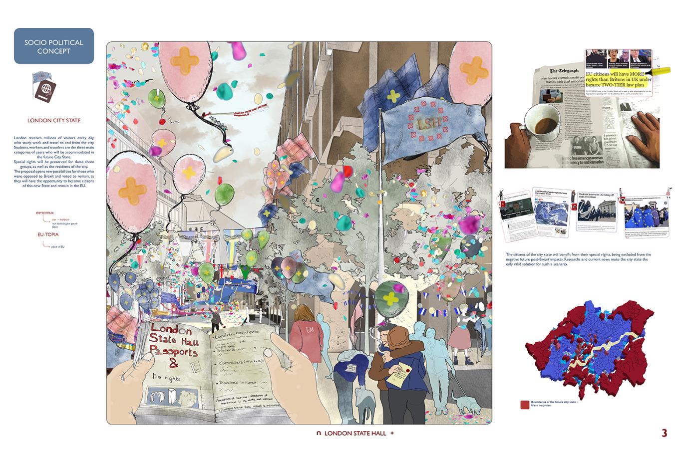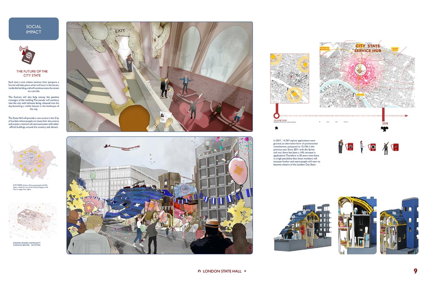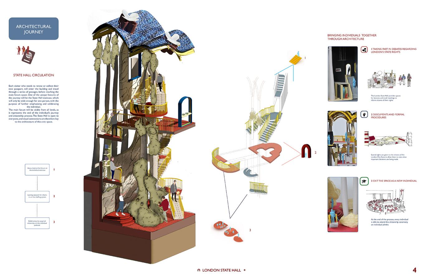 London State Hall Part 1 Project 2018 Marjut Lisco Oxford Brookes University Oxford | UK London State Hall brings a new perspective on a post-Brexit scenario, where the British capital stays in Europe becoming an independent state. Residents, students, workers and travelers would receive a new passport, which would allow citizens to preserve the benefits of the EU community. A new proposed citizenship ceremony would celebrate every individual. This civic center embraces materiality to represent its motto: flexibility and freedom by using expanding foam. Tutor(s) Hugh McEwen Greg Nordberg Catrina Stewart