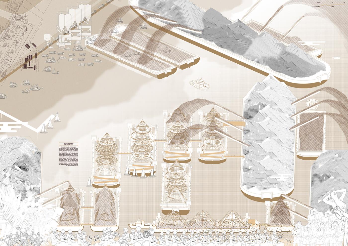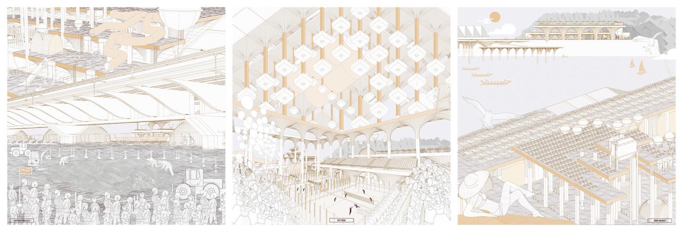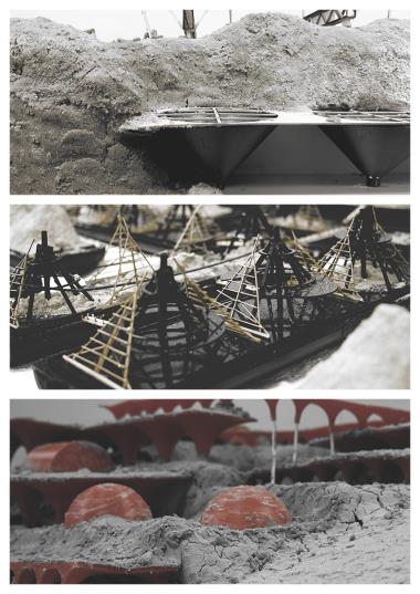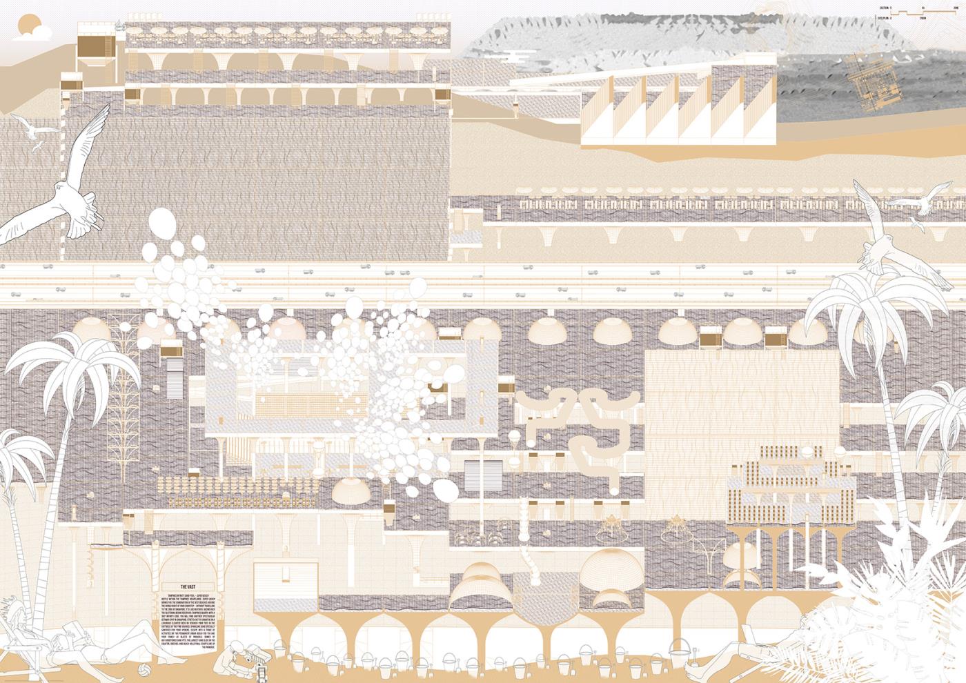 Materialising Sand: The Dunes, The Archipelago, The Beach Part 2 Project 2018 Derong Lin National University of Singapore | Singapore Gigantic sand dunes continue to pile as Singapore safeguards her sand resources amidst global scarcity. Shifting away from sand’s state narrative, three erratic sandscapes – a shooting range in the Dunes, party barges in the Archipelago, and an elevated Beach – emerge vis-à-vis our stockpile sites as a hyper-productive leisure infrastructure to recast sand’s muted politics as an emotively tactile material matter. Each intervention juxtaposes sand’s commonplace perceptions against its brute economics. Tutor(s) Lilian Chee