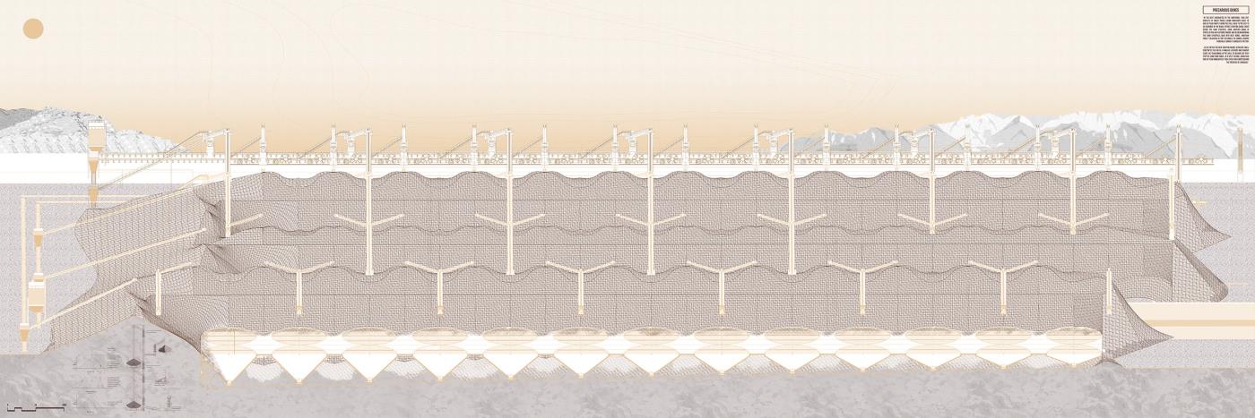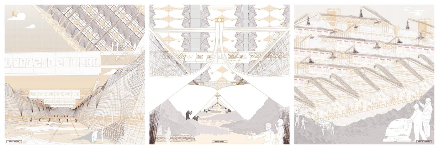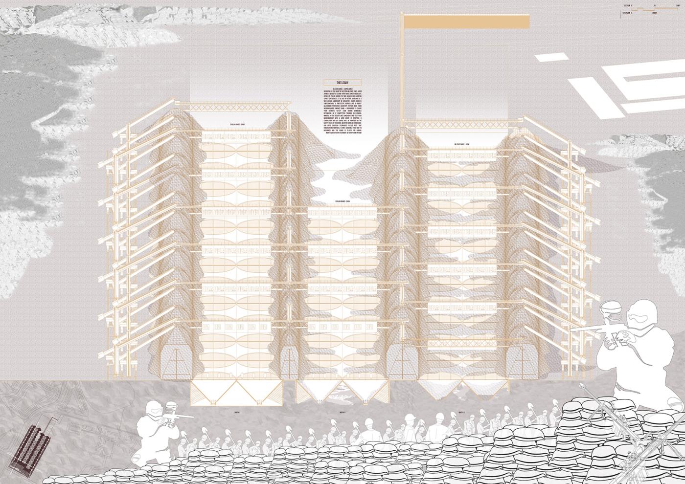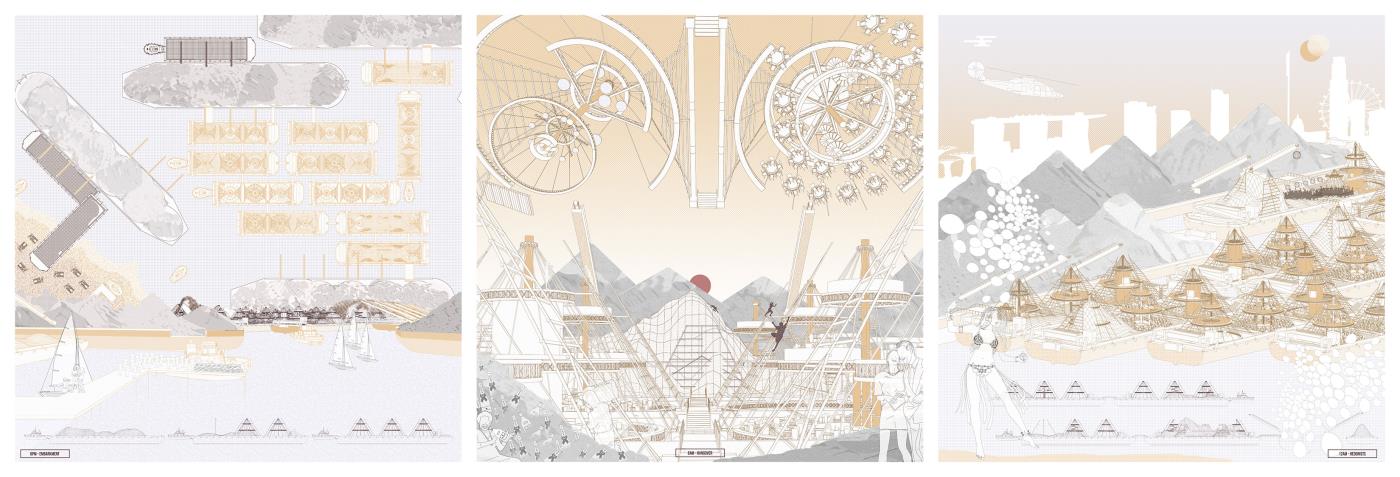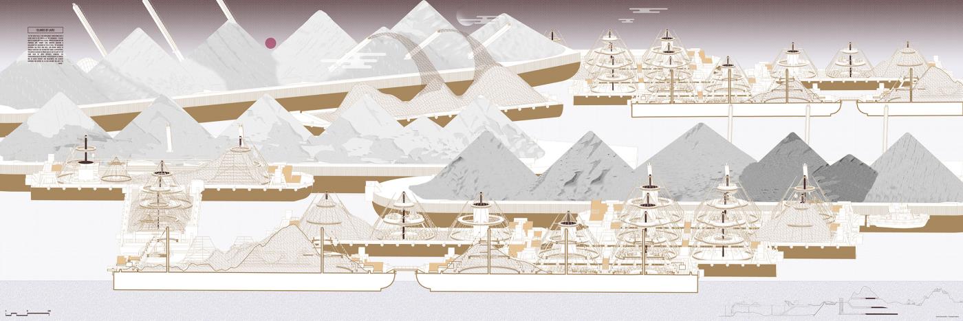 Materialising Sand: The Dunes, The Archipelago, The Beach Part 2 Project 2018 Derong Lin National University of Singapore | Singapore Gigantic sand dunes continue to pile as Singapore safeguards her sand resources amidst global scarcity. Shifting away from sand’s state narrative, three erratic sandscapes – a shooting range in the Dunes, party barges in the Archipelago, and an elevated Beach – emerge vis-à-vis our stockpile sites as a hyper-productive leisure infrastructure to recast sand’s muted politics as an emotively tactile material matter. Each intervention juxtaposes sand’s commonplace perceptions against its brute economics. Tutor(s) Lilian Chee