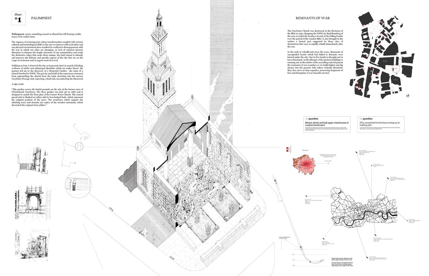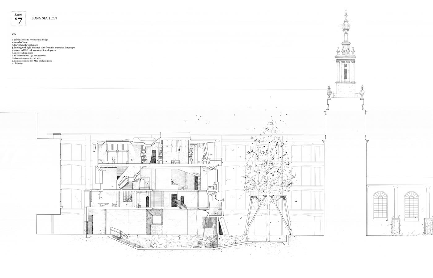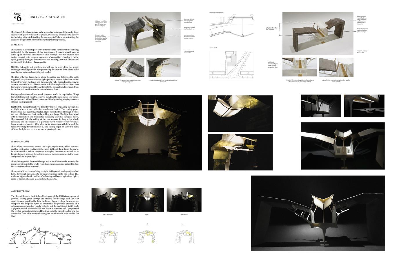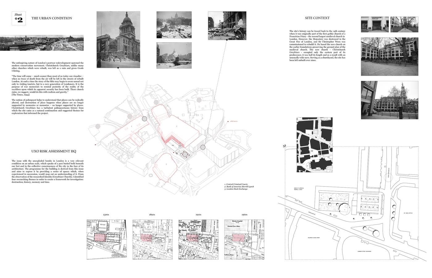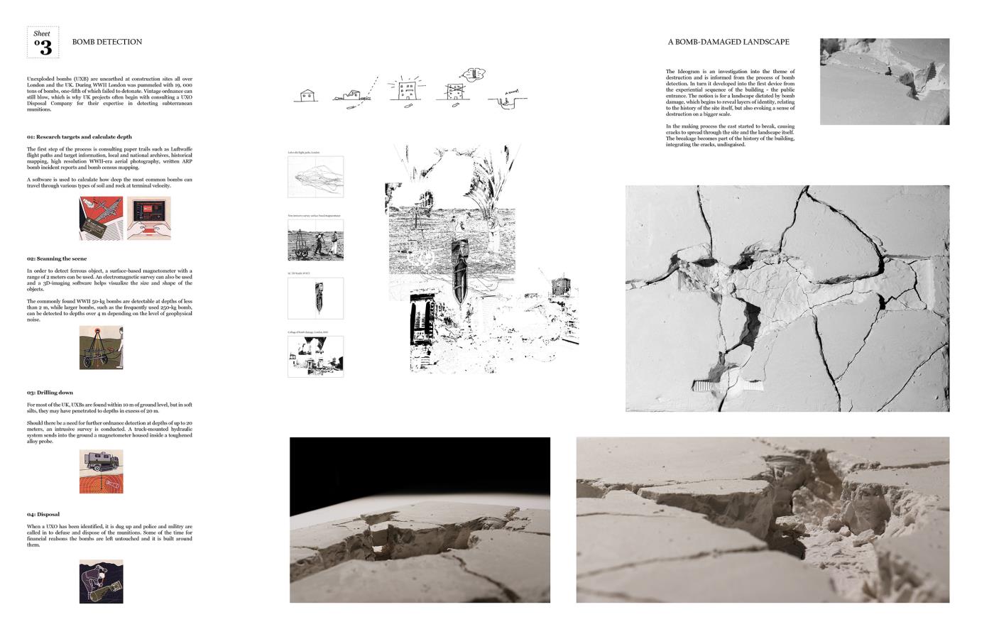 After WWII, London’s rapid rebuilding resulted in thousands of unexploded bombs to be buried beneath the city. With the lifespan of the post-war buildings running out and being redeveloped, the remnants of war resurface. The project addresses the issue of unexploded ordnance by providing a series of spaces to act as devices for understanding and remembrance, alongside an architecture tailored to the bespoke process of UXO risk assessment.