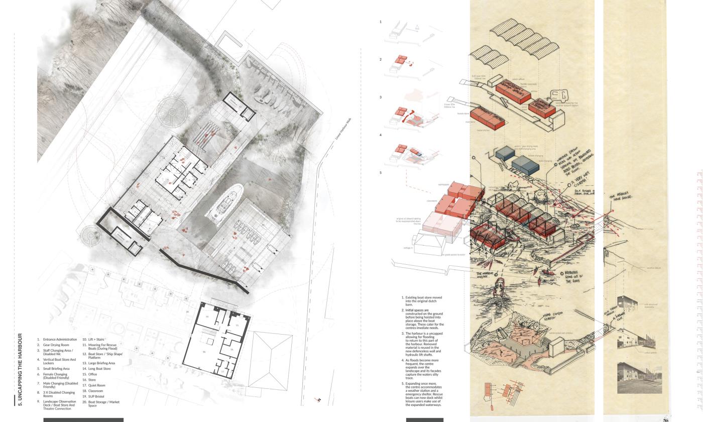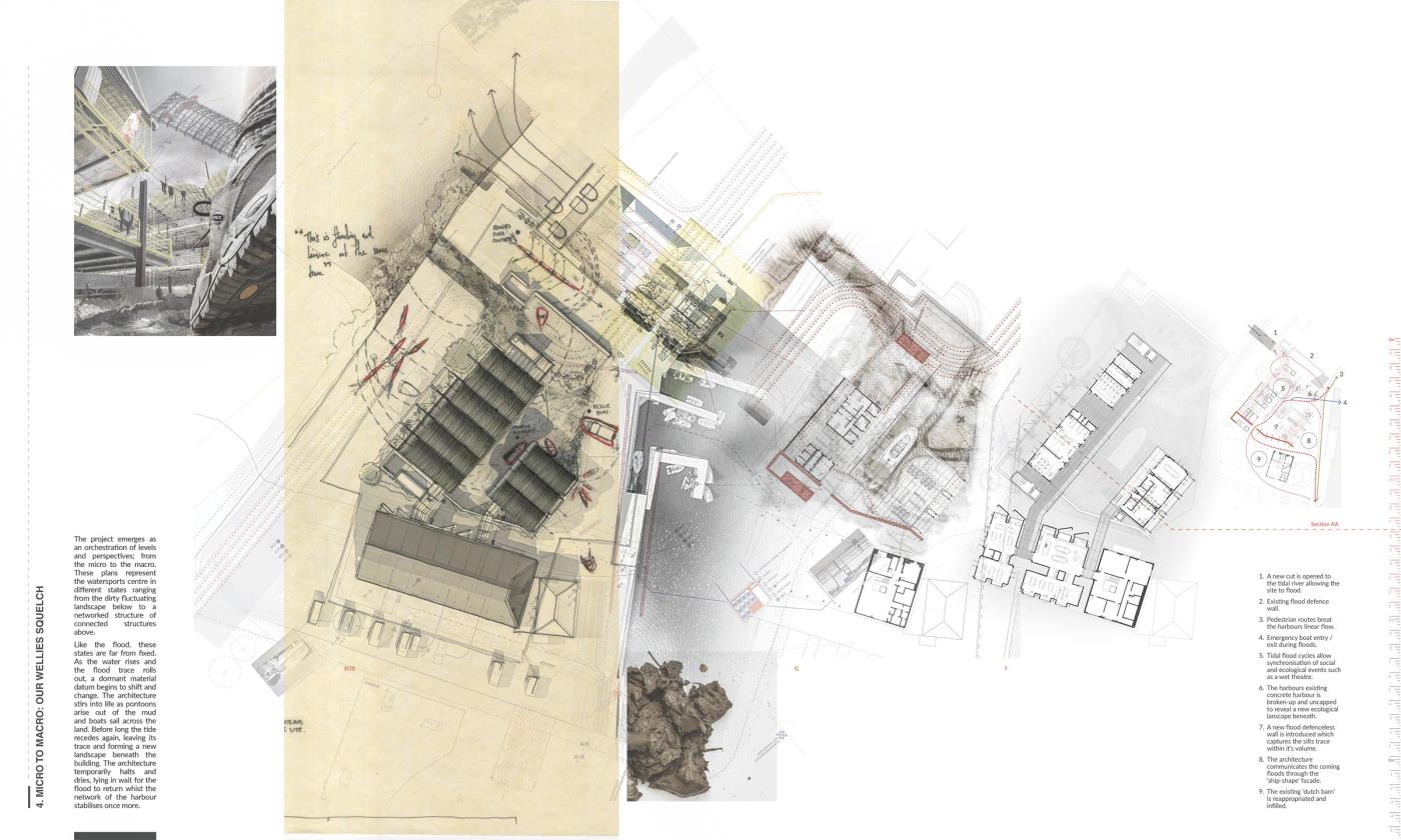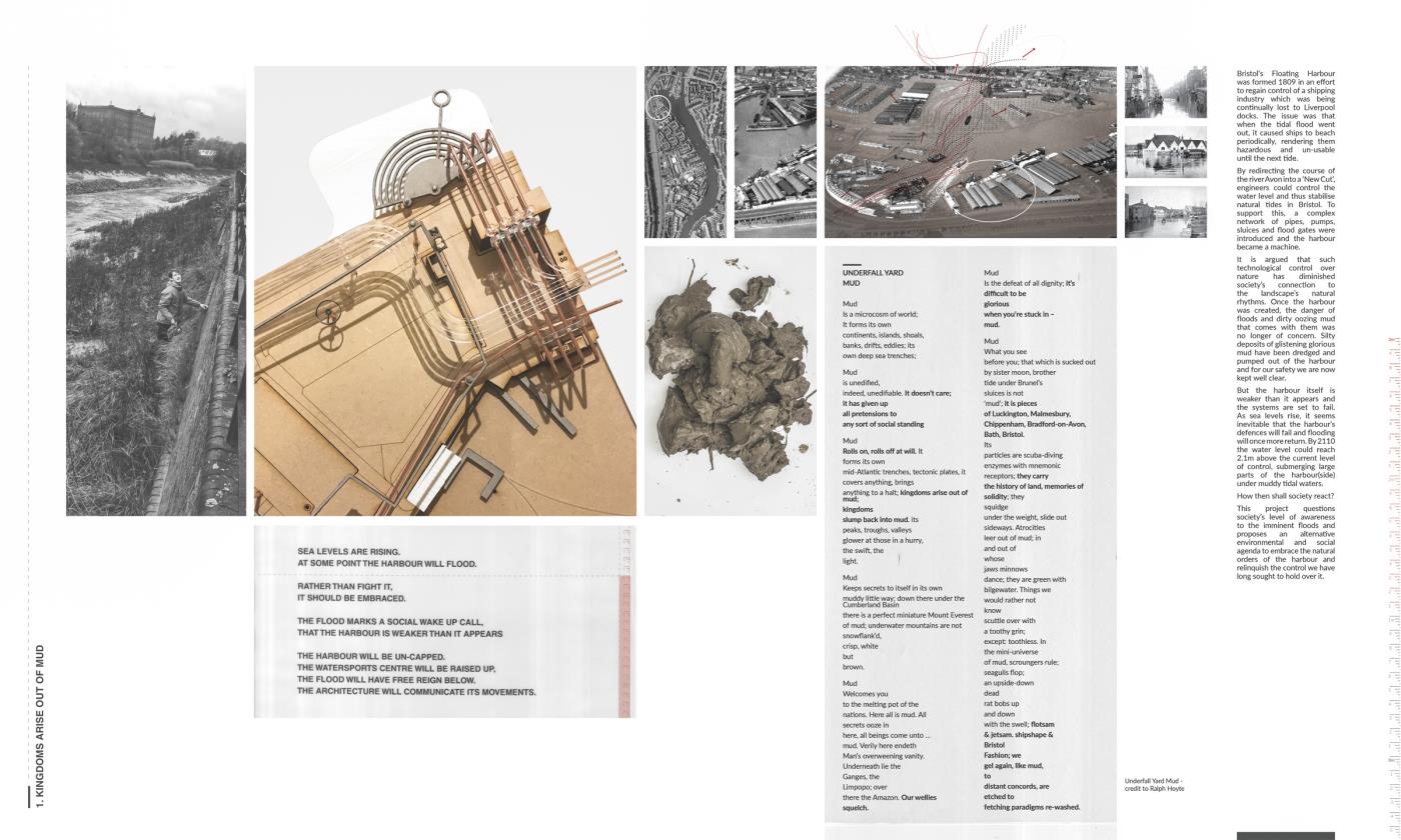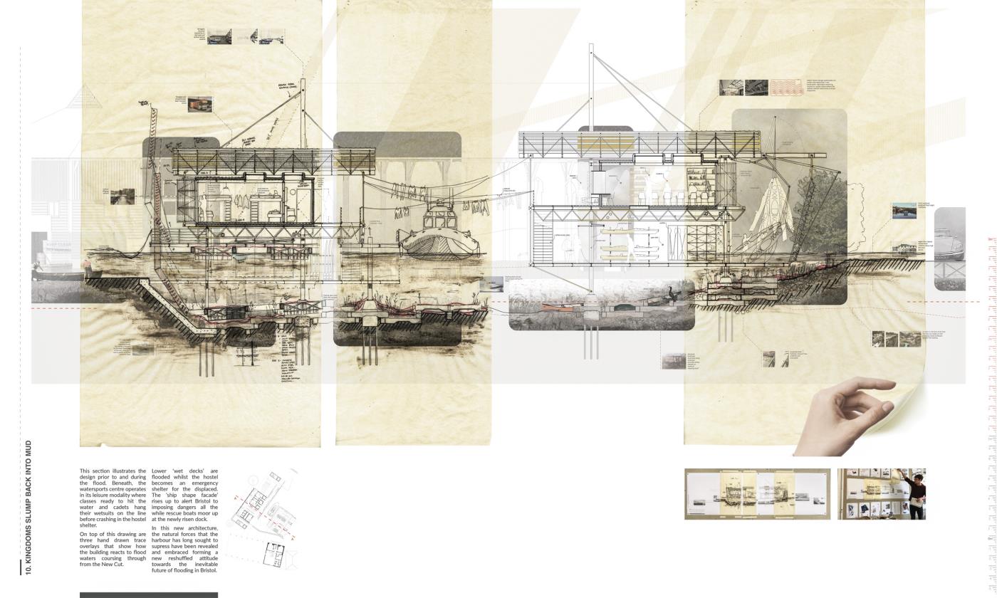 This project is an investigation into Bristol’s Floating Harbour and its vulnerability to flooding, which we have long sought to control. What society values about the harbour has changed; where there were once cargo ships, there are now sailing boats. That the harbour was once tidal recedes from public attention. This project proposes an environmental agenda to relinquish control over nature by allowing tidal flooding to return to the harbour.