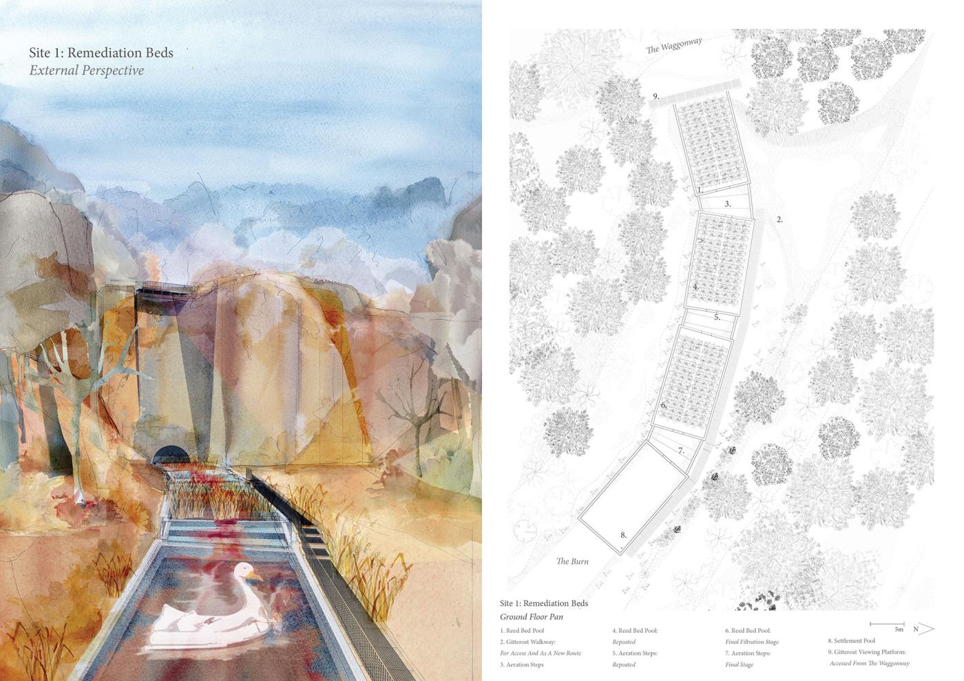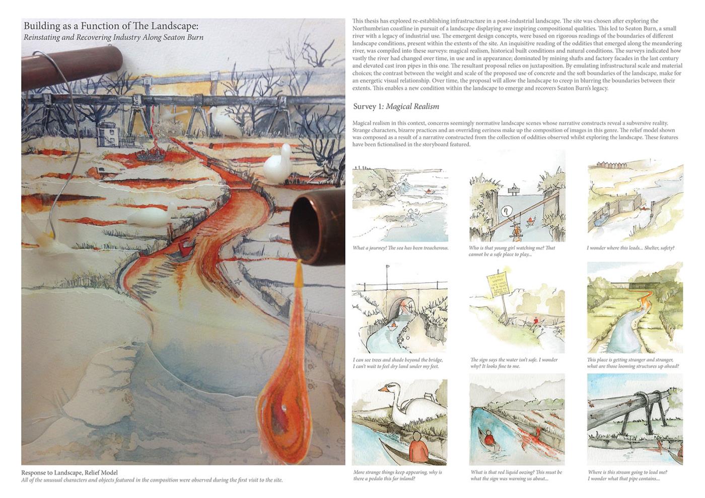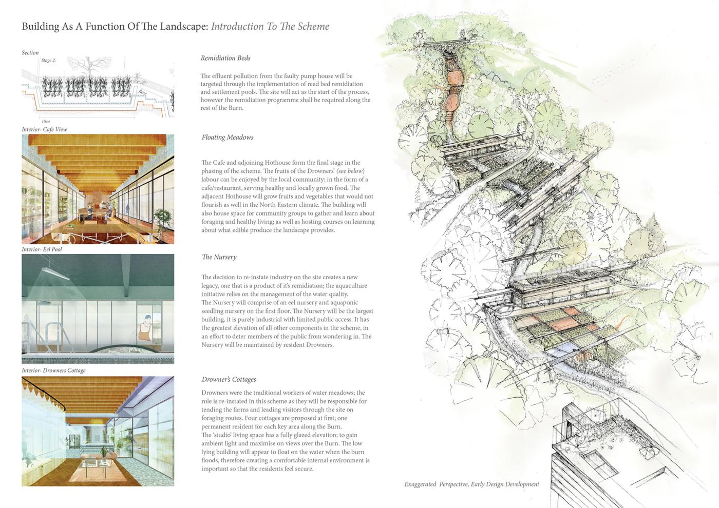 Building as a Function of The Landscape: Reinstating and Recovering Industry Along Seaton Burn Part 2 Project 2018 Florence Bill Northumbria University Newcastle | UK This thesis has explored re-establishing infrastructure in a post-industrial landscape. The site was chosen after exploring the Northumbrian coastline in pursuit of a landscape displaying awe inspiring compositional qualities. The emergent design concepts were based on rigorous readings of the boundaries of different landscape conditions present, within the extents of the lower course of Seaton Burn. The resultant architectural proposal, then, becomes a new landscape condition. Tutor(s) Shaun Young