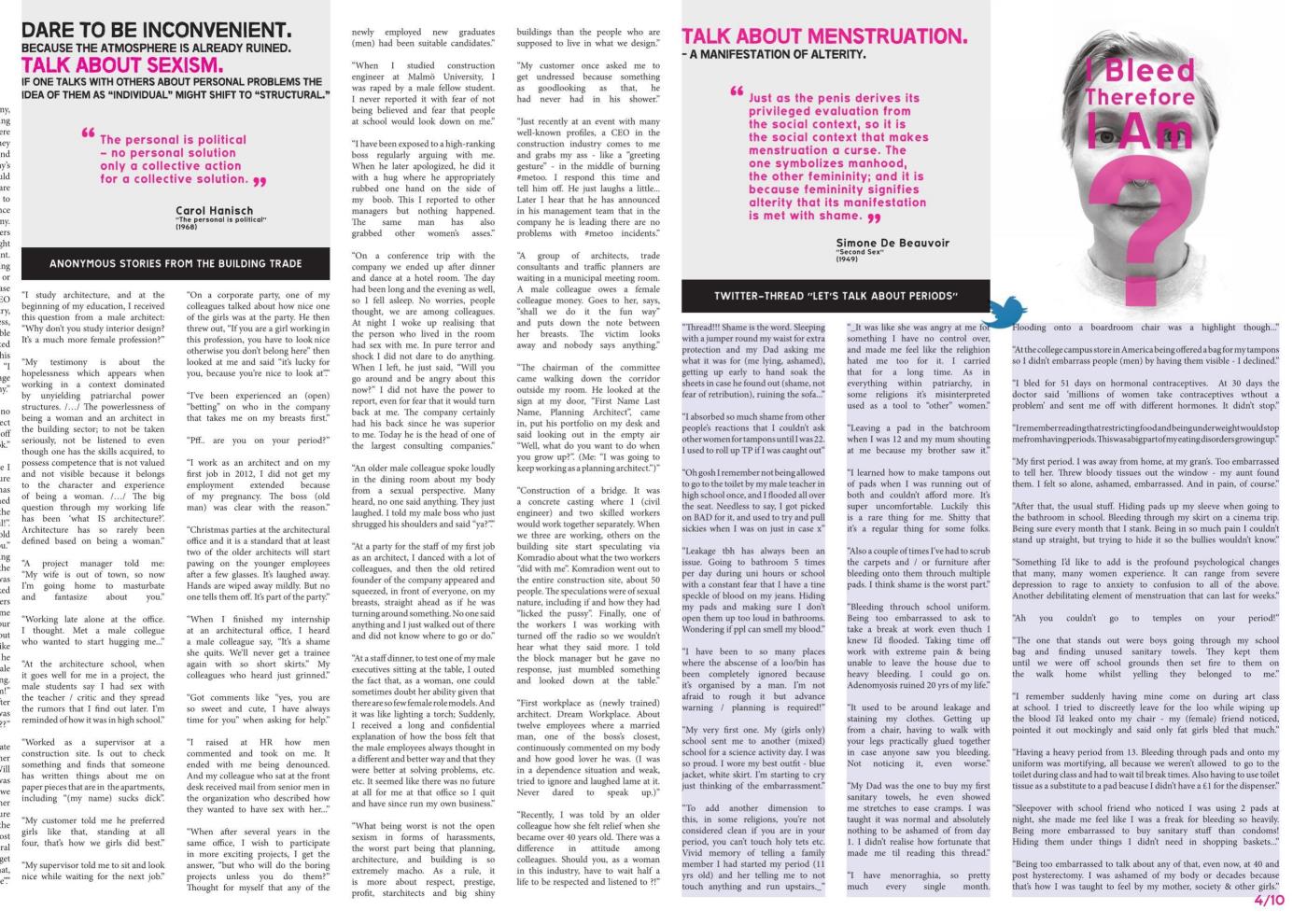 Being Vocal And Making Trouble Part 2 Project 2018 Cajsa Winge Umeå University | Sweden Architecture is a profession, like every other where sexual harassments and abuse occur. This is a project calling out sexism and an exploration of cultural attitudes towards the female body with architectural proposals to confront this. To be vocal and make trouble is to be inconvenient. It is a campaign for making change through questioning the role of the architect. Who are we as architects – can we be truly inclusive? Tutor(s) Andrew Belfield Tom Dobson Torange Khonsari