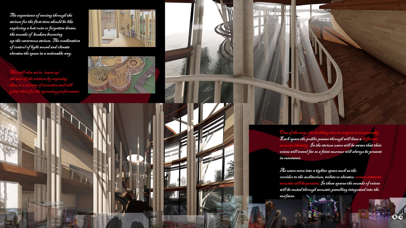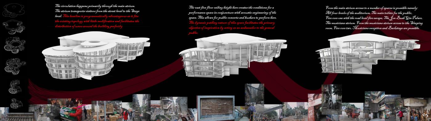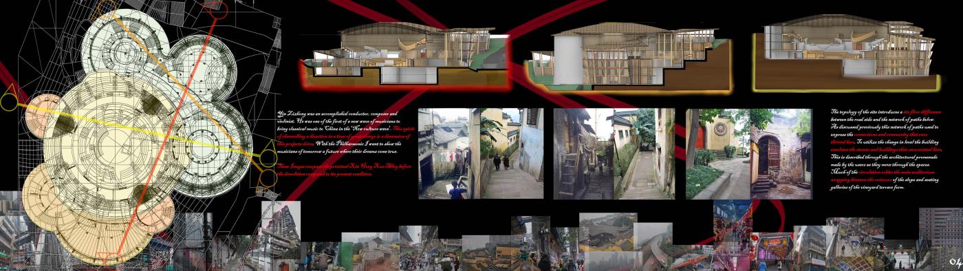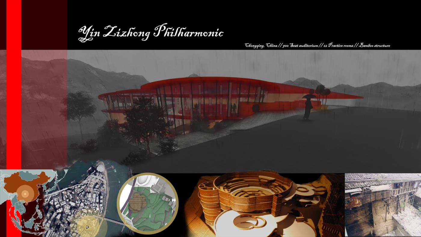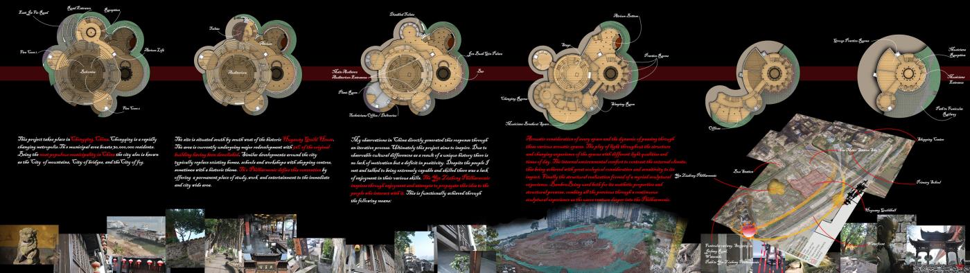 Yin Zizhong Philharmonic, Chongqing, China Part 1 Project 2018 Fionn Harding University of Huddersfield | UK The Yin Zizhong Philharmonic is a mixed-use building situated in Chongqing China. The building steps down a drastic six floor change of level. Within the envelope of the building there is a 900-seat auditorium, and a 4-floor-deep atrium for access and performance. In addition the necessary facilities for a full orchestra to change and rehearse are provided and 22 individual practice rooms for students, professionals and the public to use. Tutor(s)Mr John Bush Hilary Chadwick Yun Gao