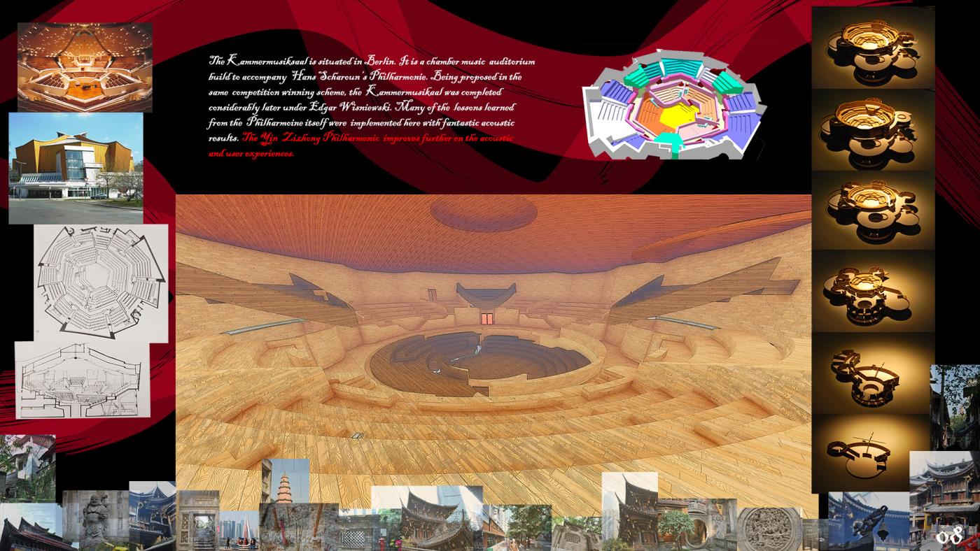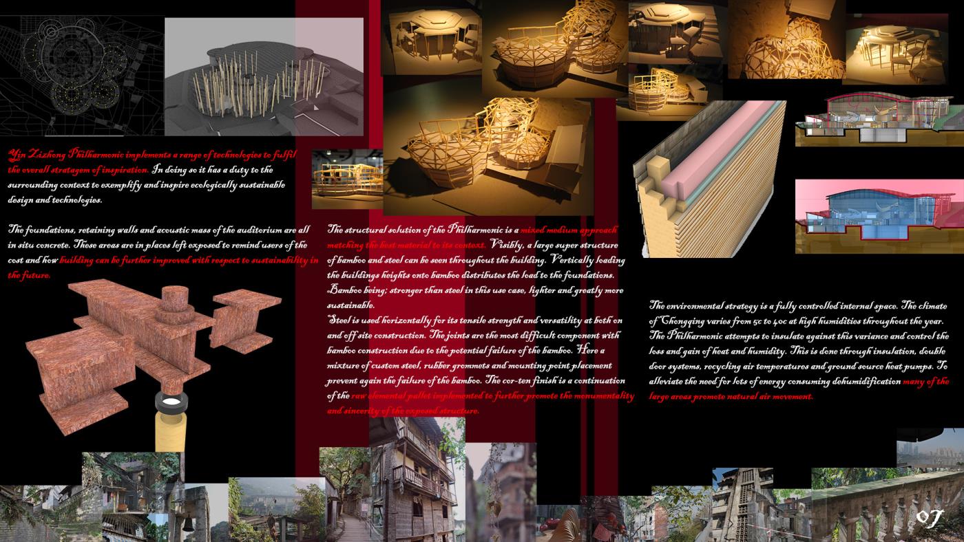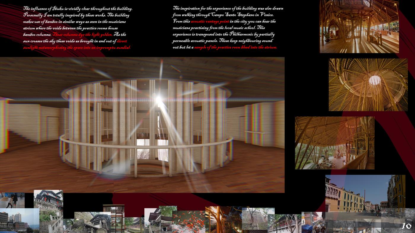 Yin Zizhong Philharmonic, Chongqing, China Part 1 Project 2018 Fionn Harding University of Huddersfield | UK The Yin Zizhong Philharmonic is a mixed-use building situated in Chongqing China. The building steps down a drastic six floor change of level. Within the envelope of the building there is a 900-seat auditorium, and a 4-floor-deep atrium for access and performance. In addition the necessary facilities for a full orchestra to change and rehearse are provided and 22 individual practice rooms for students, professionals and the public to use. Tutor(s)Mr John Bush Hilary Chadwick Yun Gao