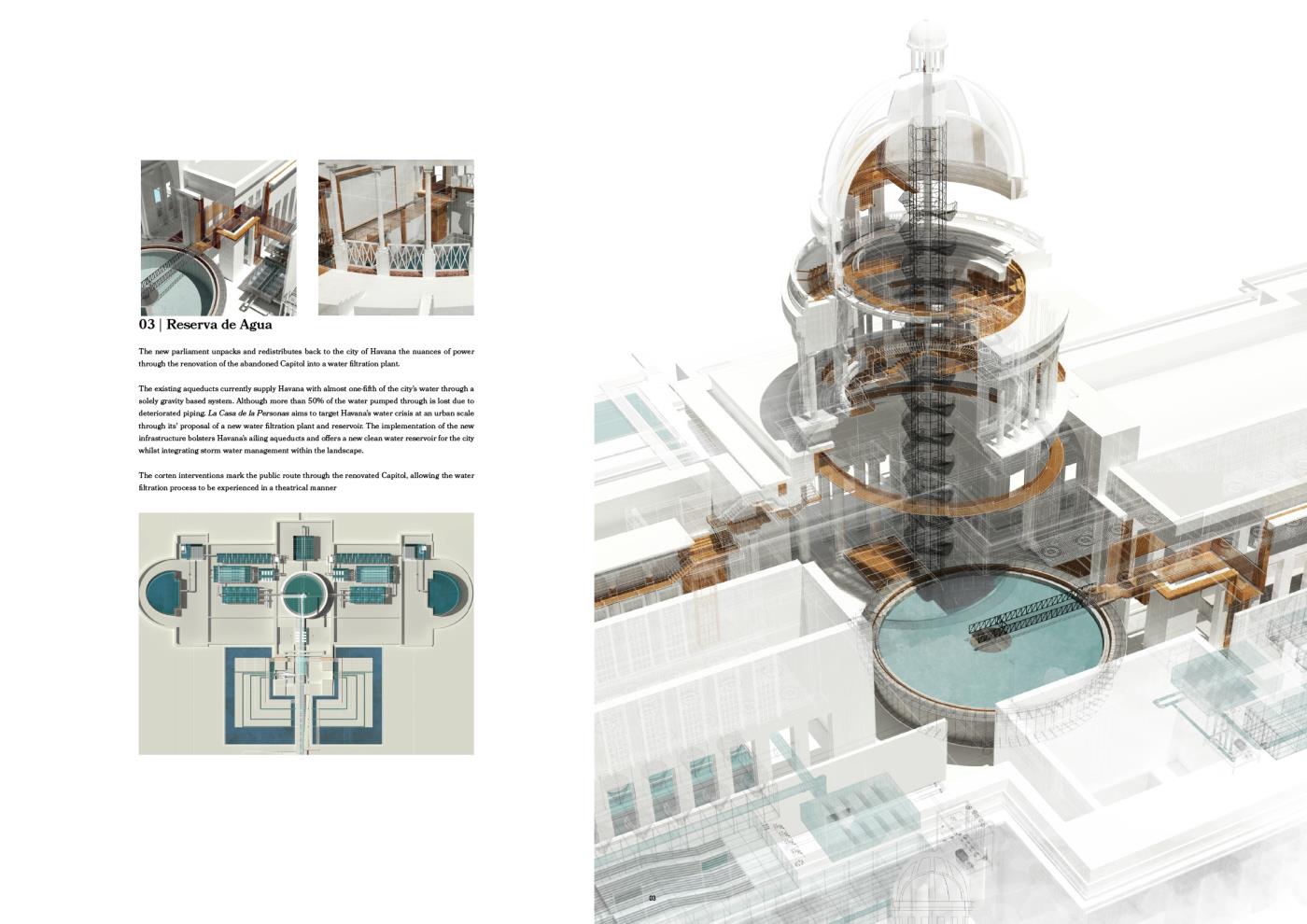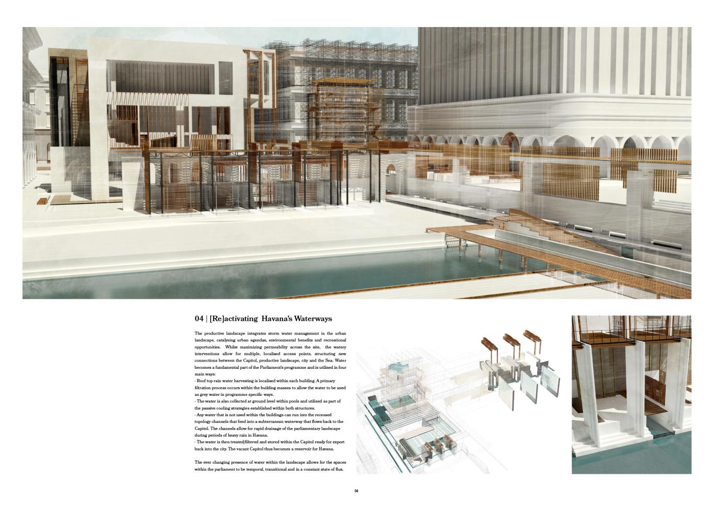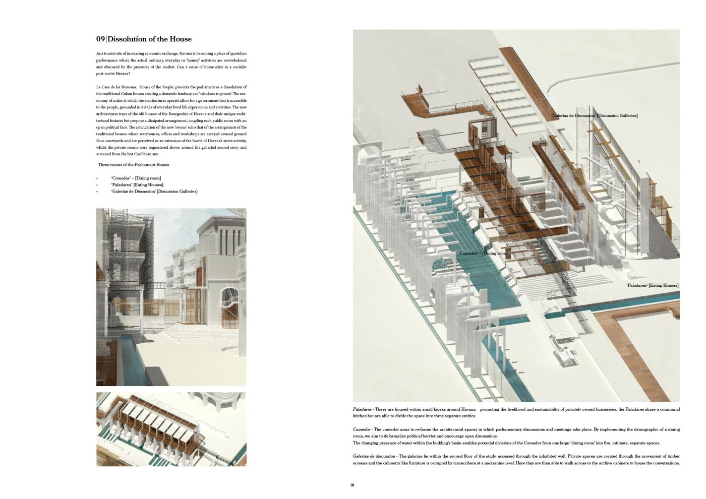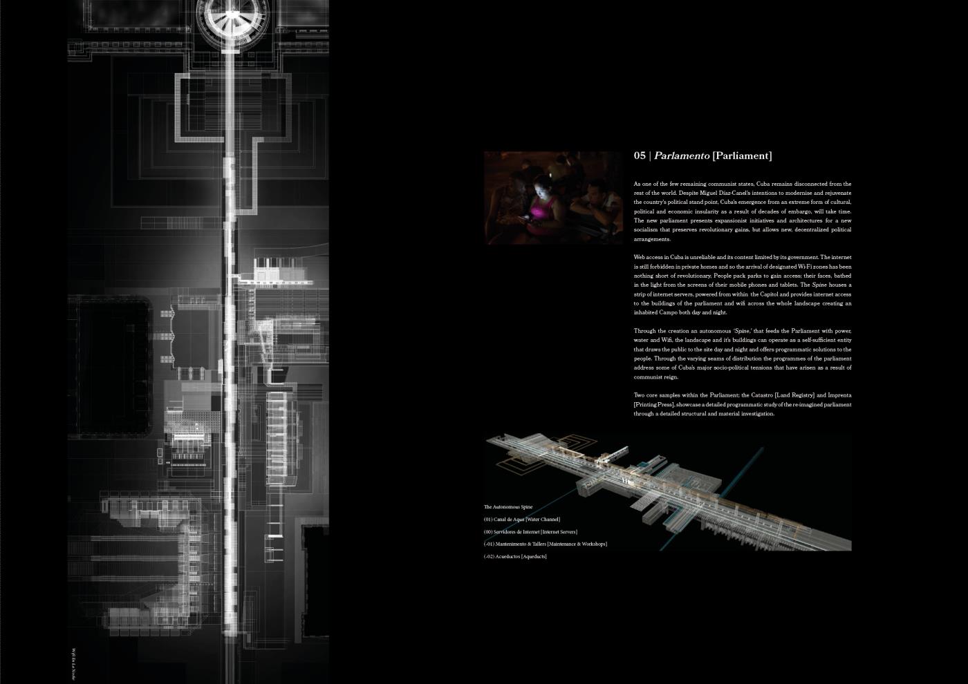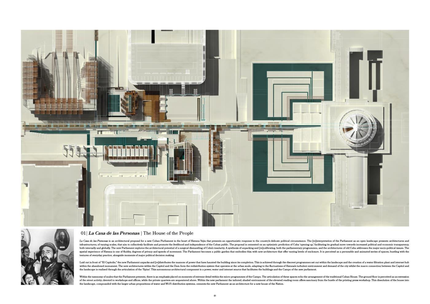 La Casa del las Personas is an opportunistic proposal for a new Cuban Parliament in the heart of Havana Vieja that responds to the country’s delicate, political circumstance. The [re]interpretation of the Parliament as an open landscape presents architectures and infrastructures, of varying scales, that aim to collectively facilitate and promote the livelihood and independence of the Cuban public; synthesising Havana’s quotidian performance with moments of major, political decision making.