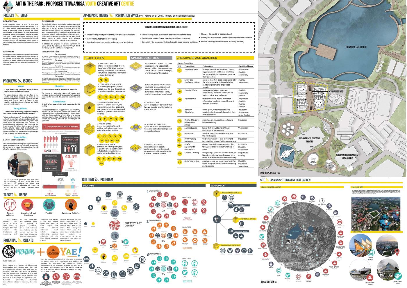 Art in the Park: Titiwangsa Youth Creative Art Centre Part 2 Project 2018 Mohammad Ali Zainal Abidin University of Malaya | Malaysia In dealing with the lack of art appreciation by society at large and the alarmingly high unemployment of young artists, the “Art in the Park” proposal presents the opportunity for young artist to work within the public realm while getting mentored by established artists and build networks. Located next to Istana Budaya and Balai Seni Lukis Negara, this centre injects a new lease of life into the Titiwangsa Lake Garden. Tutor(s) Mastura Adam Helena Aman Hashim