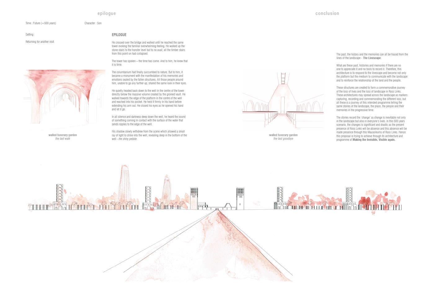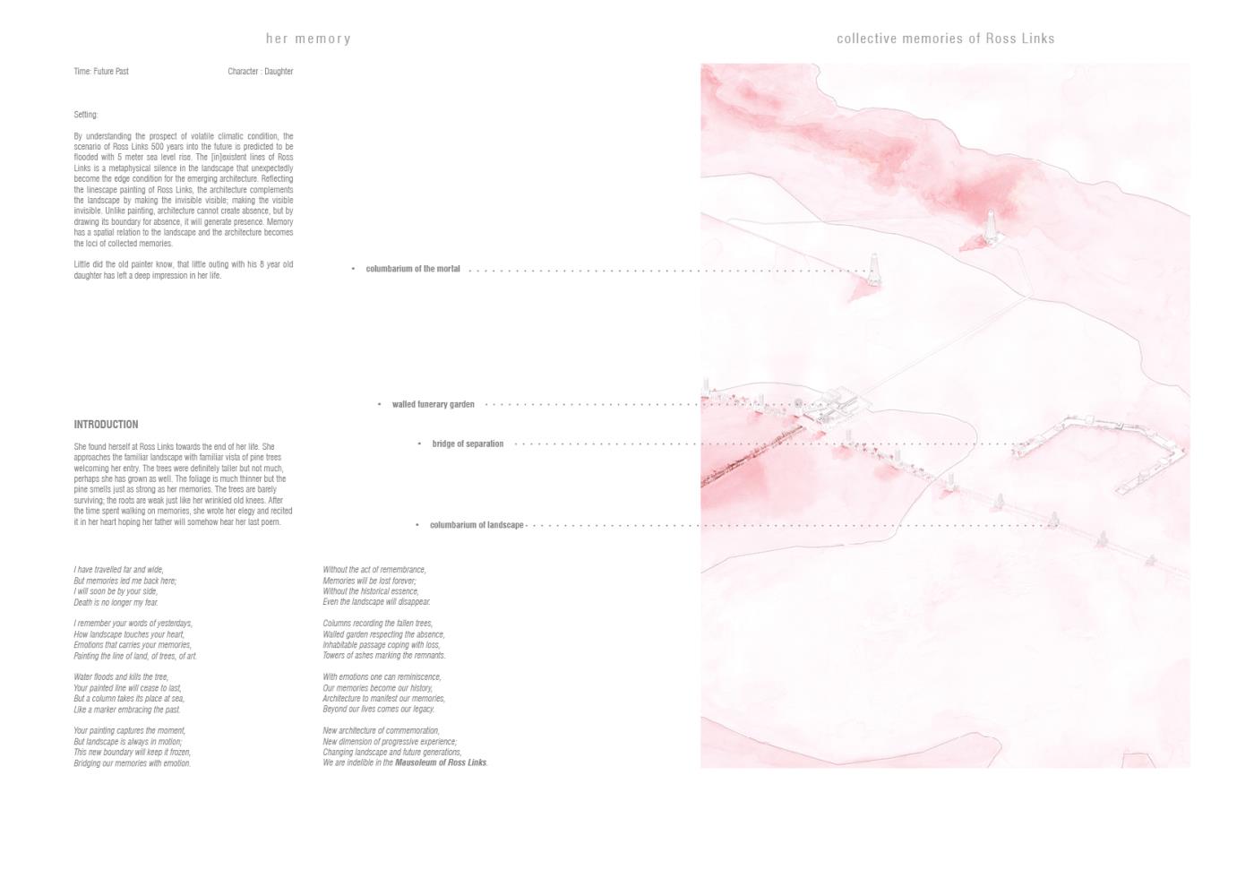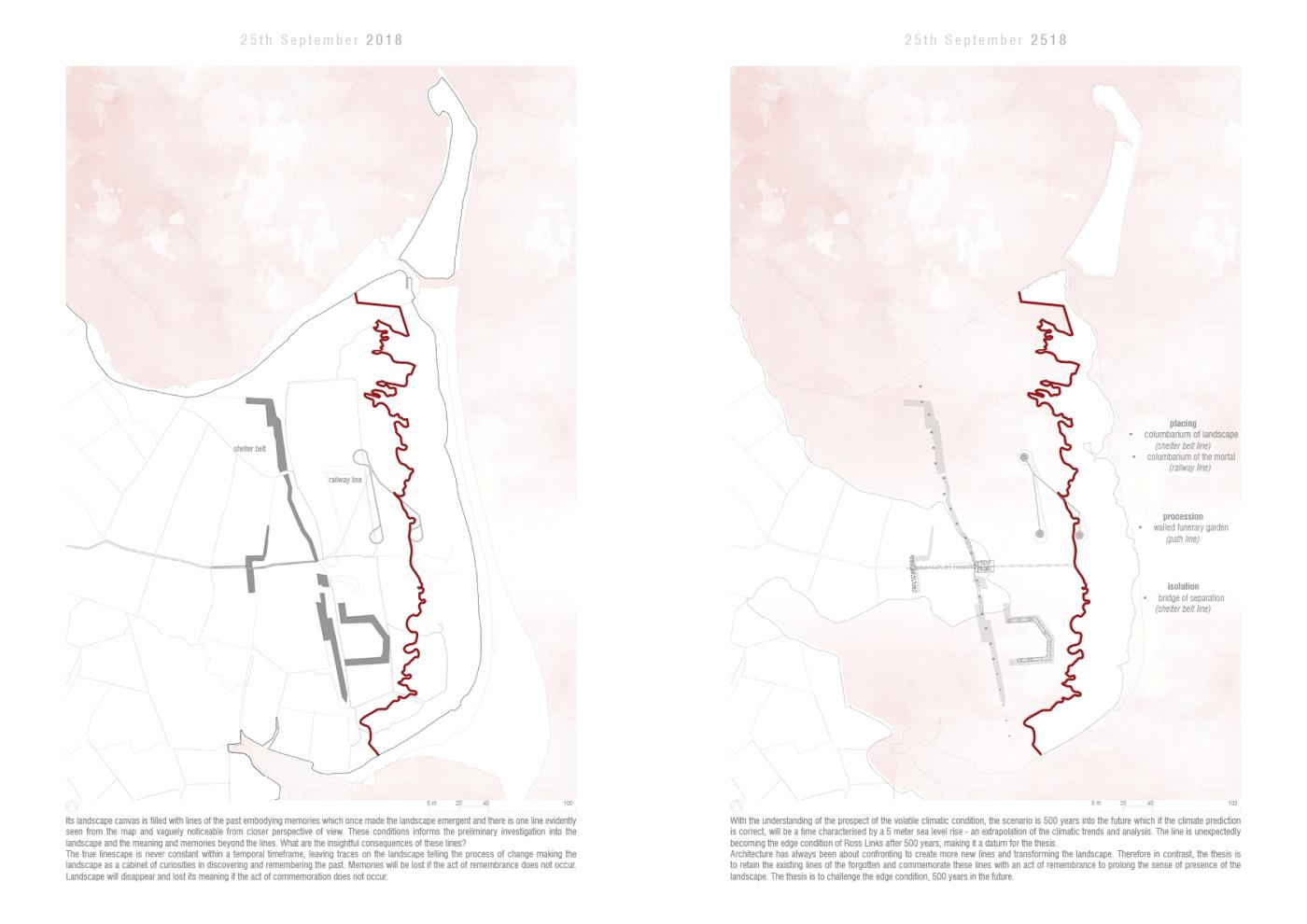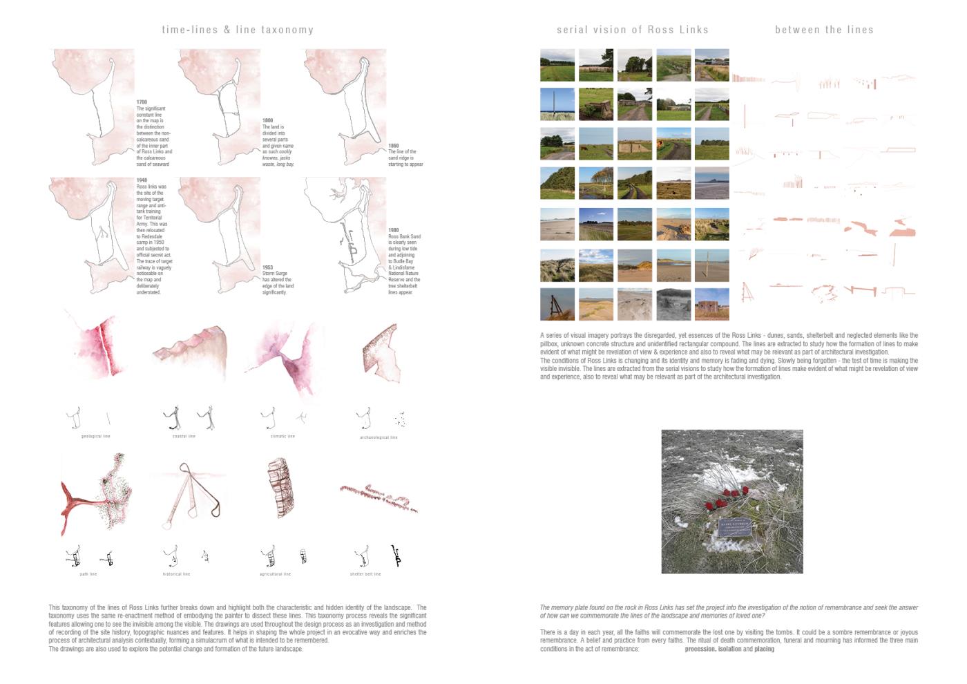 The [IN]existent Lines: Collective Memories of Ross Links through Acts of Remembrance Part 2 Project 2019 Lee Xin Lau Northumbria University Newcastle | UK Linescape - this thesis started by finding the lines of the landscape in Ross Links. These lines are visible but not easily conceivable. These implicit lines manifest itself in the rhythm and pattern of the nature. It exists as a marker to some, embodying memories, telling stories, or even as the identity of the place. The linescape is never constant as the landscape itself changes with time; where in this context is 500 years into the future. One of the prominent lines identified is the landform. This line is projected as the linescape forming the edge condition of Ross Links in 500 years. The thesis is to challenge this edge condition and allowing the surrounding significant lines to inform the architecture which in return, commemorate these lines to prolong the sense of presence of the landscape and its identity to the people. ‘Collective Memories of Ross Links’ is a proposal to preserve the lines of the landscape through acts of remembrance, creating new dimension of progressive experience in a temporal timeframe. A narrative expressing the occupation of the spaces is carefully crafted to hold the poetics and lingering emotions of the landscape through its architecture. Tutor(s) Lesley McIntyre Stephen Roberts