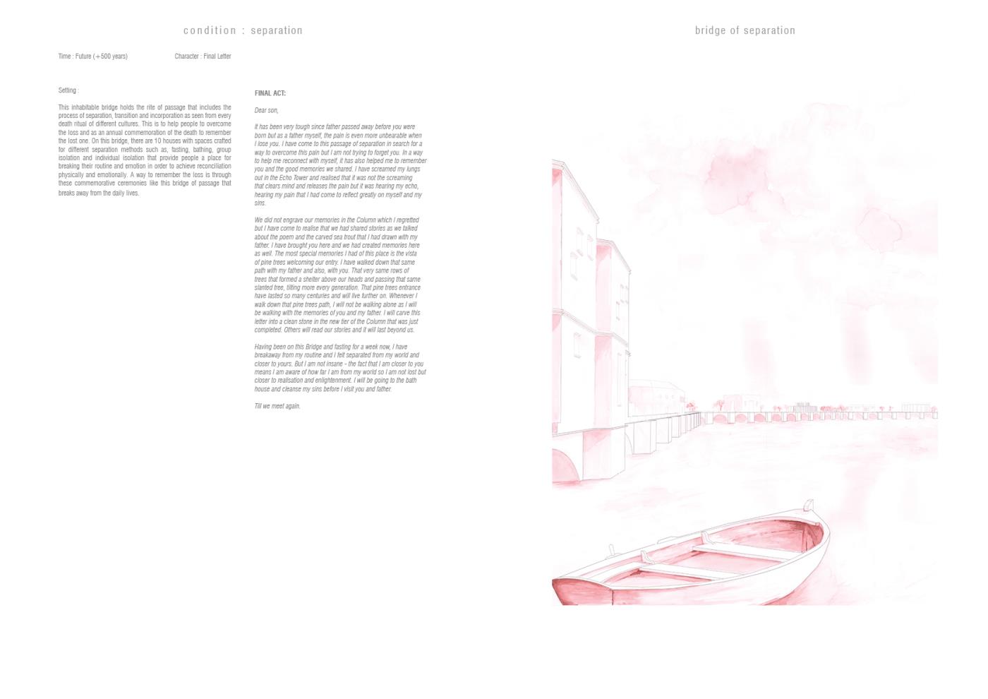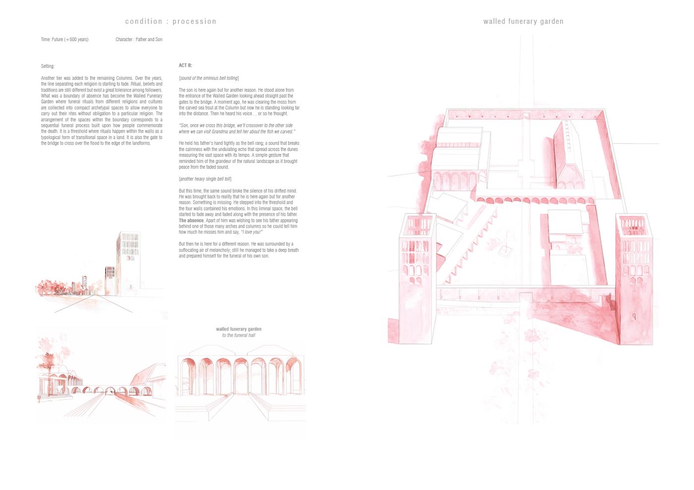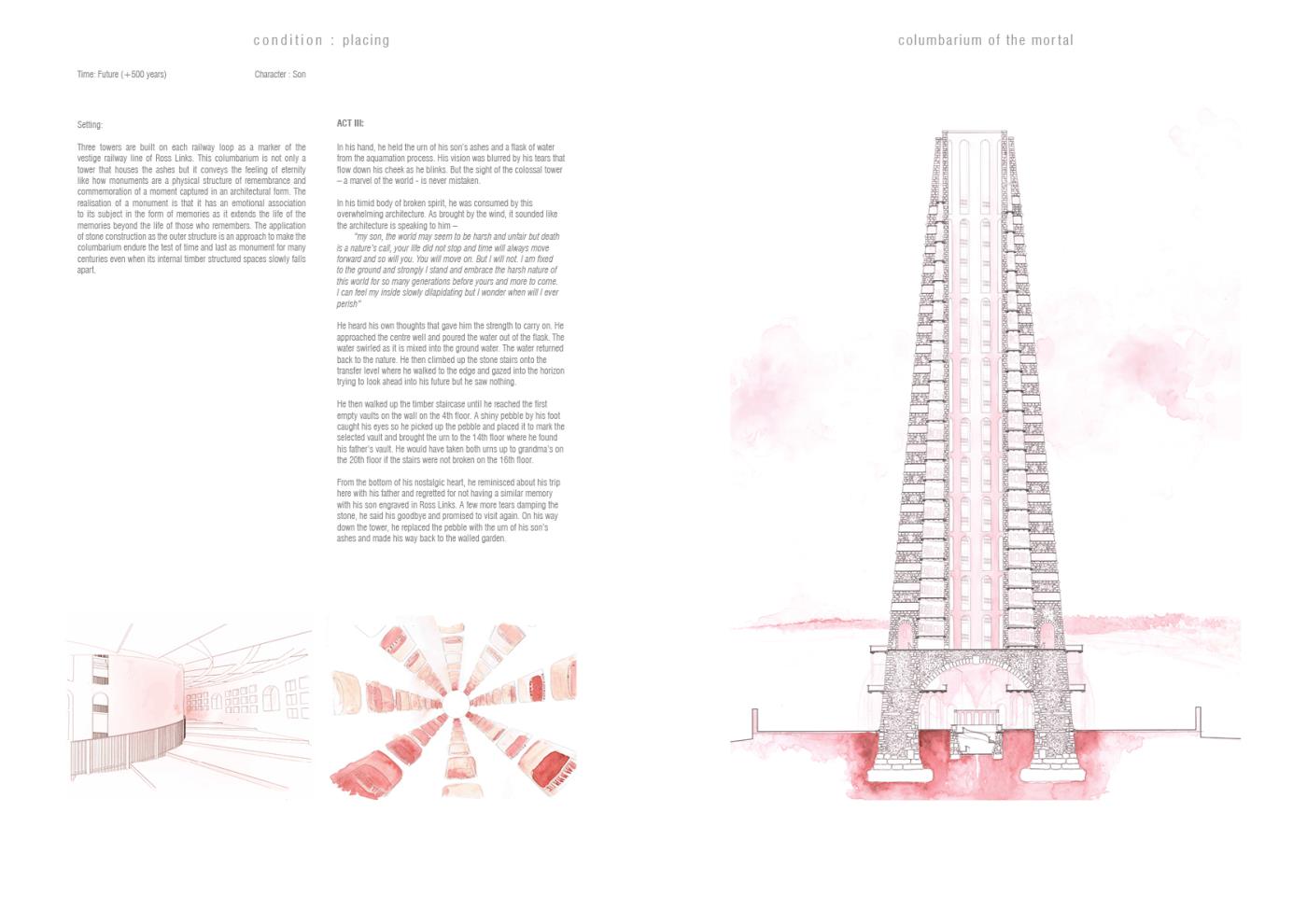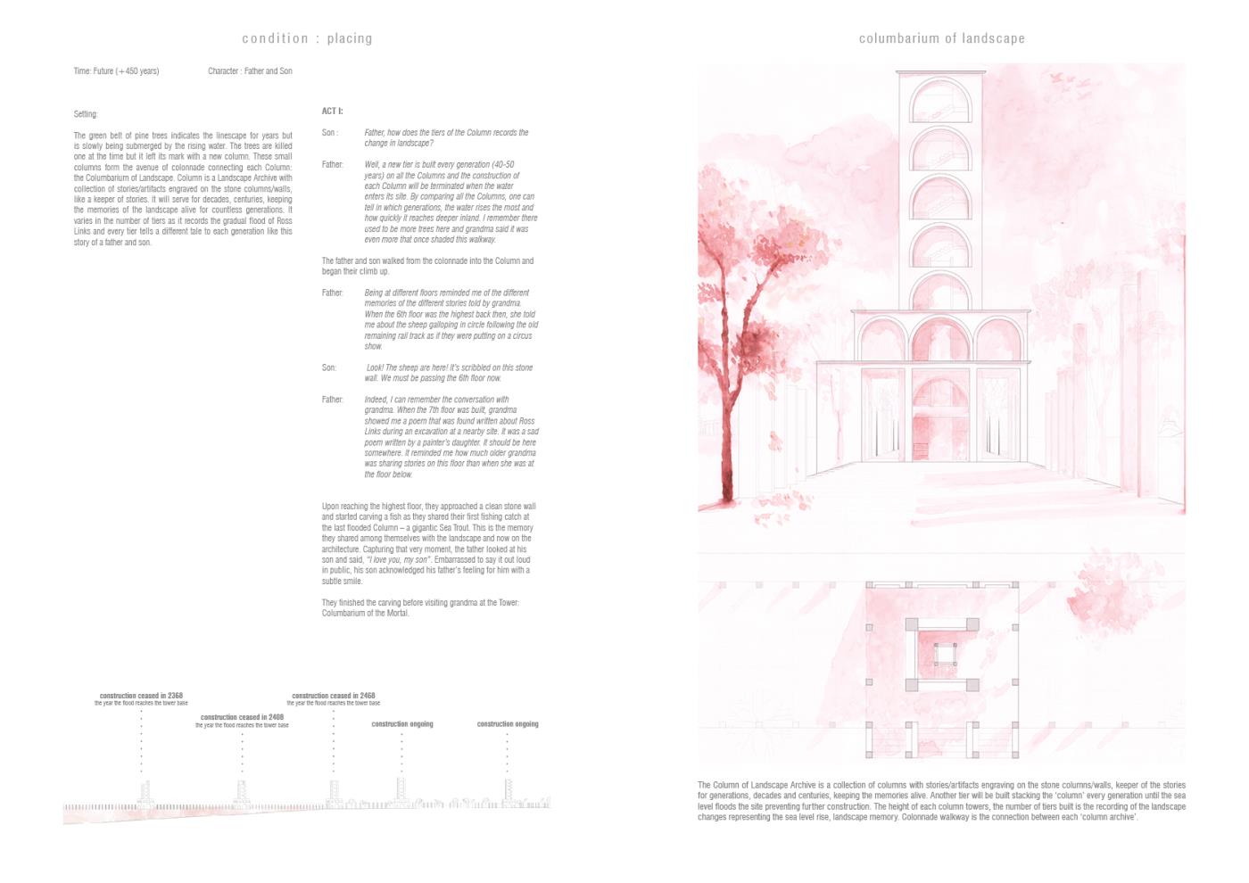 The [IN]existent Lines: Collective Memories of Ross Links through Acts of Remembrance Part 2 Project 2019 Lee Xin Lau Northumbria University Newcastle | UK Linescape - this thesis started by finding the lines of the landscape in Ross Links. These lines are visible but not easily conceivable. These implicit lines manifest itself in the rhythm and pattern of the nature. It exists as a marker to some, embodying memories, telling stories, or even as the identity of the place. The linescape is never constant as the landscape itself changes with time; where in this context is 500 years into the future. One of the prominent lines identified is the landform. This line is projected as the linescape forming the edge condition of Ross Links in 500 years. The thesis is to challenge this edge condition and allowing the surrounding significant lines to inform the architecture which in return, commemorate these lines to prolong the sense of presence of the landscape and its identity to the people. ‘Collective Memories of Ross Links’ is a proposal to preserve the lines of the landscape through acts of remembrance, creating new dimension of progressive experience in a temporal timeframe. A narrative expressing the occupation of the spaces is carefully crafted to hold the poetics and lingering emotions of the landscape through its architecture. Tutor(s) Lesley McIntyre Stephen Roberts